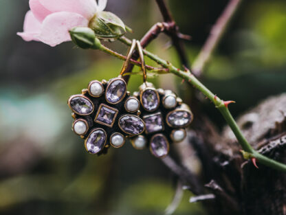 Los pendientes Owen están hechos en plata dorada con amatista y perlas de agua dulce. Son una reproducción de una joya de la época de El Renacimiento. Aportan mucha luz gracias a las piedras naturales y tienen un tamaño perfecto para convertirse en tus nuevos pendientes de diario.