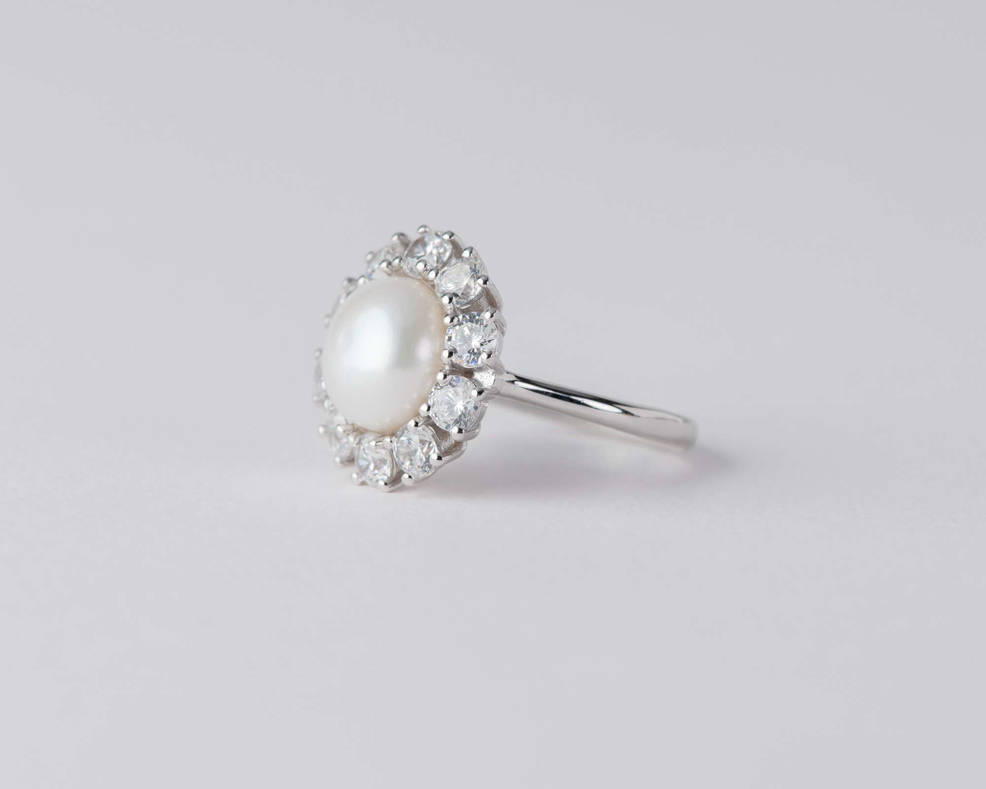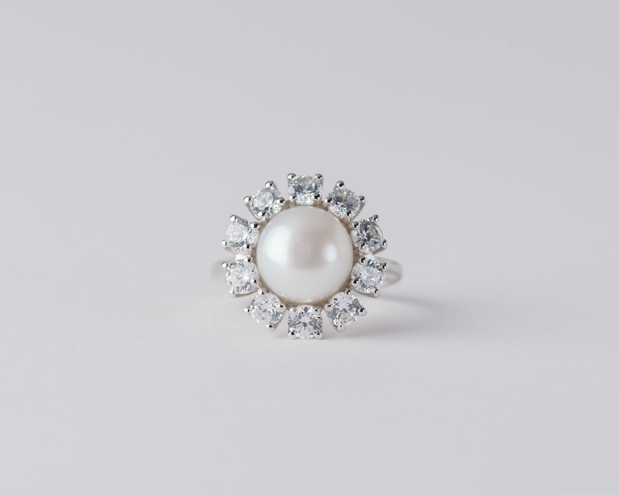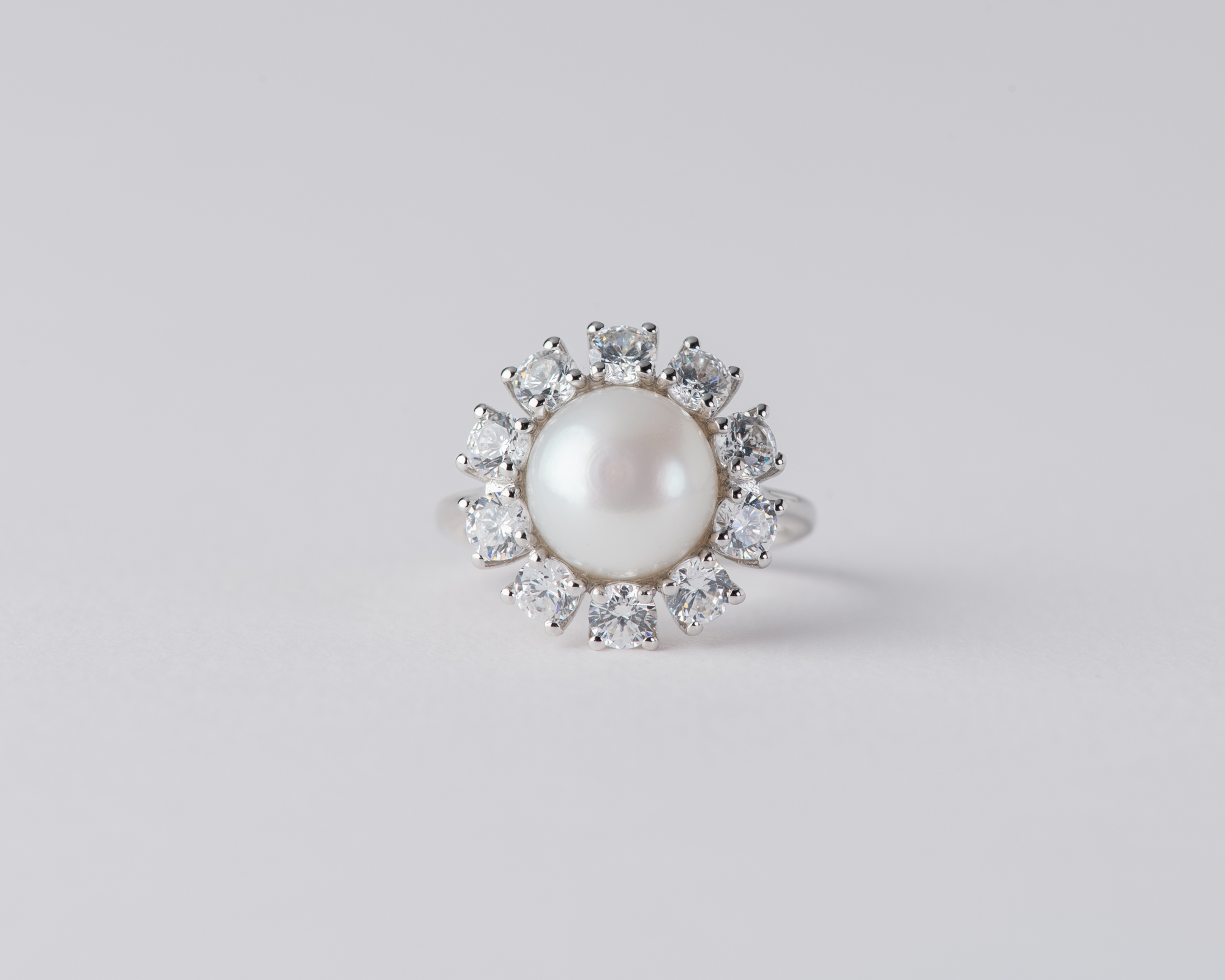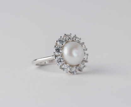Este delicado anillo, elaborado en plata, captura la esencia de la joyería clásica con una refinada composición central: una perla de agua dulce, suave y luminosa, rodeada por un resplandor de circonitas blancas engastadas con precisión. Cada piedra ha sido cuidadosamente seleccionada por su pureza y brillo, creando un efecto radiante que abraza la perla como un halo de luz.