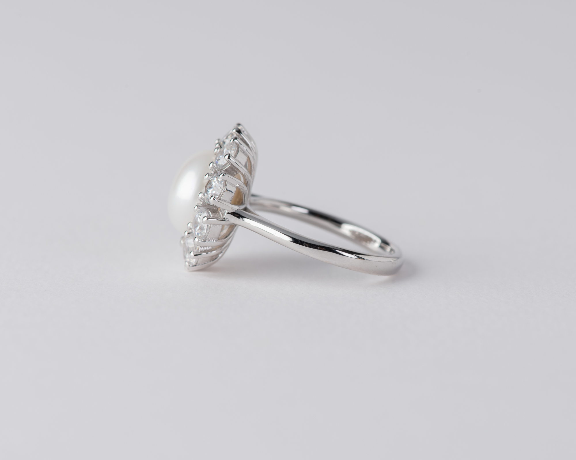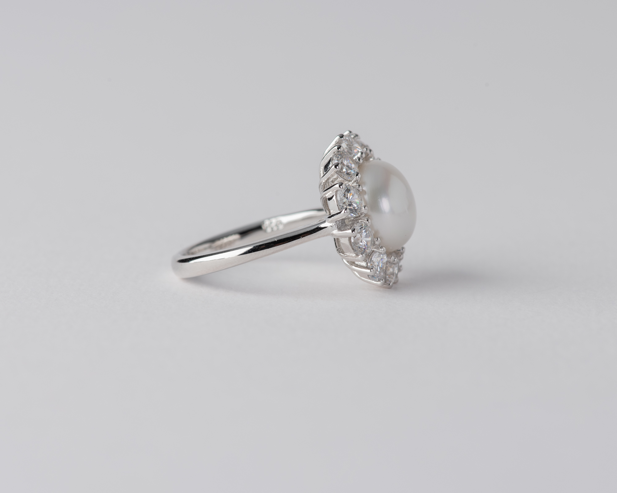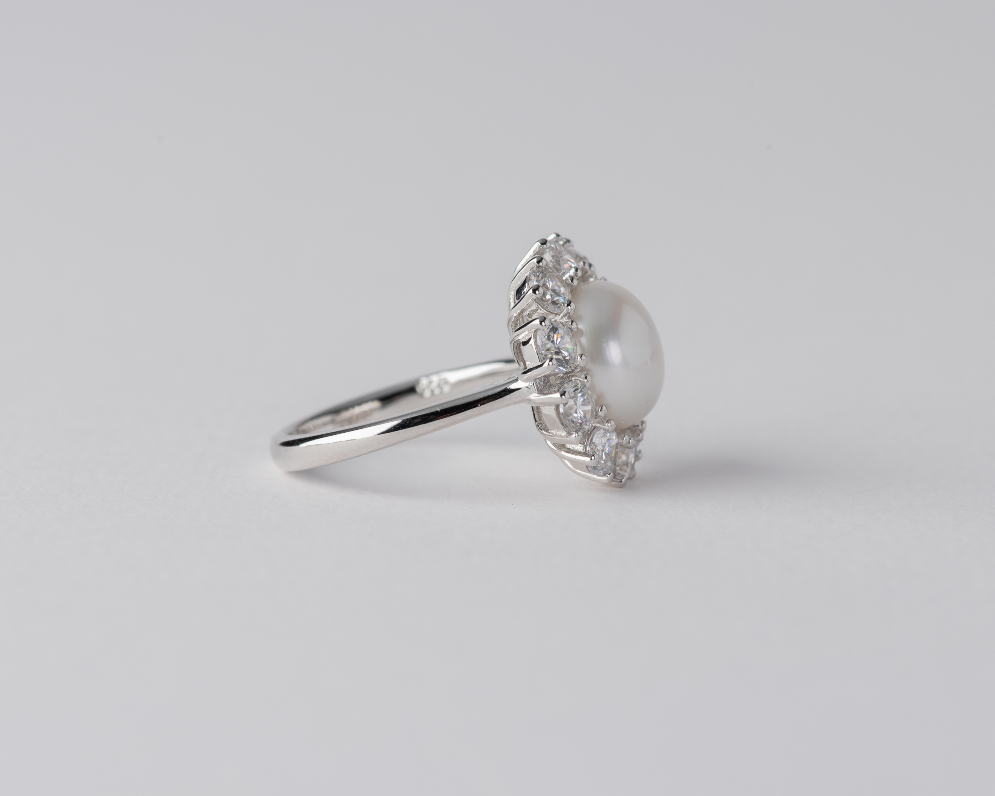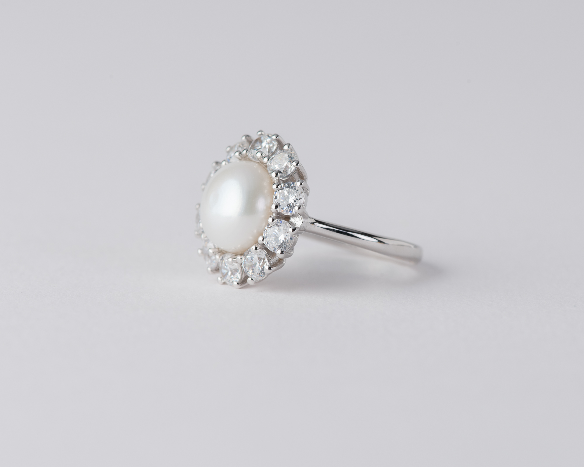 Este delicado anillo, elaborado en plata, captura la esencia de la joyería clásica con una refinada composición central: una perla de agua dulce, suave y luminosa, rodeada por un resplandor de circonitas blancas engastadas con precisión. Cada piedra ha sido cuidadosamente seleccionada por su pureza y brillo, creando un efecto radiante que abraza la perla como un halo de luz.