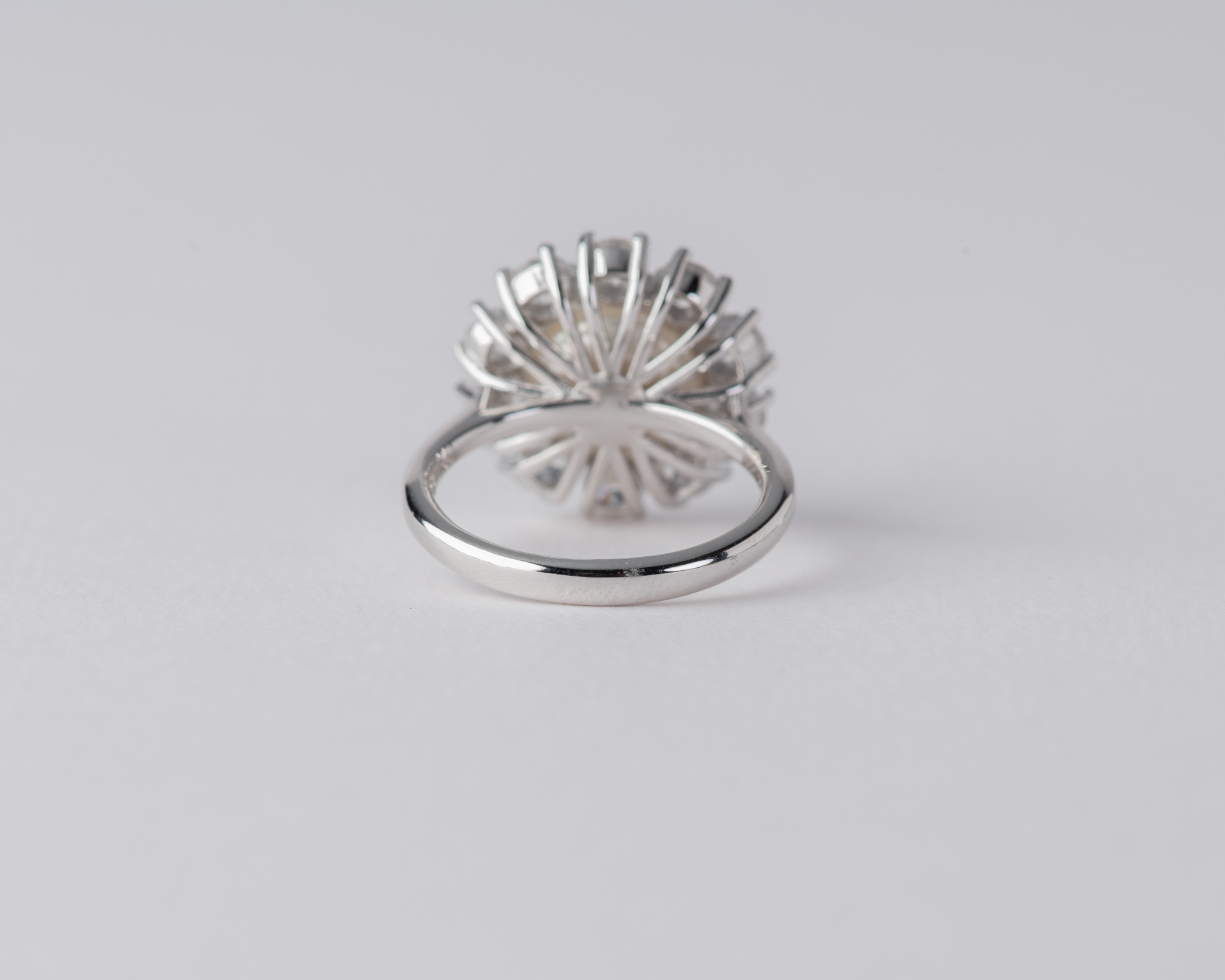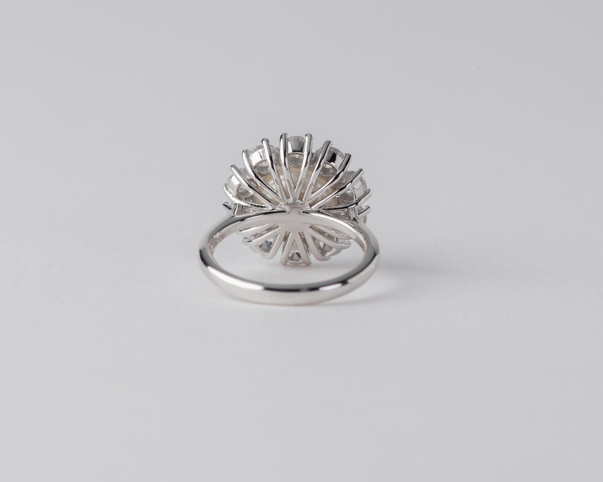 Inspirado en los diseños de la alta joyería de los años 50, este anillo evoca el romanticismo sereno y la sofisticación de épocas pasadas. Ideal para lucir en conjunto con los pendientes a juego o como pieza única en un estilismo elegante, aporta una nota de distinción tanto en ocasiones especiales como en el día a día.
