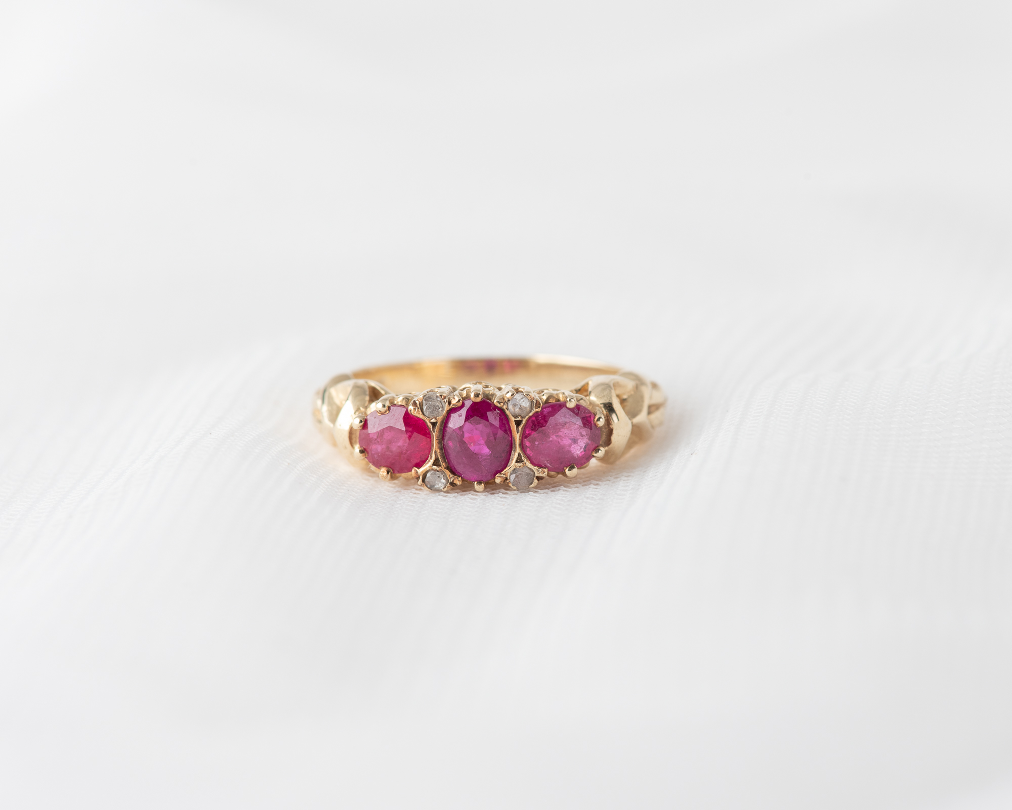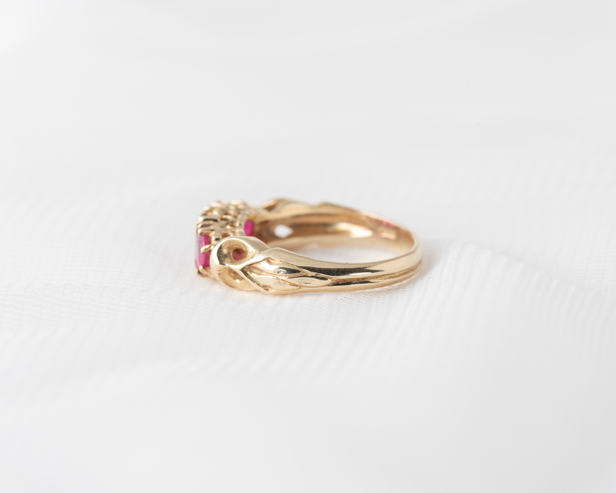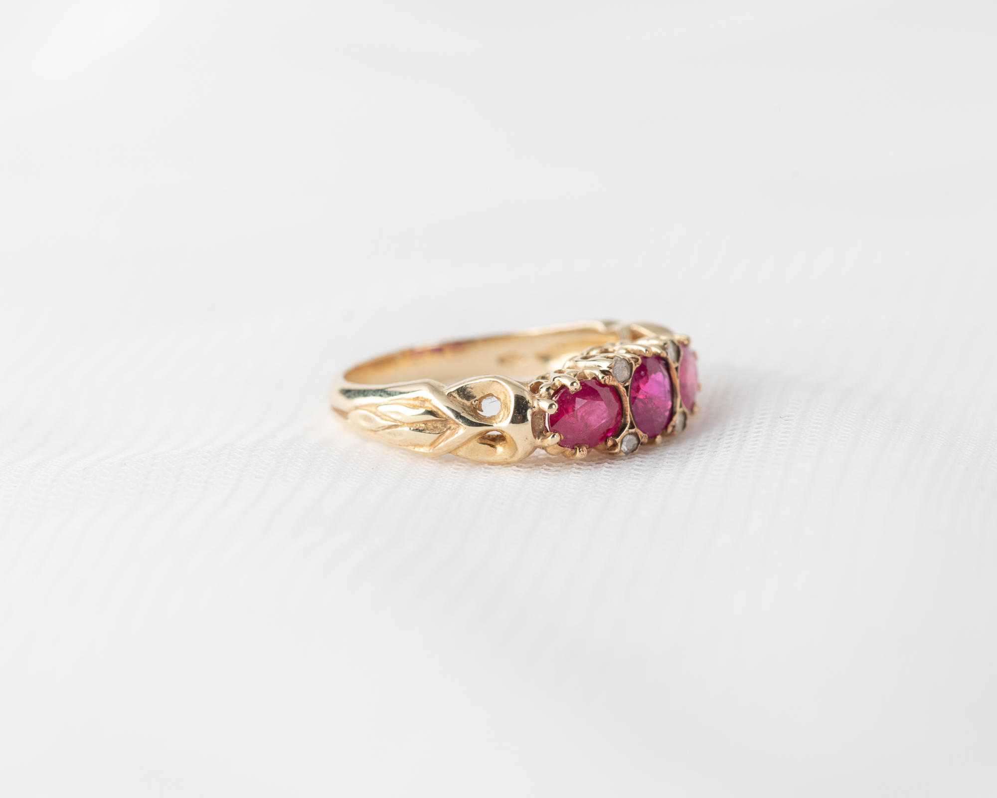 Este anillo, réplica inspirada en las joyas de los años 20, está realizado en oro amarillo de 14 quilates, con tres rubíes engastados en plata y acompañado por 4 diamantes redondos talla rosa, con un peso total de 0,05 ct. Con un peso bruto de 3,90 g, esta pieza fusiona la calidez del oro con la brillantez de los diamantes y la intensidad de los rubíes, evocando la elegancia y el glamour de la época Art Déco. La estructura en oro garantiza calidad y durabilidad, mientras que la plata realza el brillo de los diamantes, ofreciendo un fondo luminoso ideal para destacarlos.