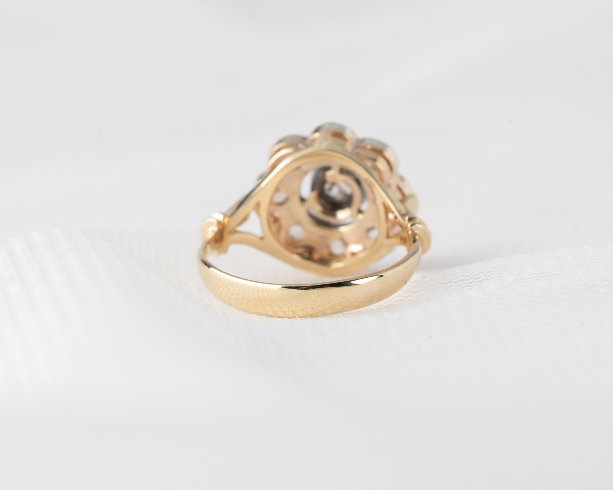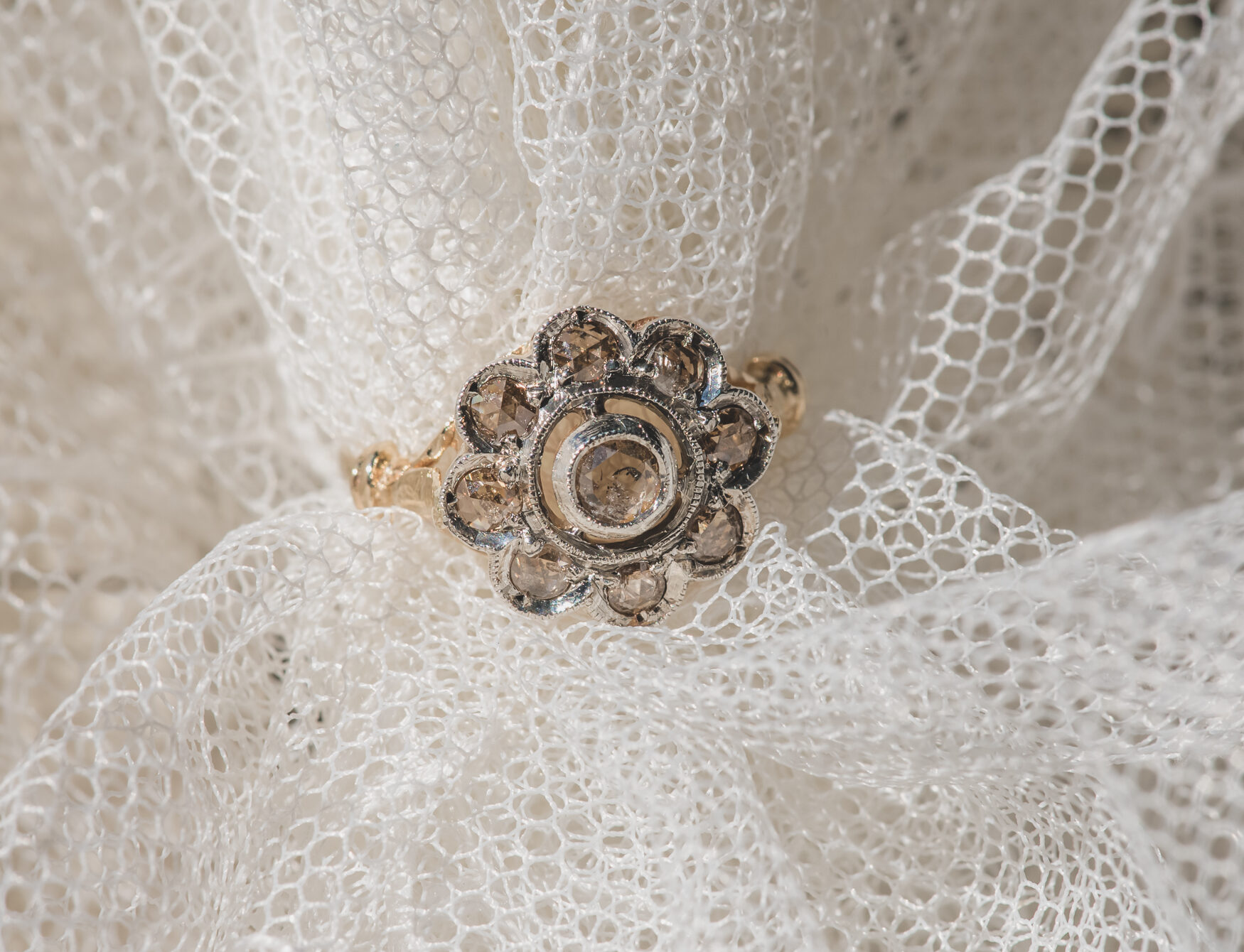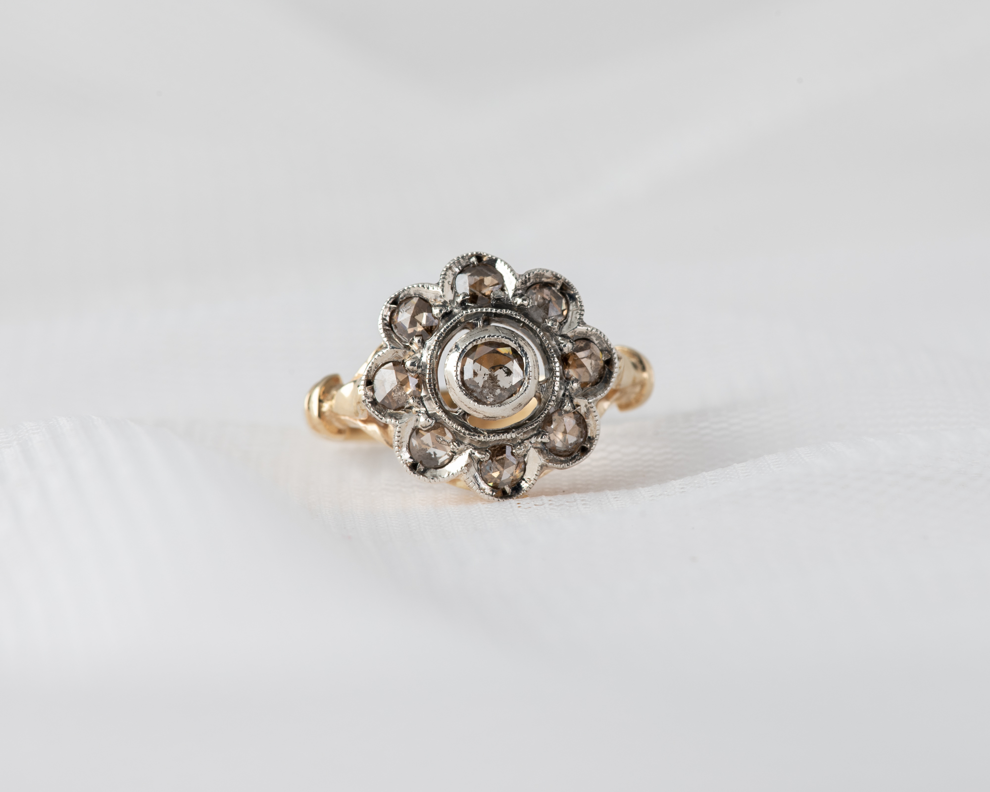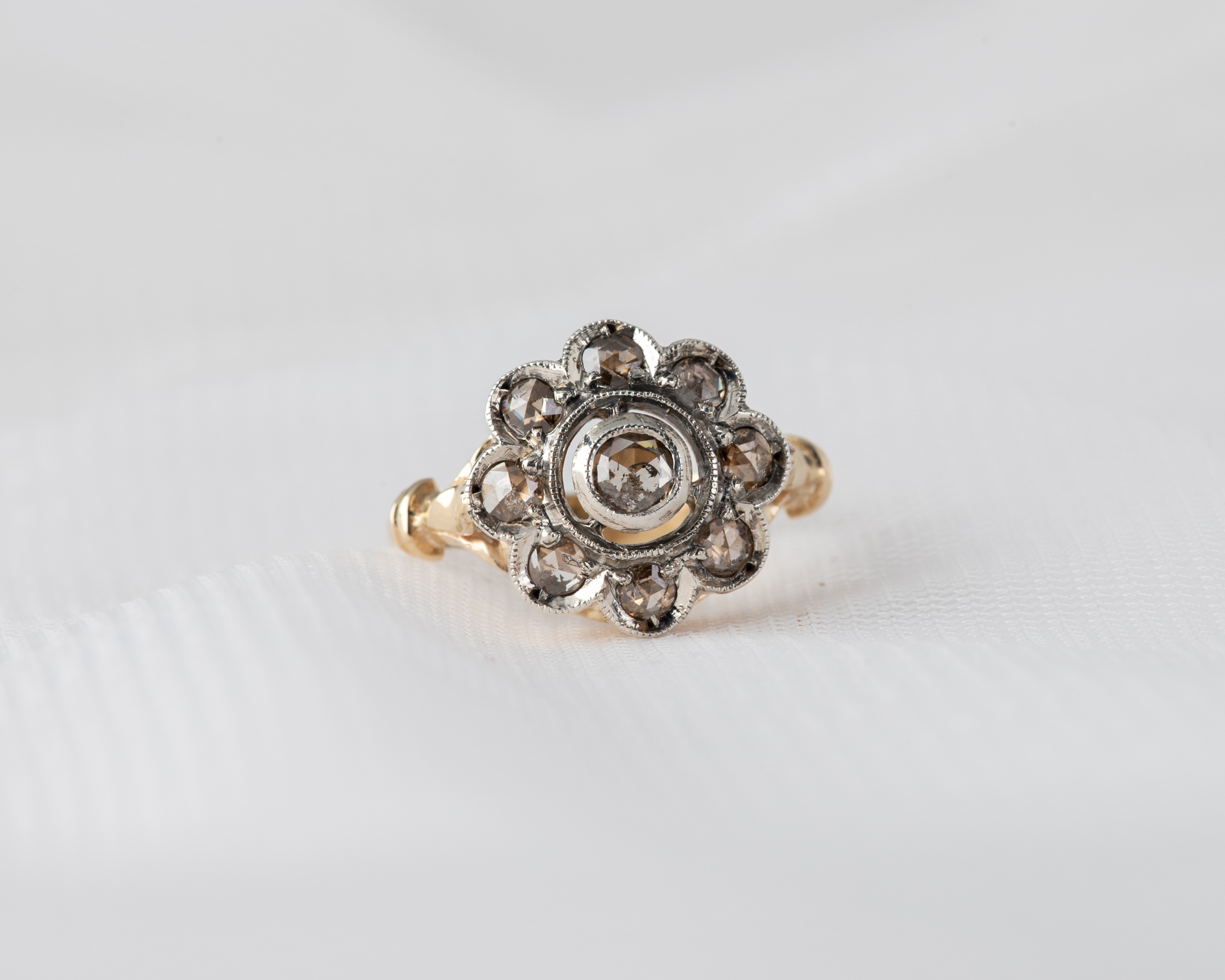 Este anillo, inspirado en la delicadeza de una flor, está realizado en oro amarillo de 14 quilates y presenta nueve diamantes engastados en plata, con un peso bruto de 4,50 g. Su diseño floral simboliza la belleza y la armonía, fusionando la calidez del oro con la elegancia de los diamantes y la luminosidad de la plata. La estructura en oro amarillo garantiza calidad y durabilidad, mientras que la plata realza el brillo de los diamantes, ofreciendo un fondo luminoso ideal para realzarlos.