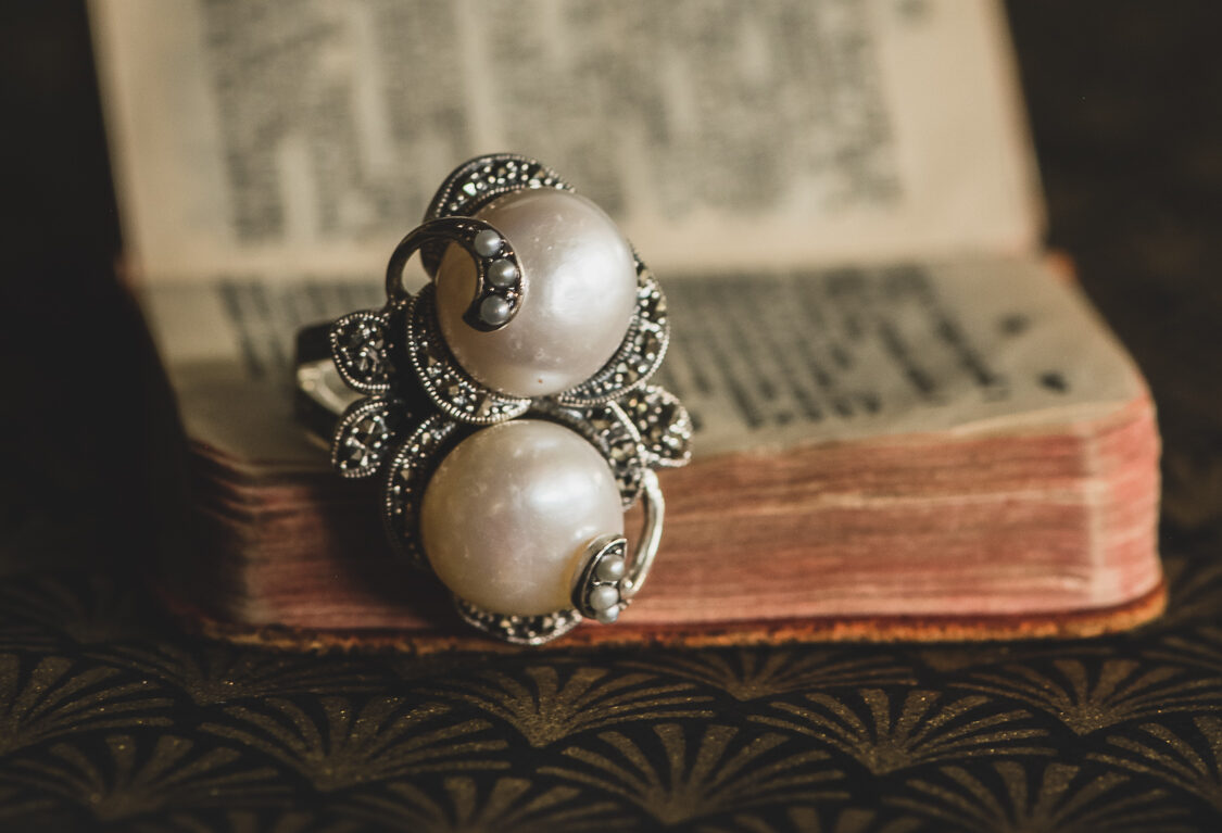 Anillo realizado a mano en plata con marcasitas y dos perlas de agua dulce.