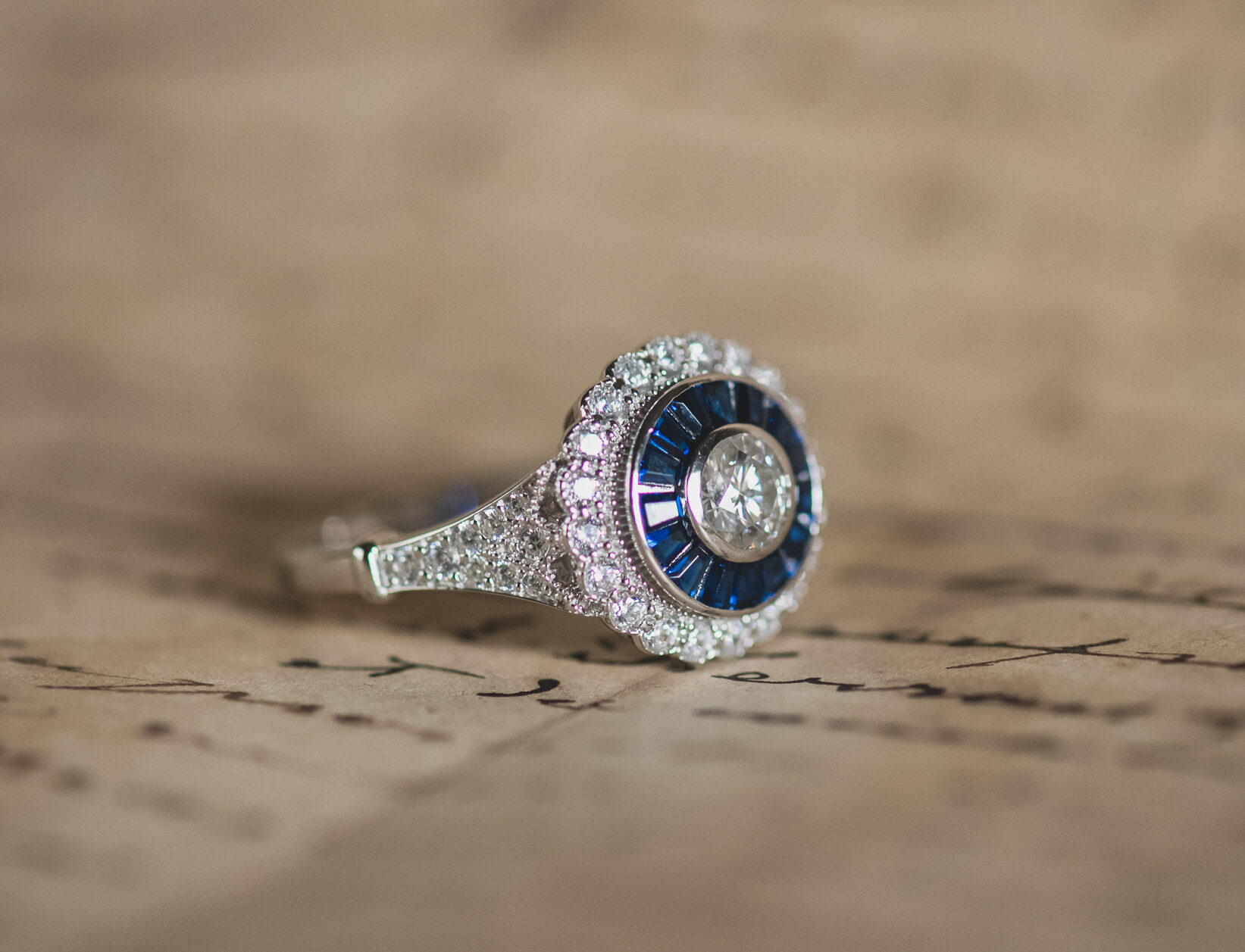 Este delicado anillo, de diseño «ojo de perdiz», ha sido cuidadosamente elaborado en plata, siguiendo la tradición de la joyería clásica europea. En su centro, una moissanita de 3 mm despliega un brillo sutil y sofisticado, rodeada por un halo de circonitas azules que multiplican su luz con un efecto hipnótico. Su forma redonda y simétrica evoca los anillos de compromiso de época, símbolos de elegancia discreta y belleza perdurable.