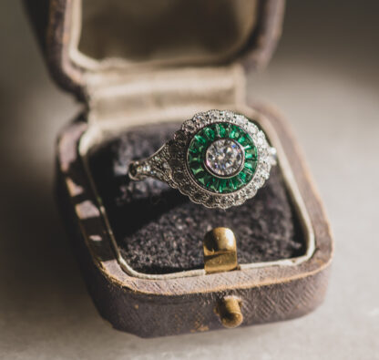Este delicado anillo, de diseño «ojo de perdiz», ha sido cuidadosamente elaborado en plata, siguiendo la tradición de la joyería clásica europea. En su centro, una moissanita de 3 mm despliega un brillo sutil y sofisticado, rodeada por un halo de circonitas verdes que multiplican su luz con un efecto hipnótico. Su forma redonda y simétrica evoca los anillos de compromiso de época, símbolos de elegancia discreta y belleza perdurable.