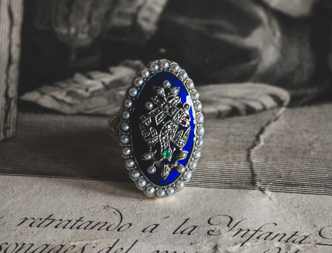 Anillo de plata y esmalte azul con esmerladas y perlas de agua dulce.