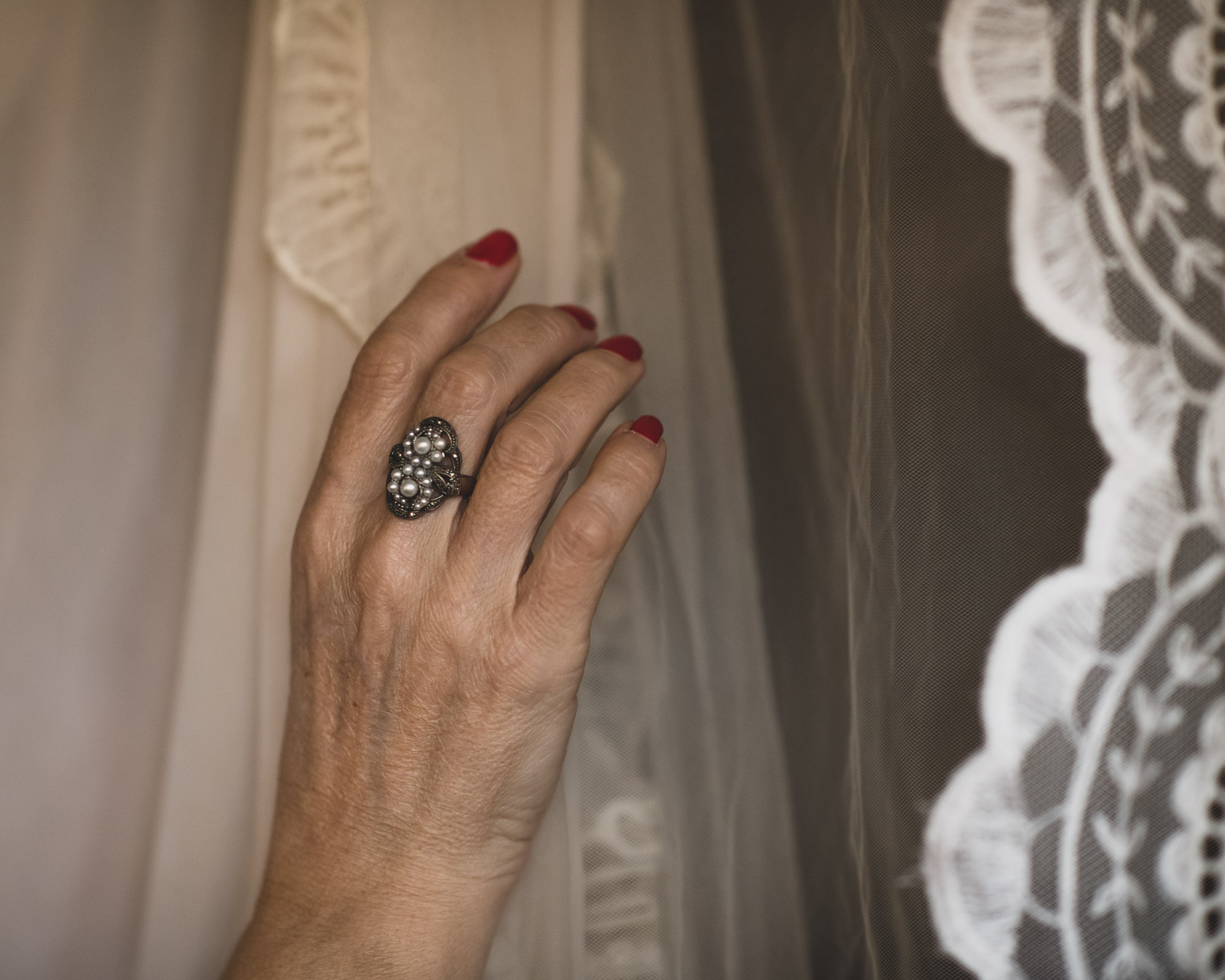 Anillo de plata, perlas de agua dulce y marcasitas.