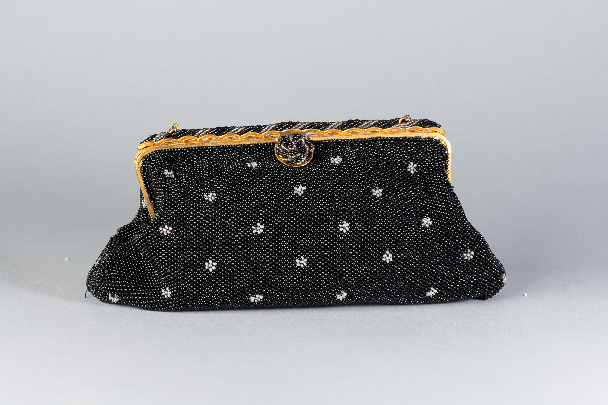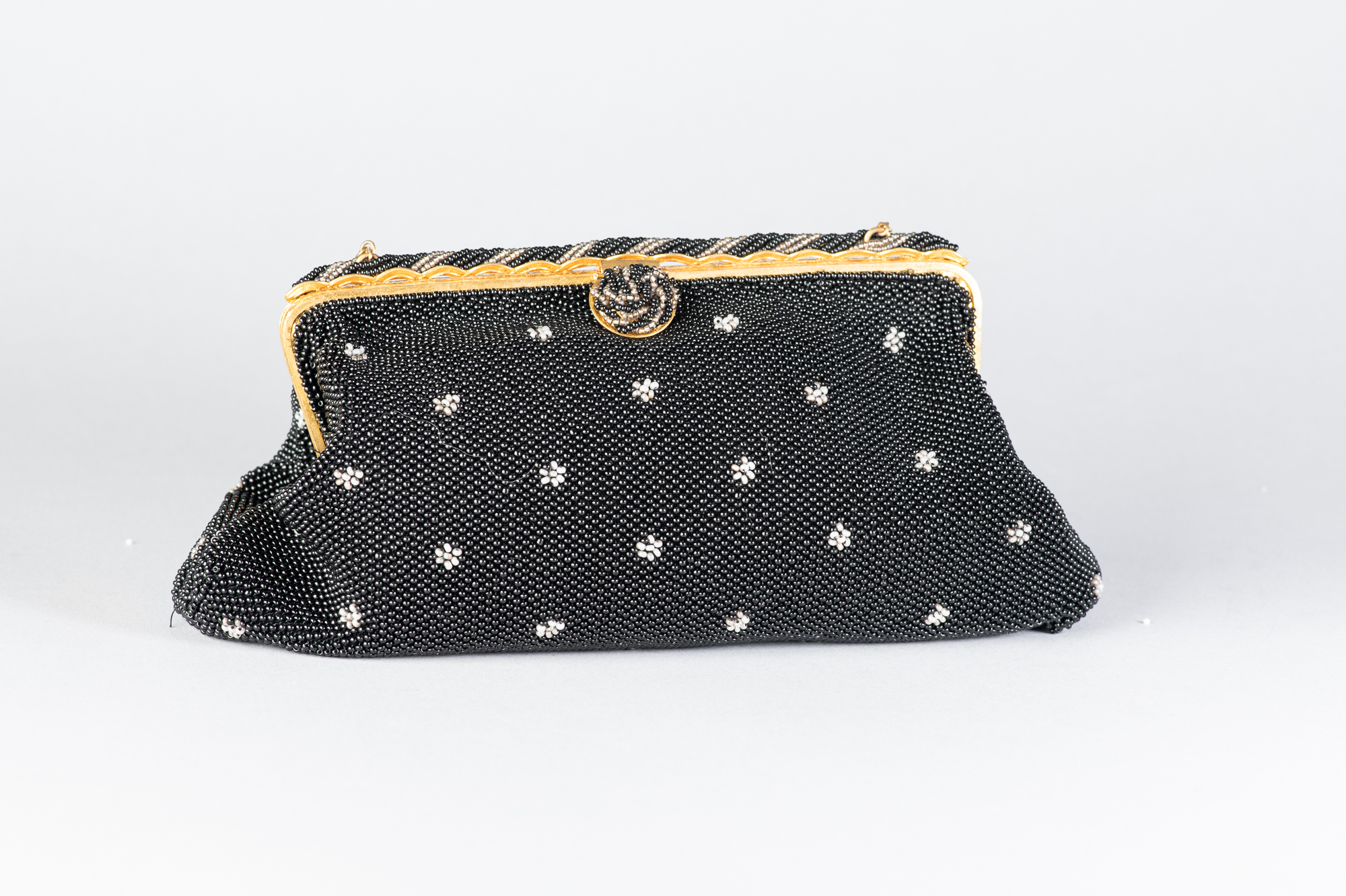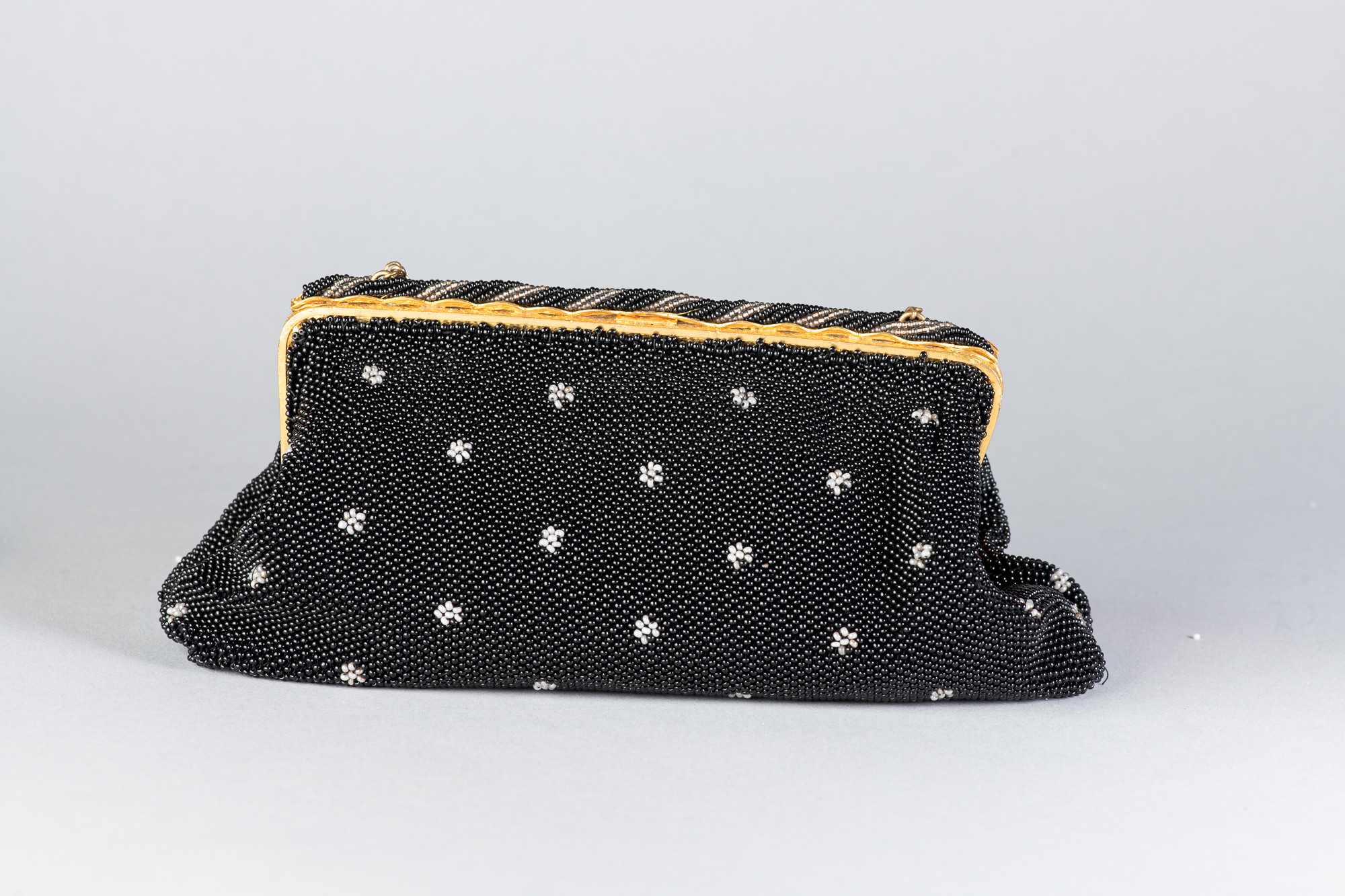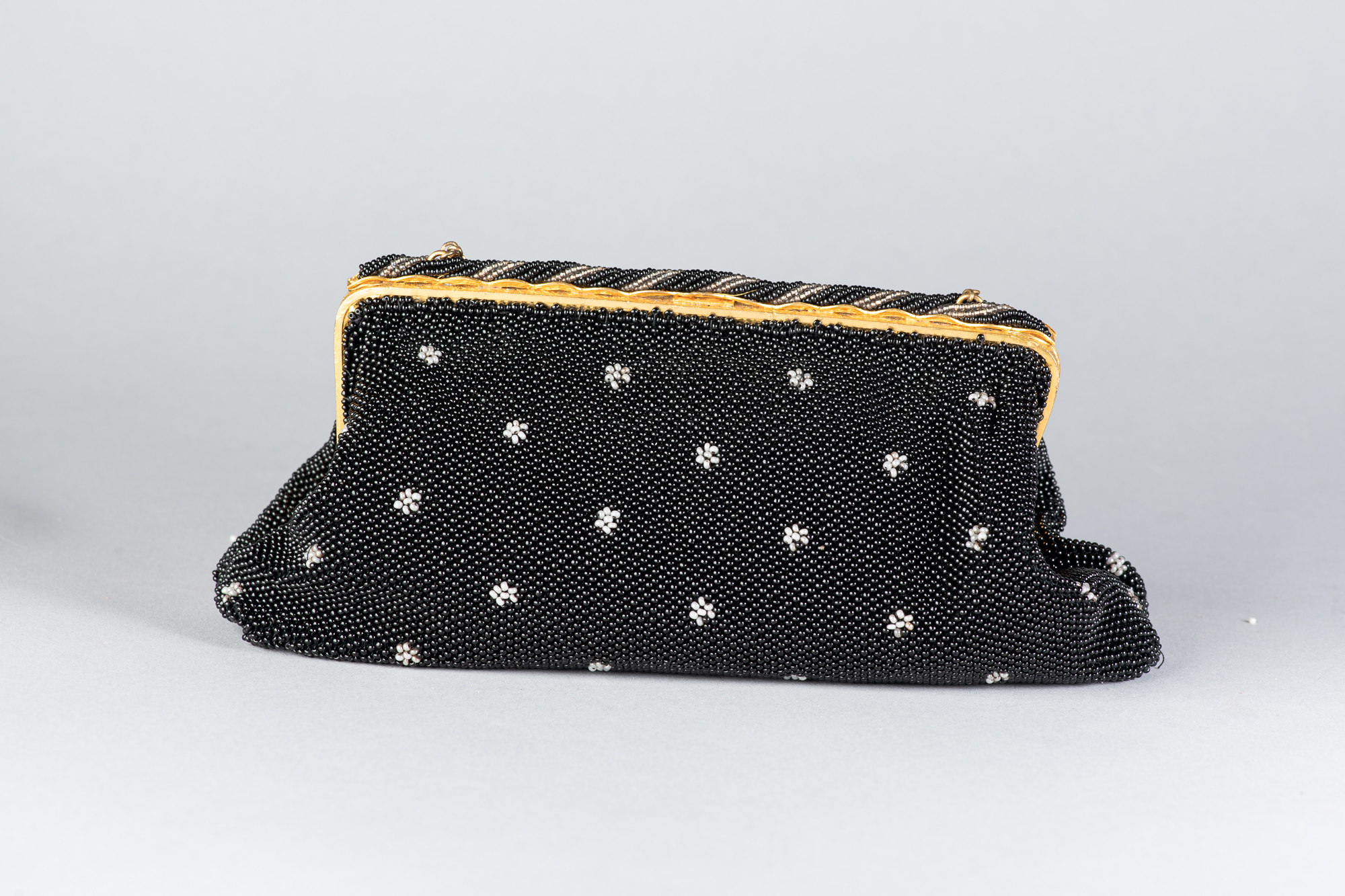 Bolso antiguo realizado con microcuentas de cristal negras con adornos florales blancos. Original de la época de los años 30.