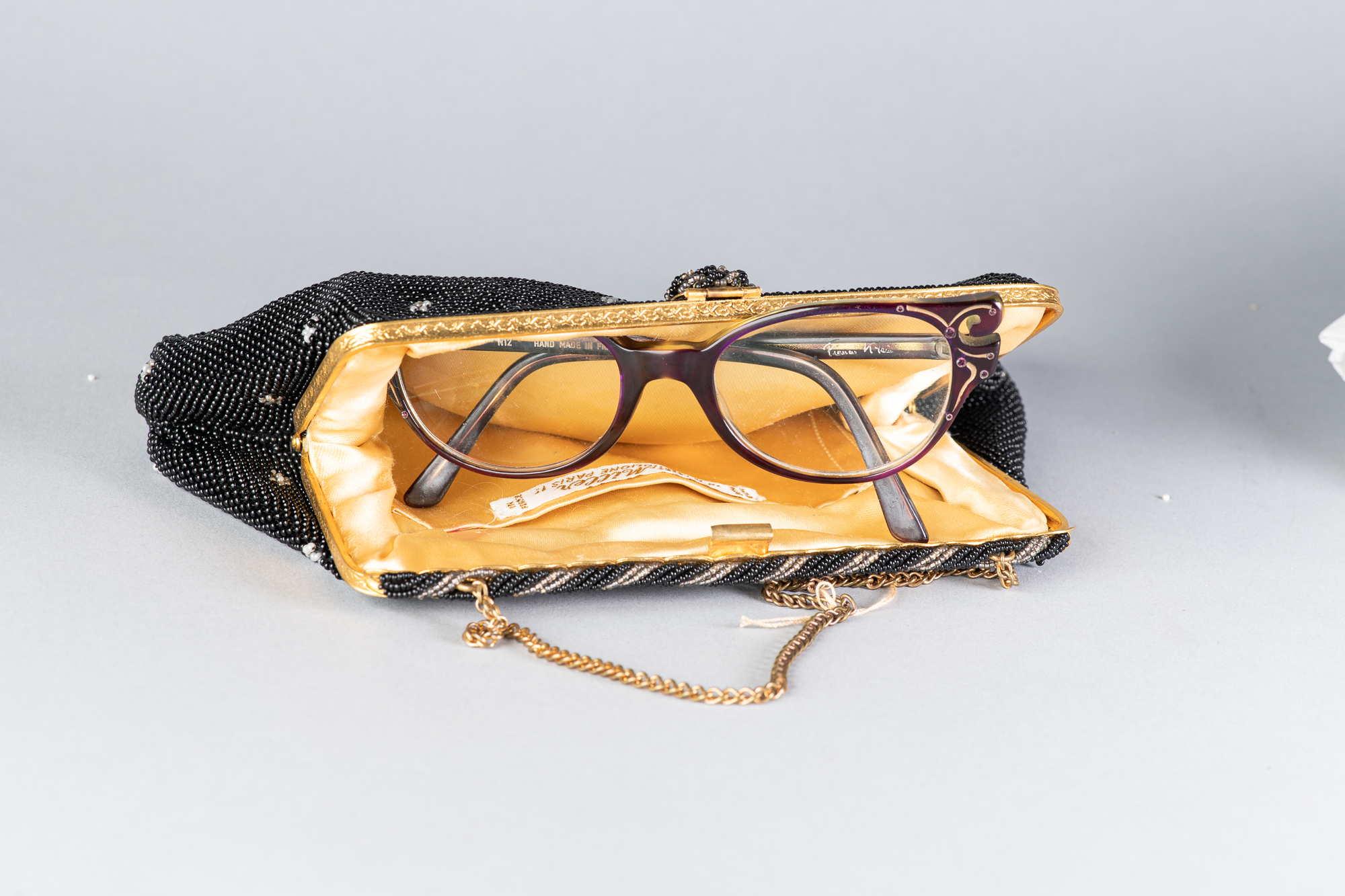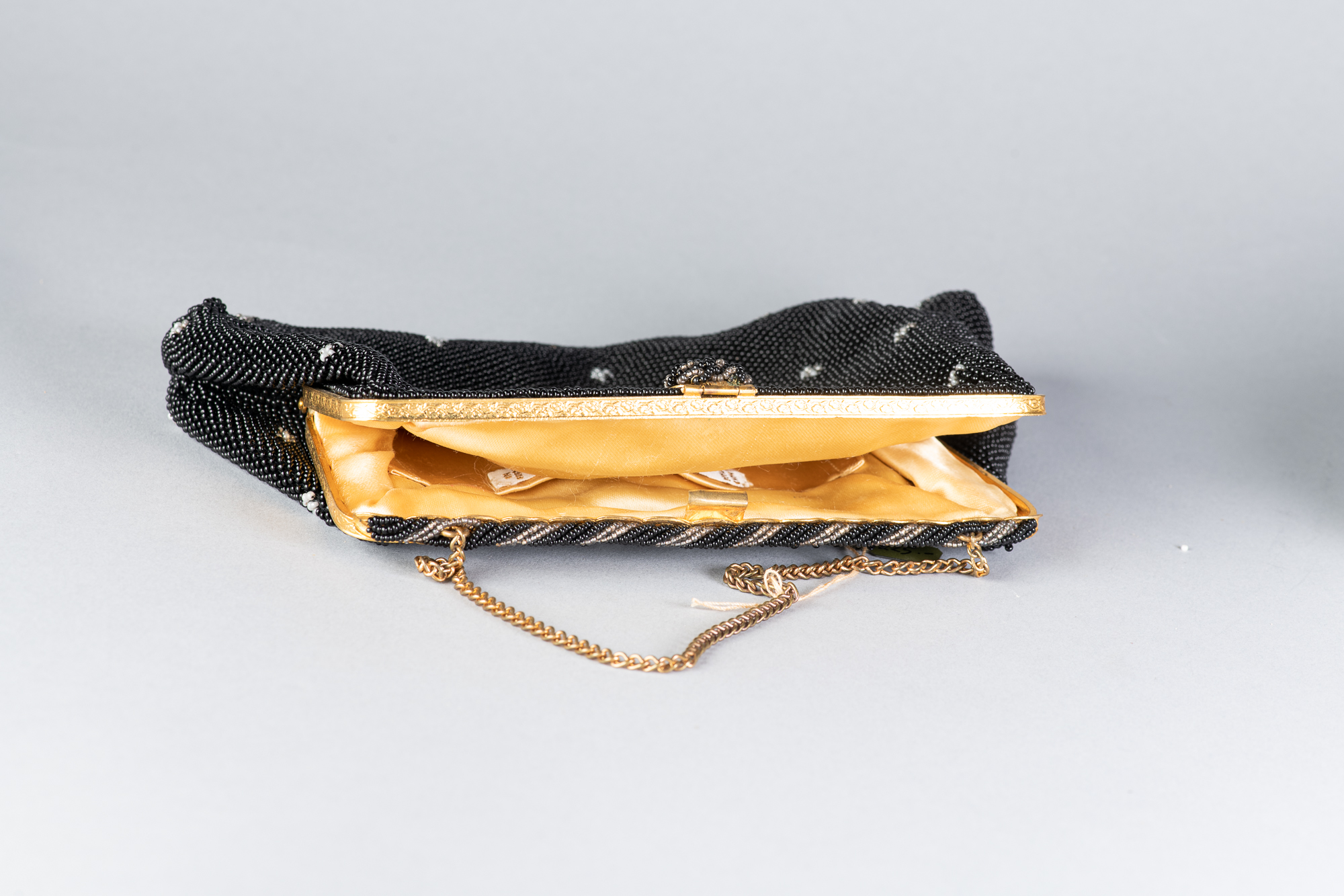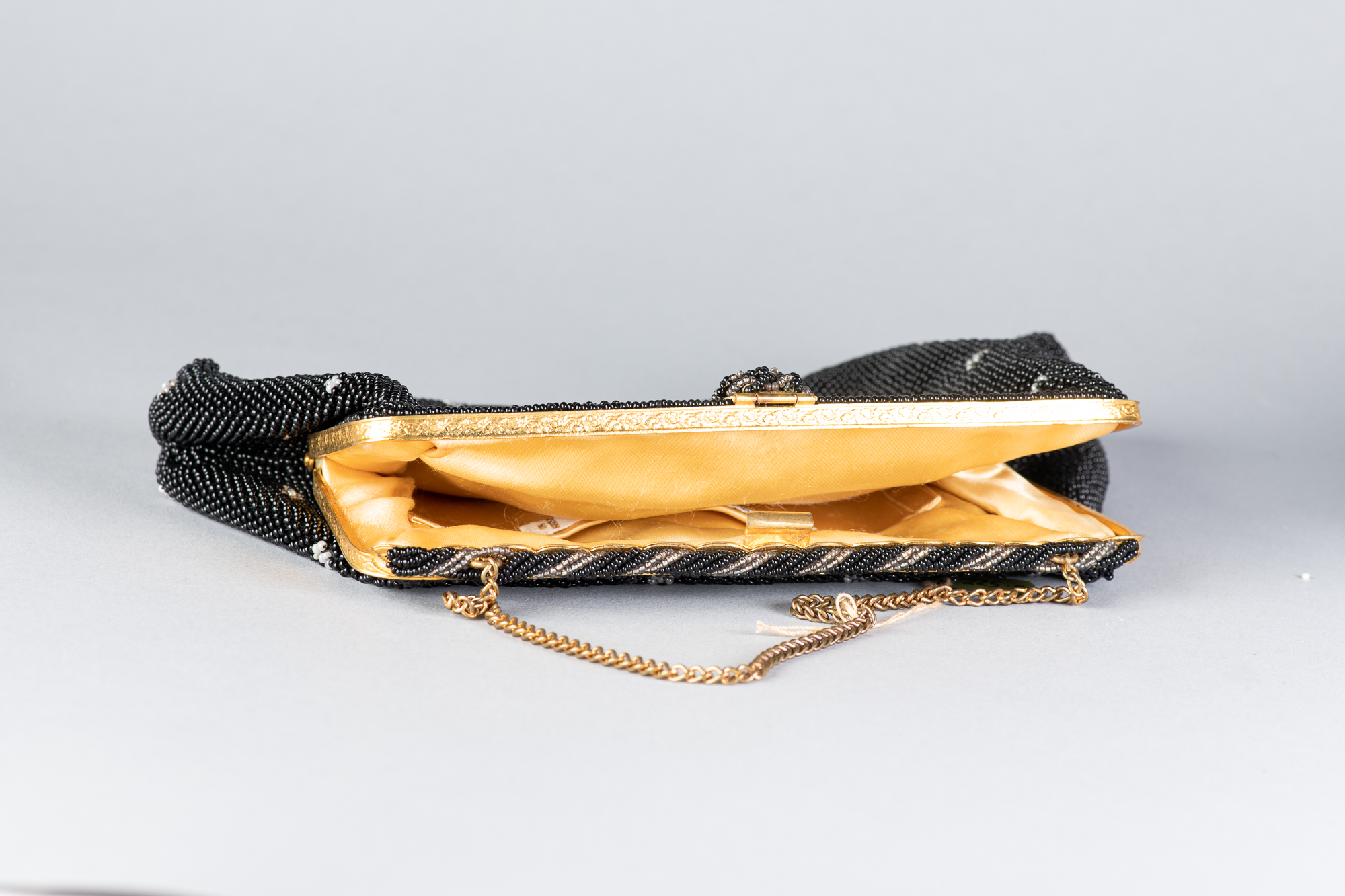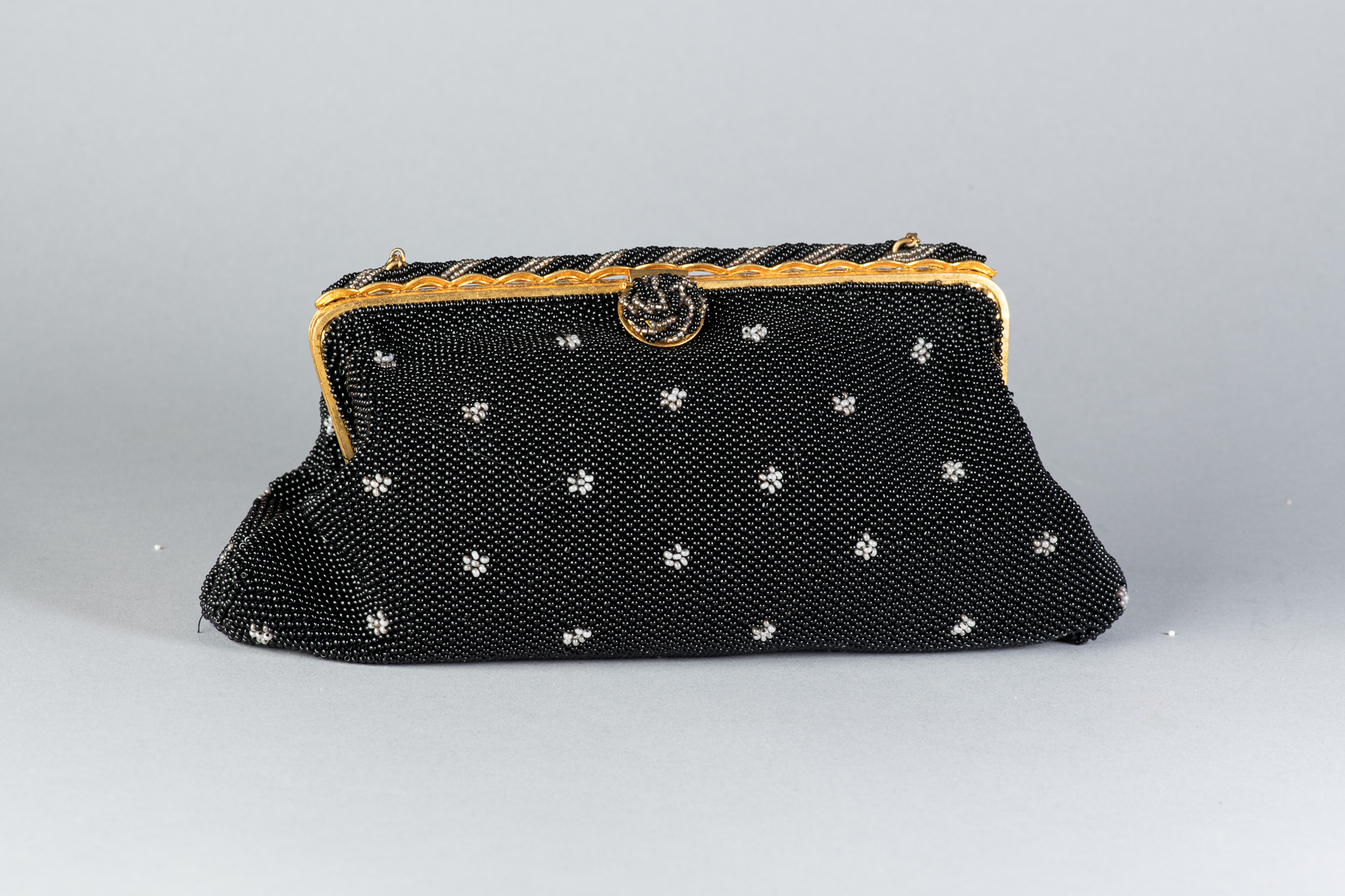 Bolso antiguo realizado con microcuentas de cristal negras con adornos florales blancos. Original de la época de los años 30.