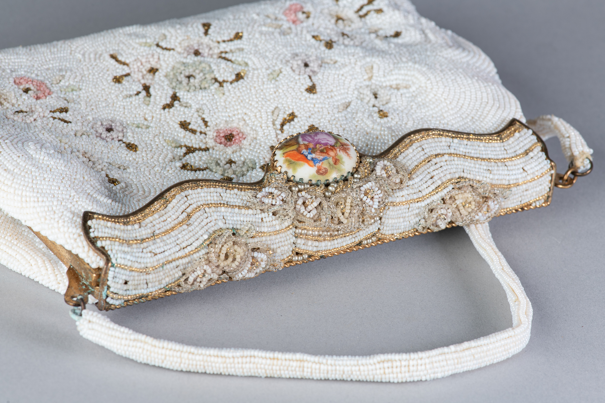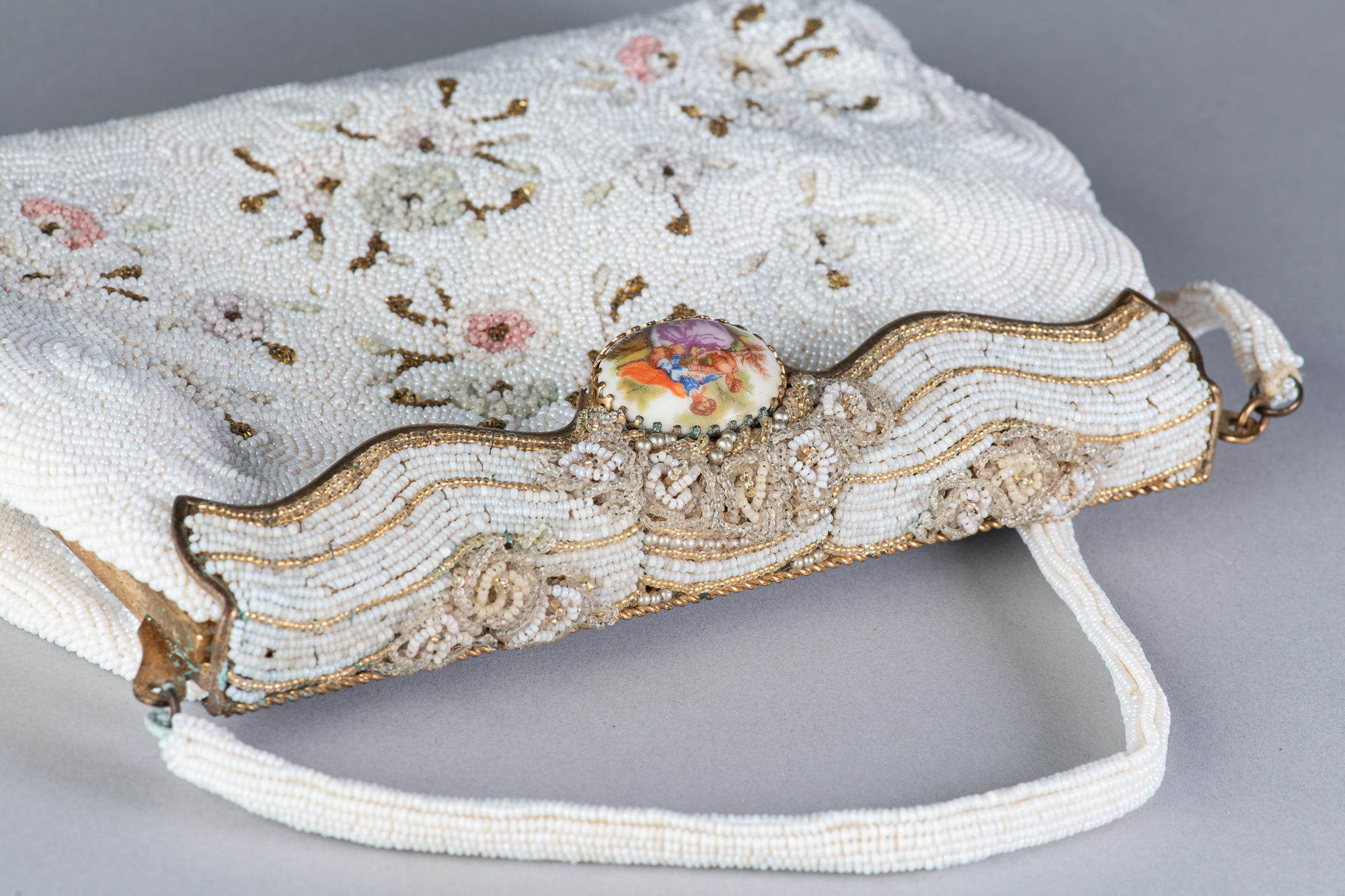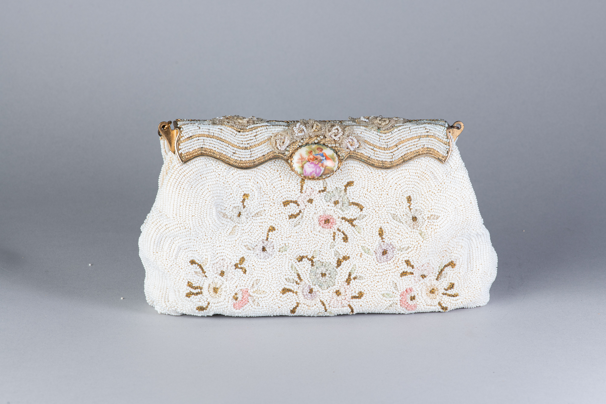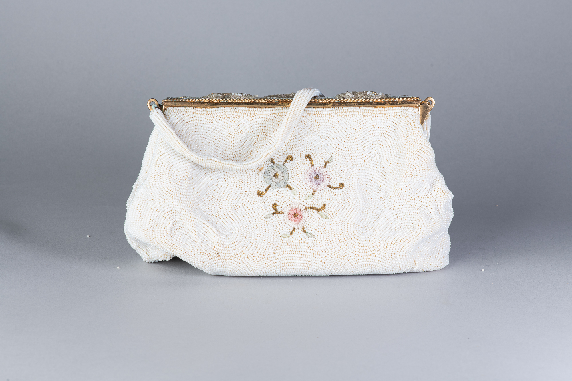 Bolso antiguo con microcuentas de cristal en tono blanco con adornos florales en tonos rosados. Pieza única original de la época de los años 40.
