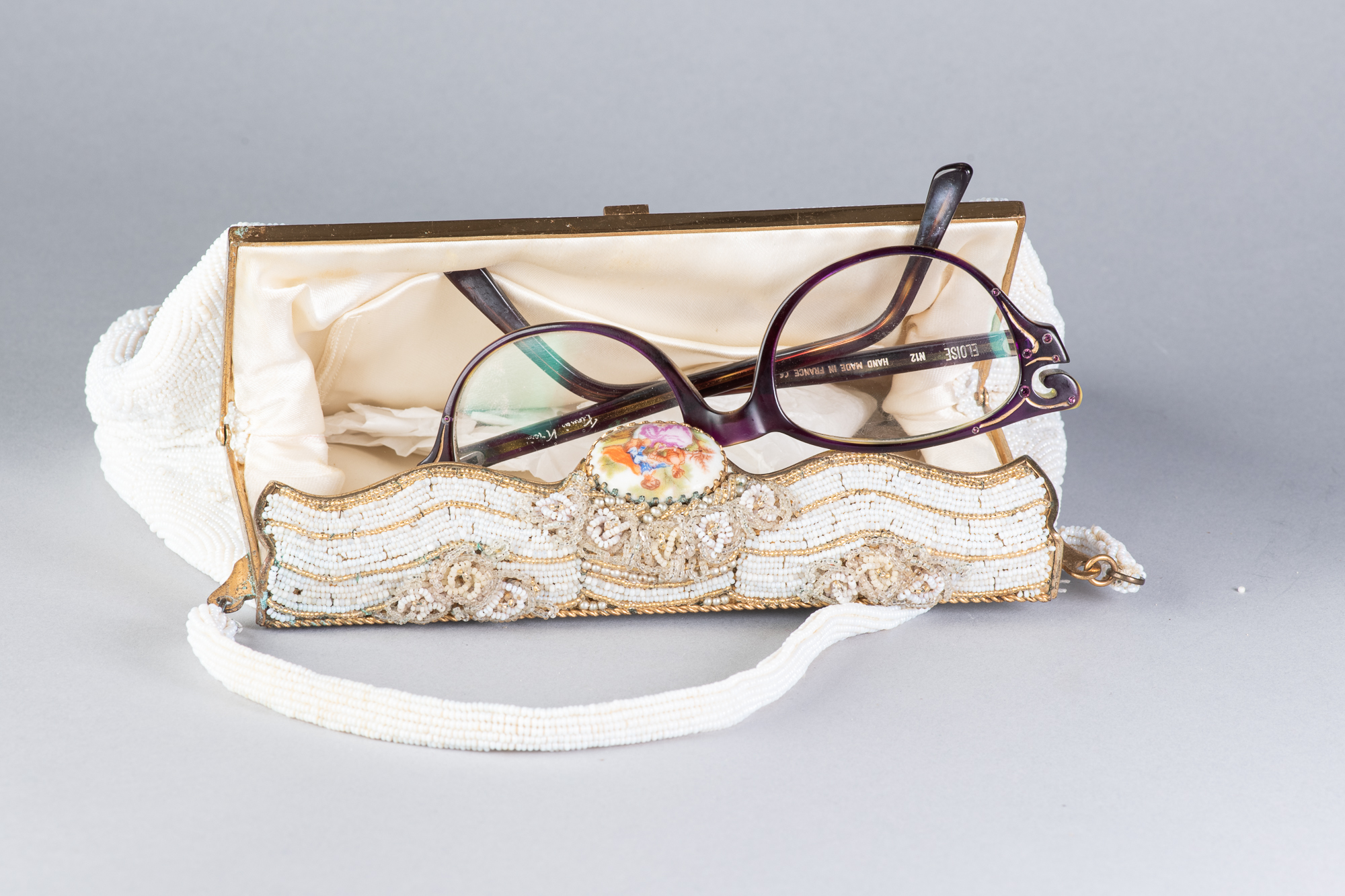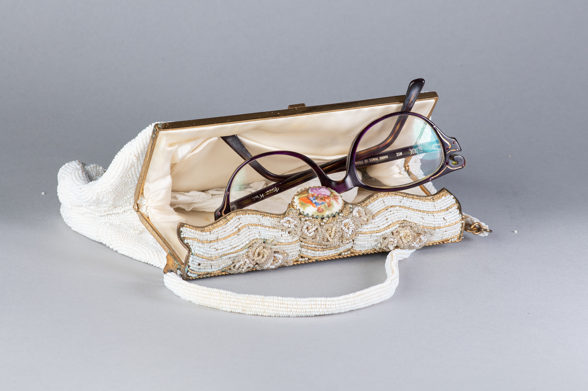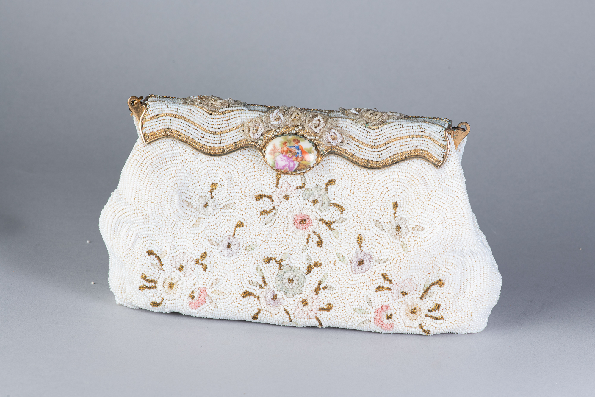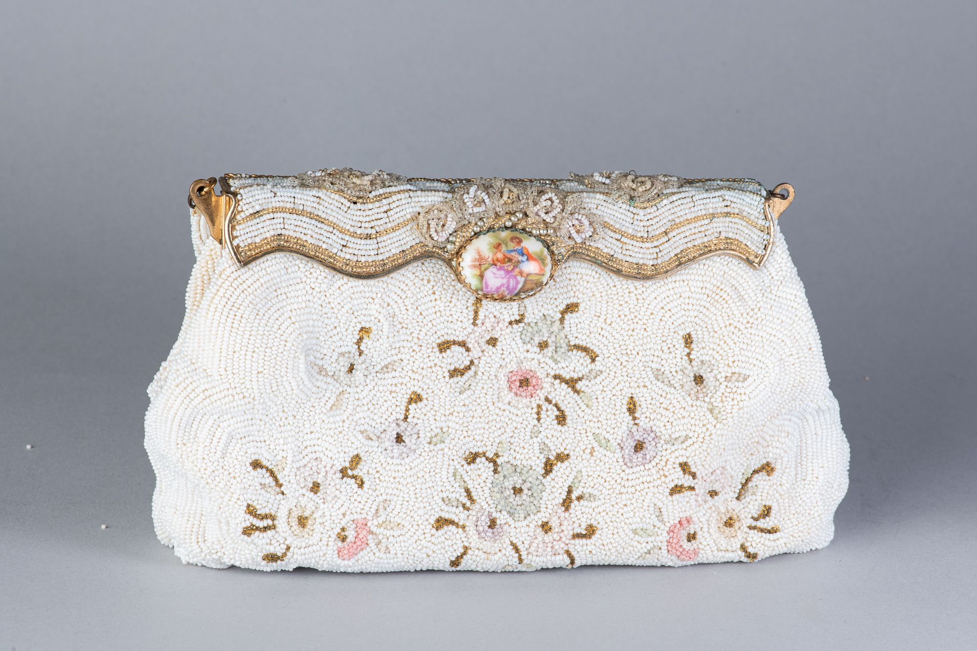Bolso antiguo con microcuentas de cristal en tono blanco con adornos florales en tonos rosados. Pieza única original de la época de los años 40.