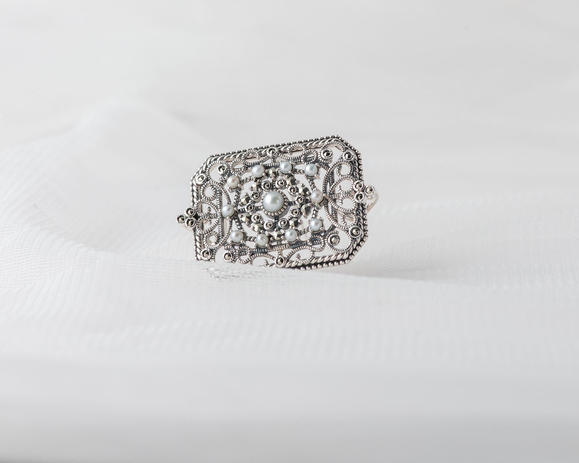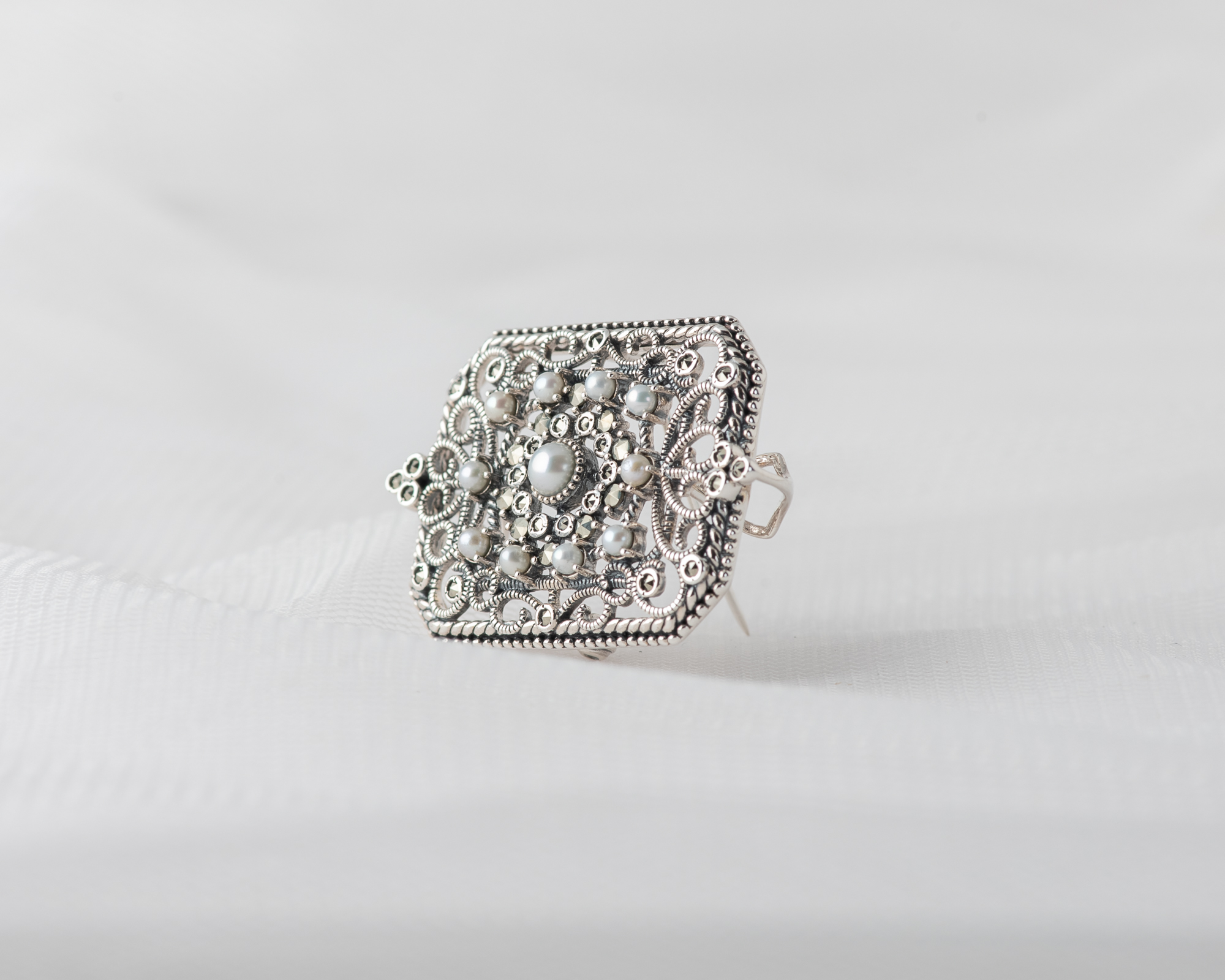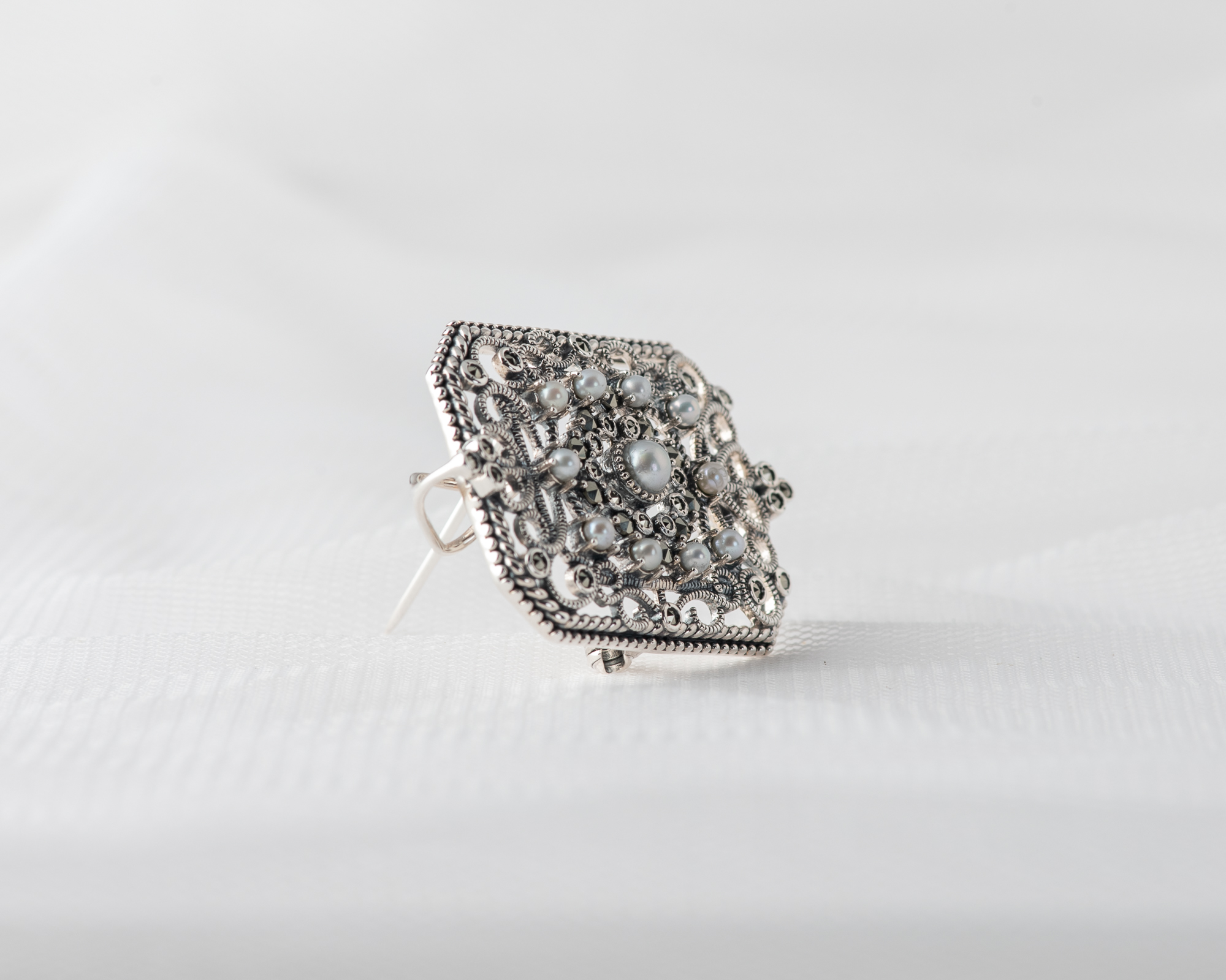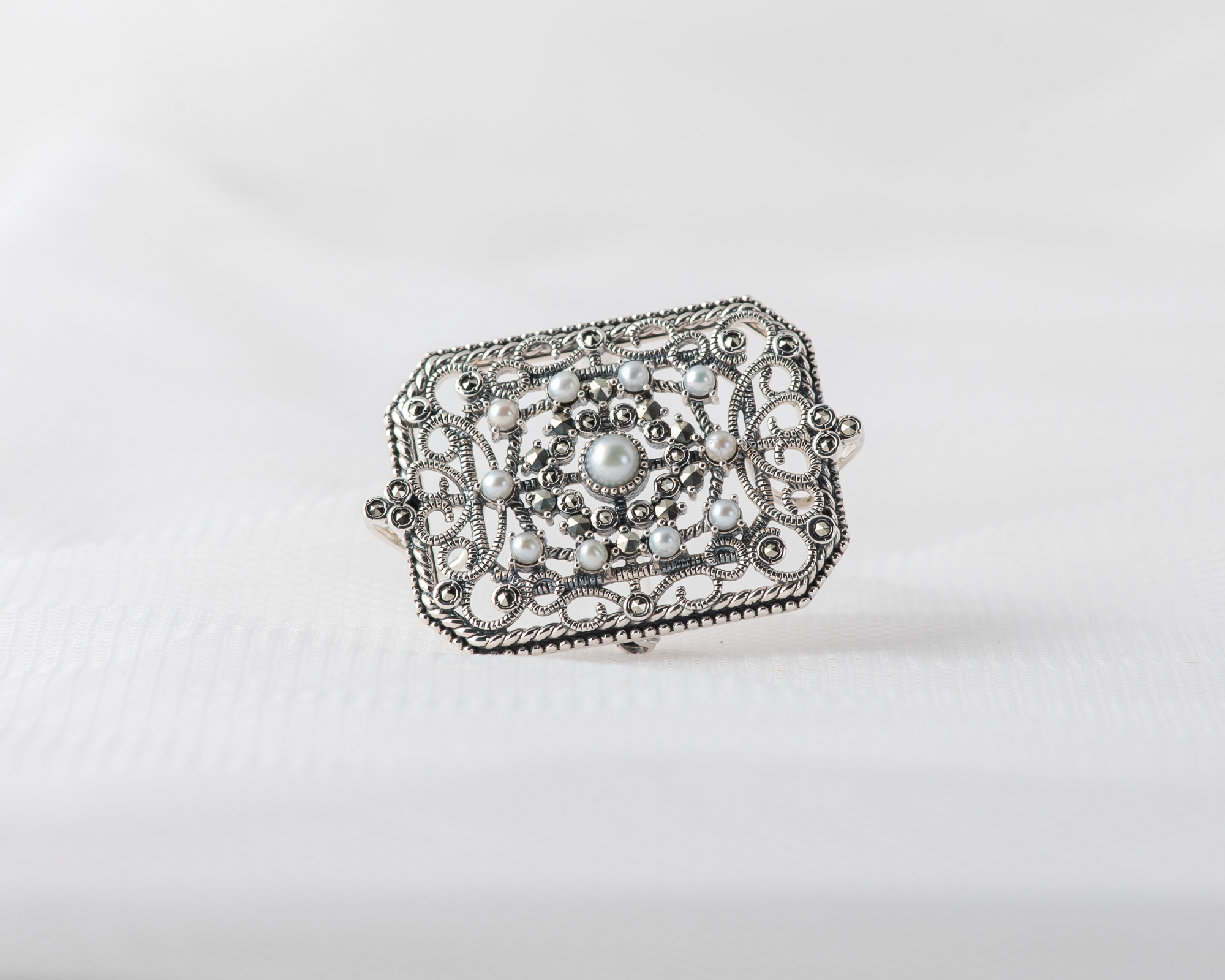 Este delicado broche-colgante en plata de ley fusiona el brillo suave de las perlas de agua dulce con el destello atemporal de las marcasitas, creando una pieza de inspiración vintage. Su diseño ingenioso permite llevarlo como broche, gracias al cierre con pasador seguro, o como colgante, usando las sutiles anillas traseras. Ideal para realzar cualquier look con cadena fina o cinta de terciopelo a modo chocker, es una joya versátil y con mucho carácter.