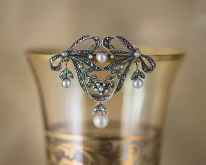Este delicado broche, realizado a mano en plata, es una joya de inspiración clásica que combina el brillo antiguo de las marcasitas con la suavidad luminosa de las perlas de agua dulce. Cada detalle ha sido cuidadosamente trabajado para dar forma a una pieza elegante y atemporal, perfecta para realzar cualquier prenda con un toque de distinción.