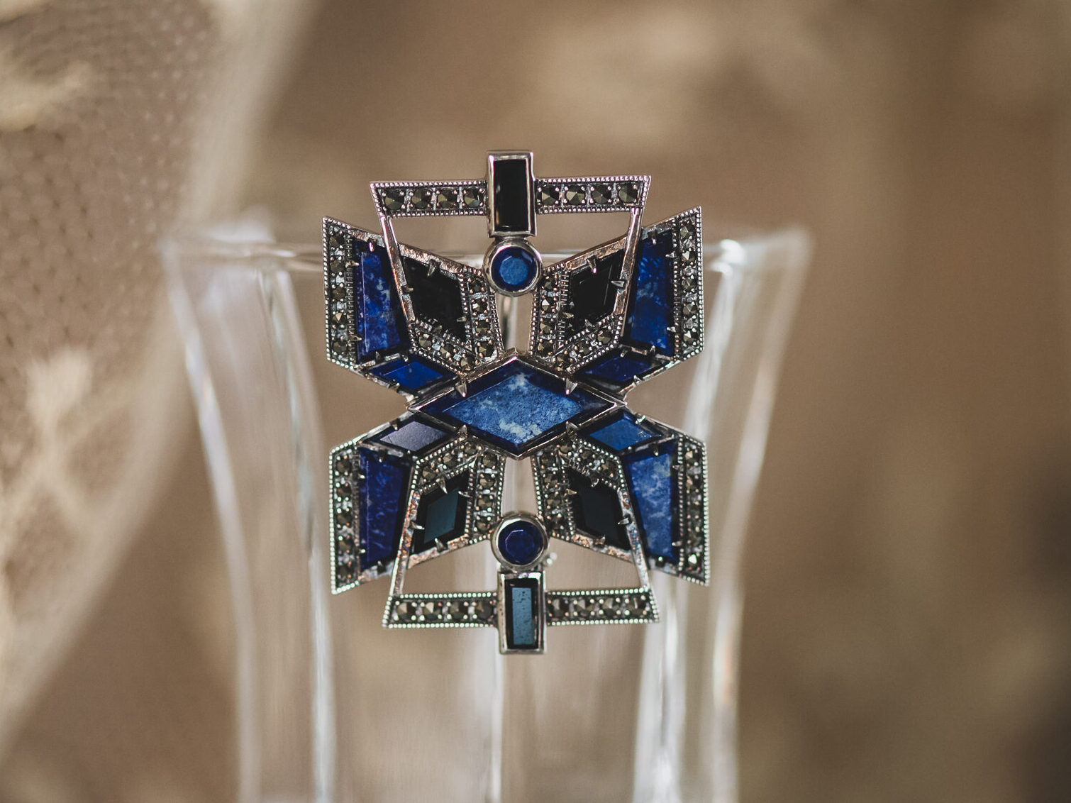 Broche realizado a mano en plata y marcasitas con ónix y lapislázuli.
