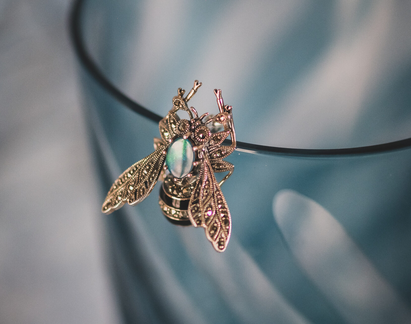 Broche realizado a mano en plata con marcasitas y doblete de ópalo.