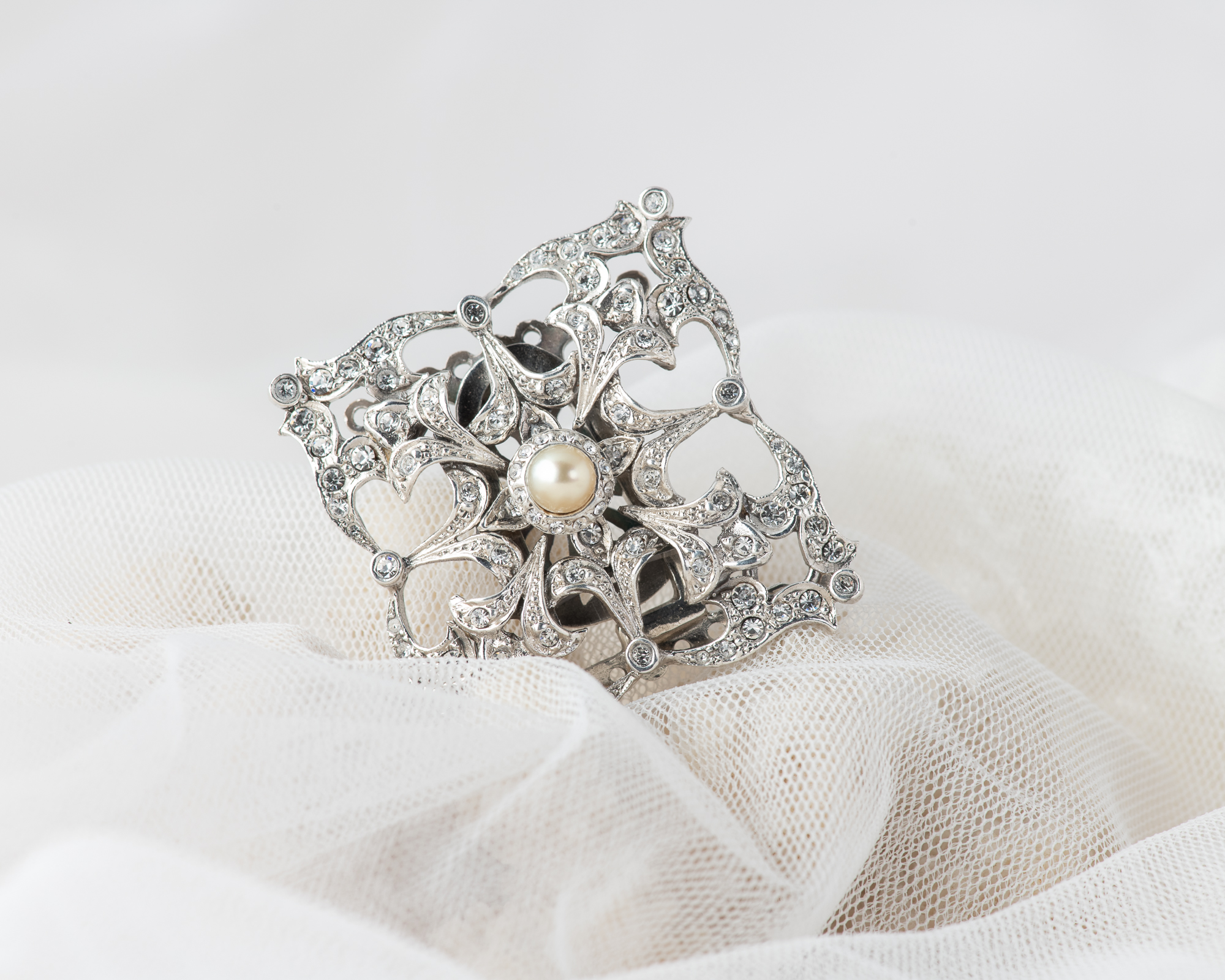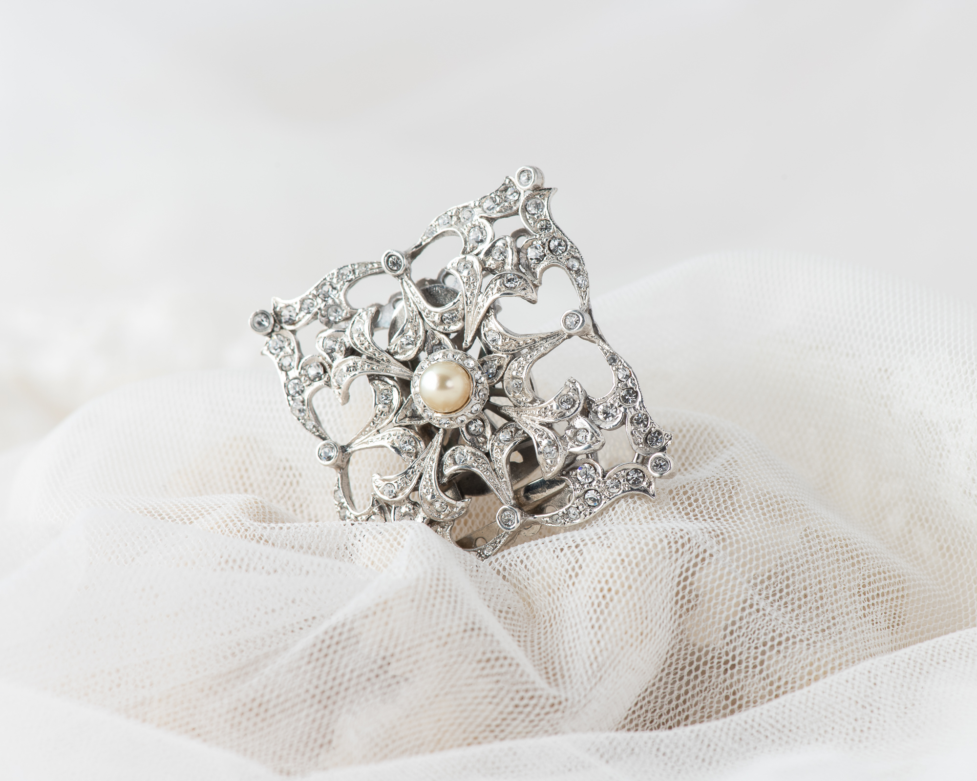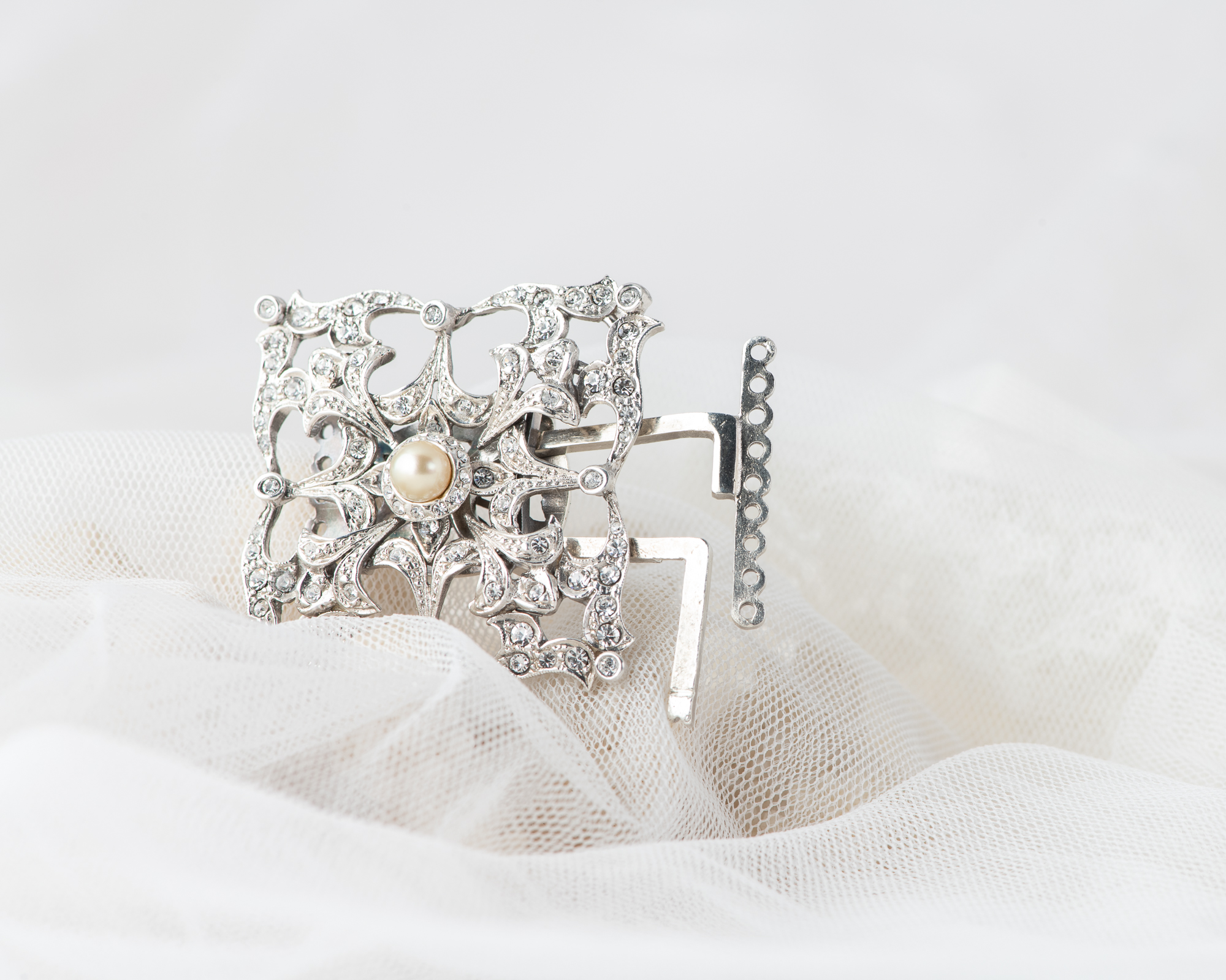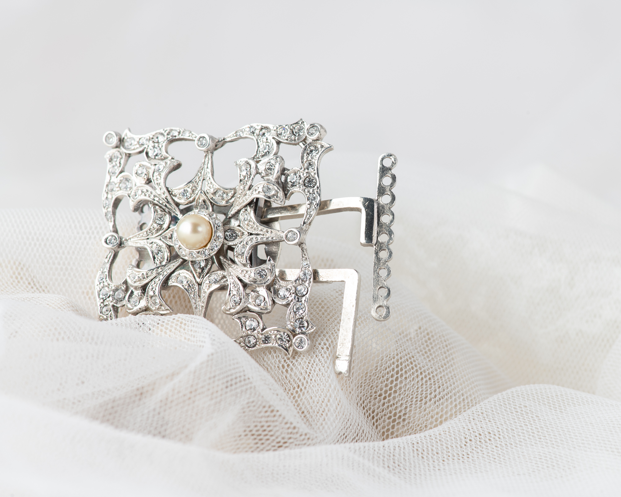 Cierre para collar de perlas, realizado a mano en plata con cristales y una perla de agua dulce. Dependiendo del tamaño de las perlas puede ser para collares de hasta 9 hilos.