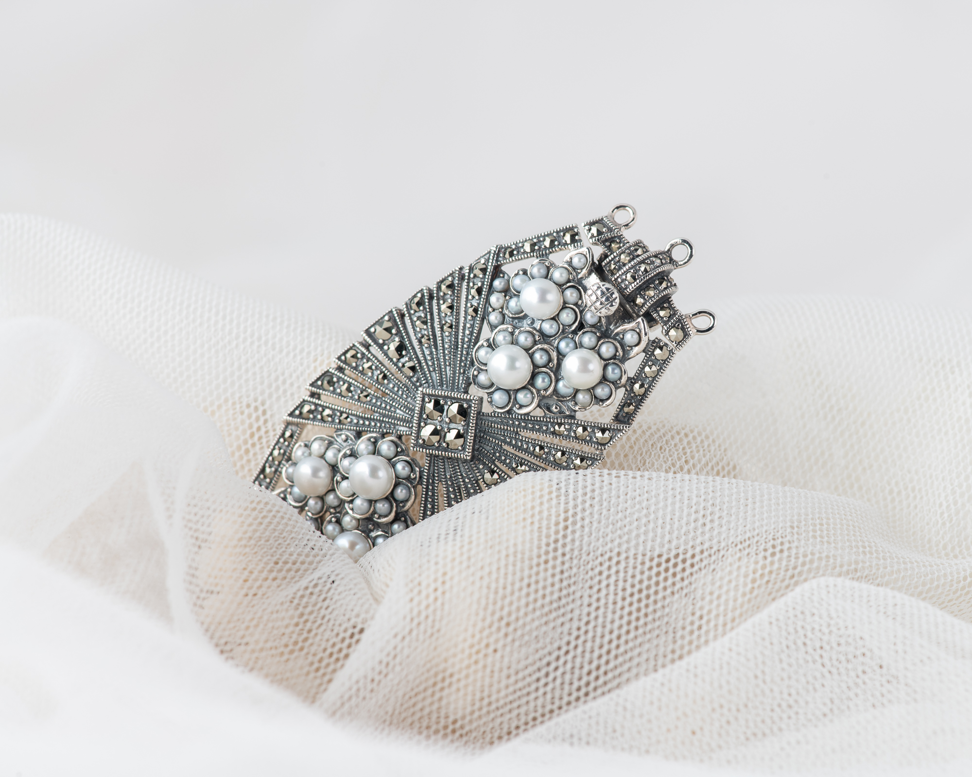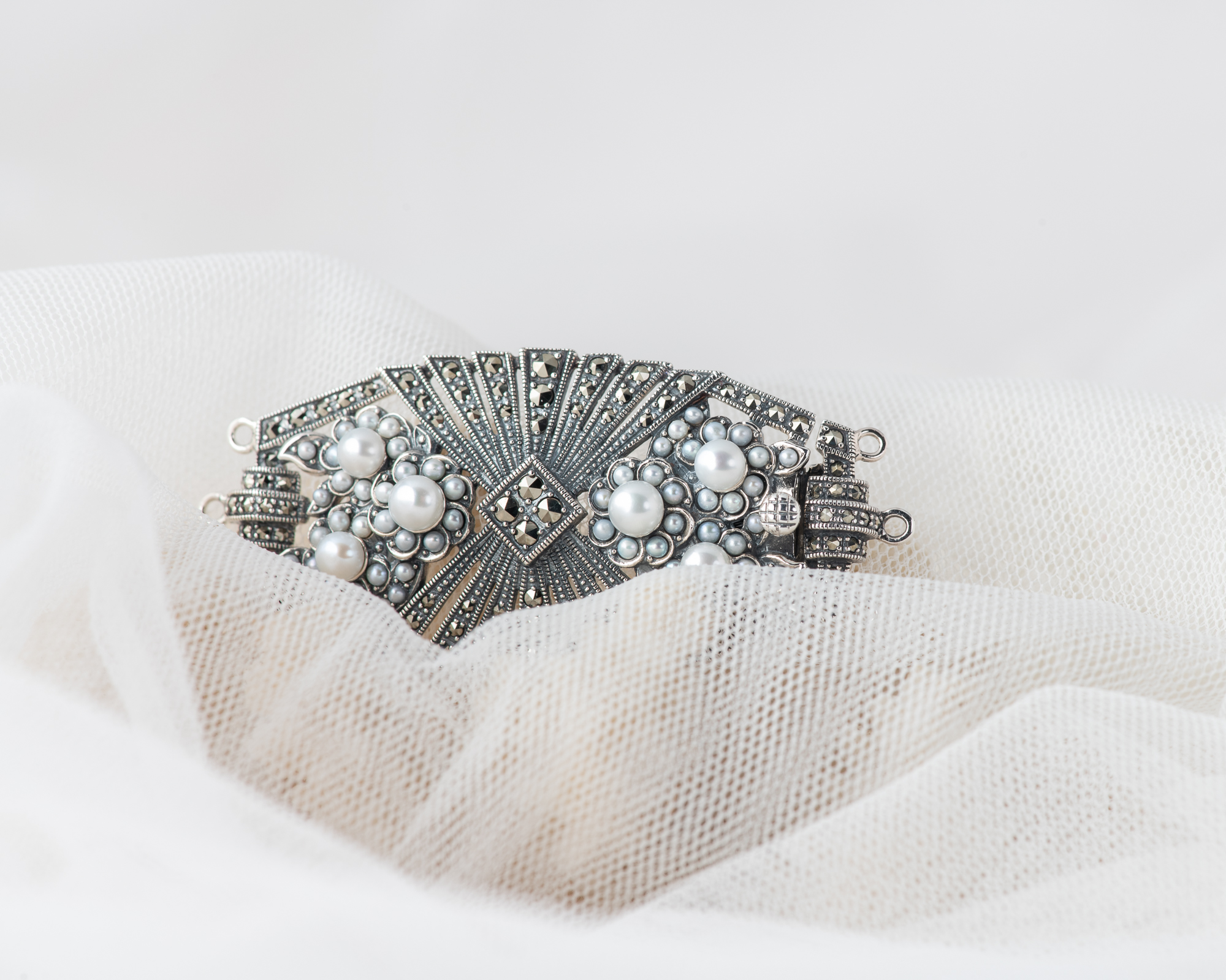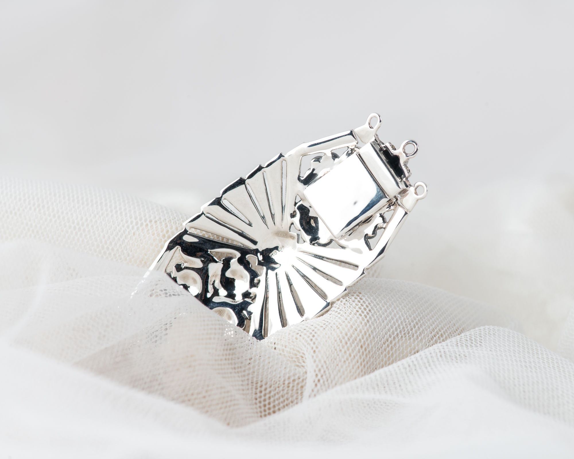 Cierre para collar de perlas, realizado a mano en plata con marcasitas y perla de agua dulce. El cierre es para collares de 3 hilos de perlas.