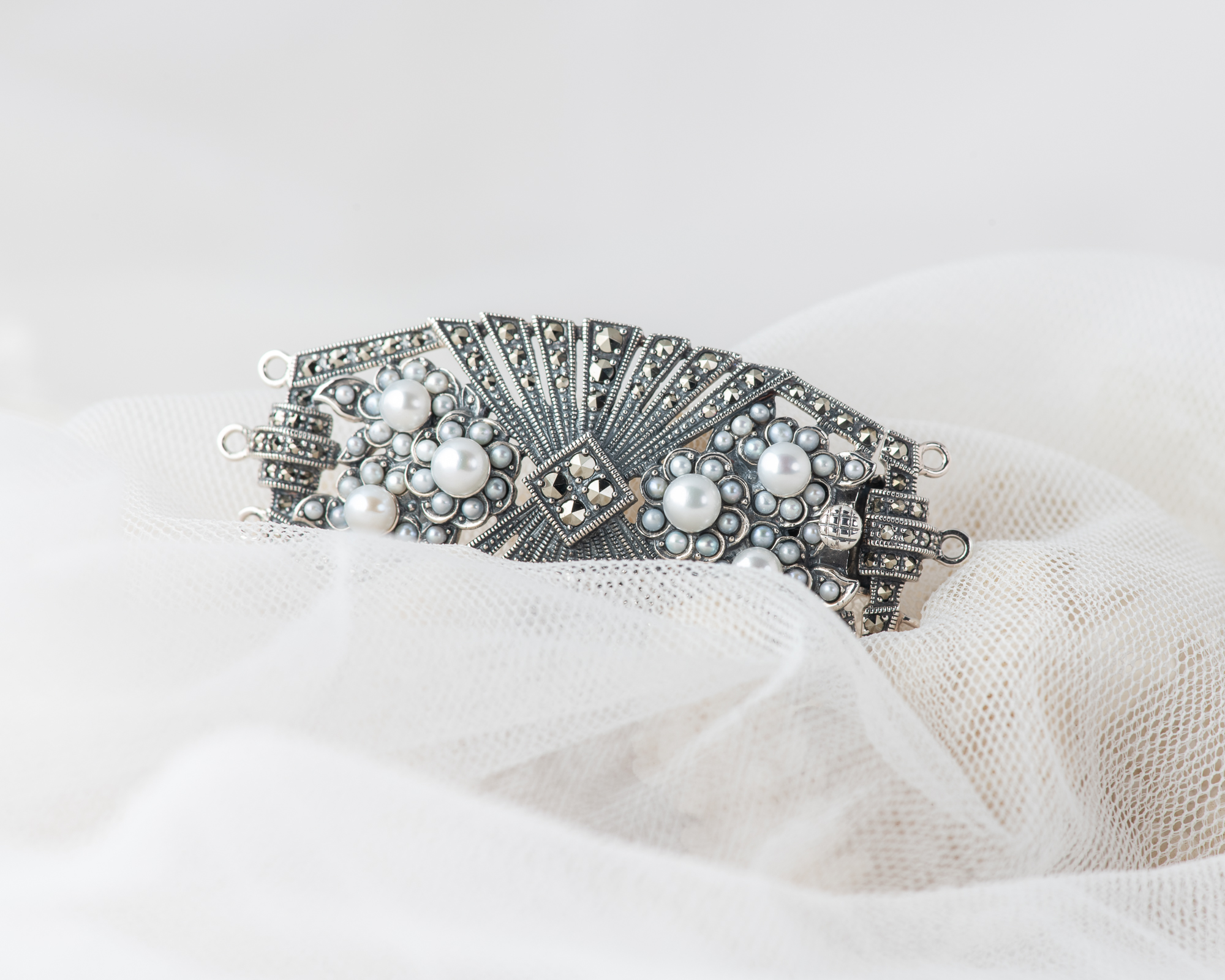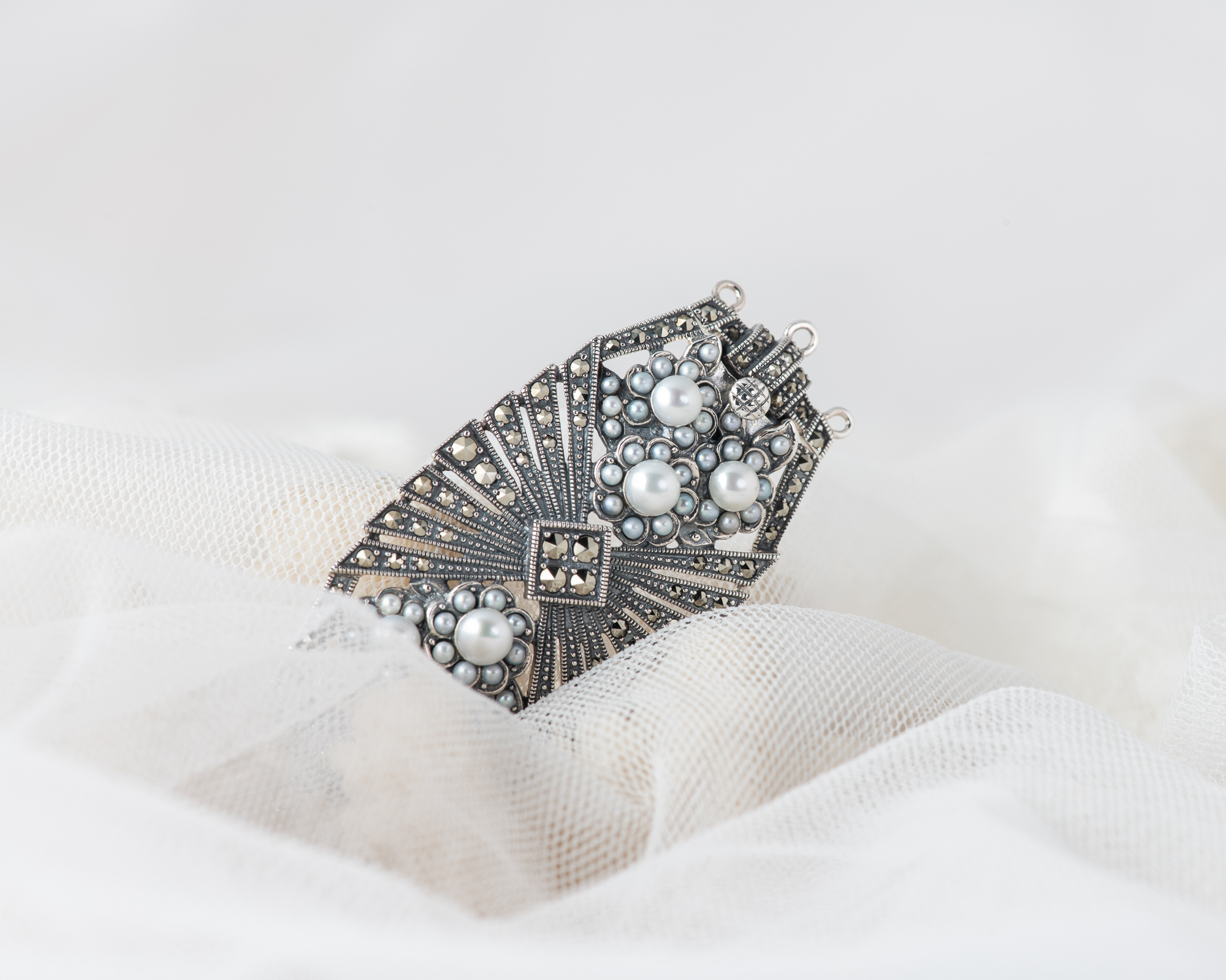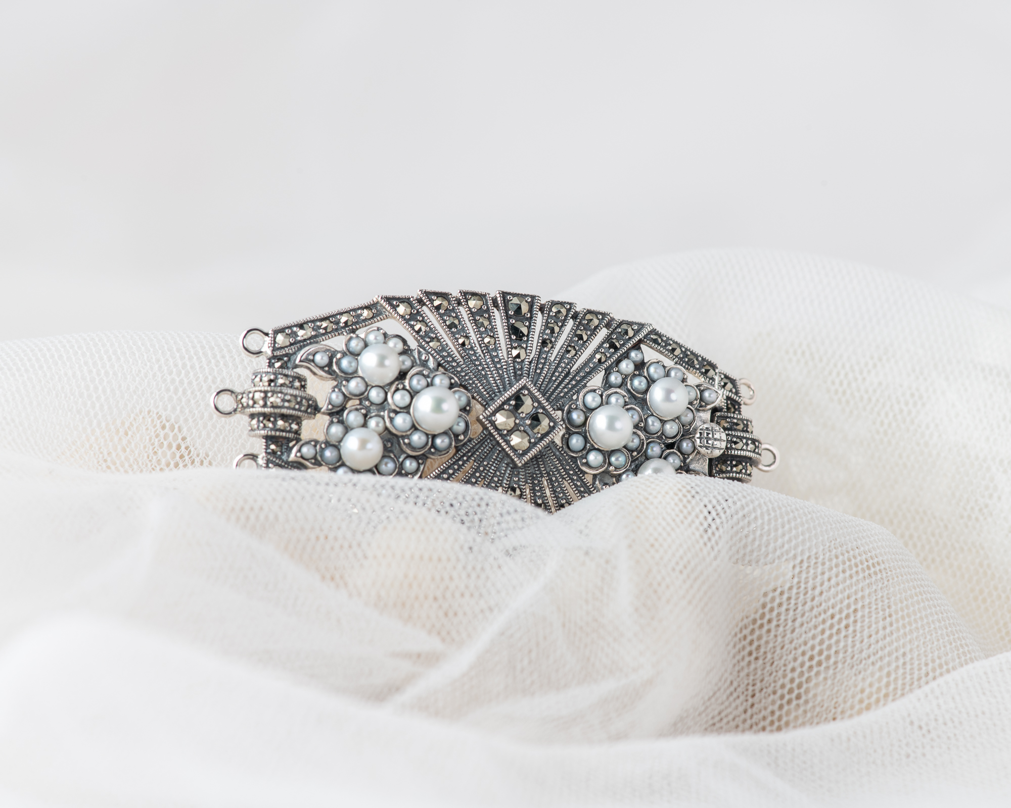Cierre para collar de perlas, realizado a mano en plata con marcasitas y perla de agua dulce. El cierre es para collares de 3 hilos de perlas.
