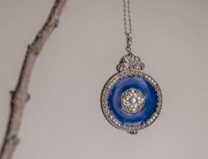 Colgante-lupa de plata y esmalte azul. Perlas de agua dulce y marcasitas