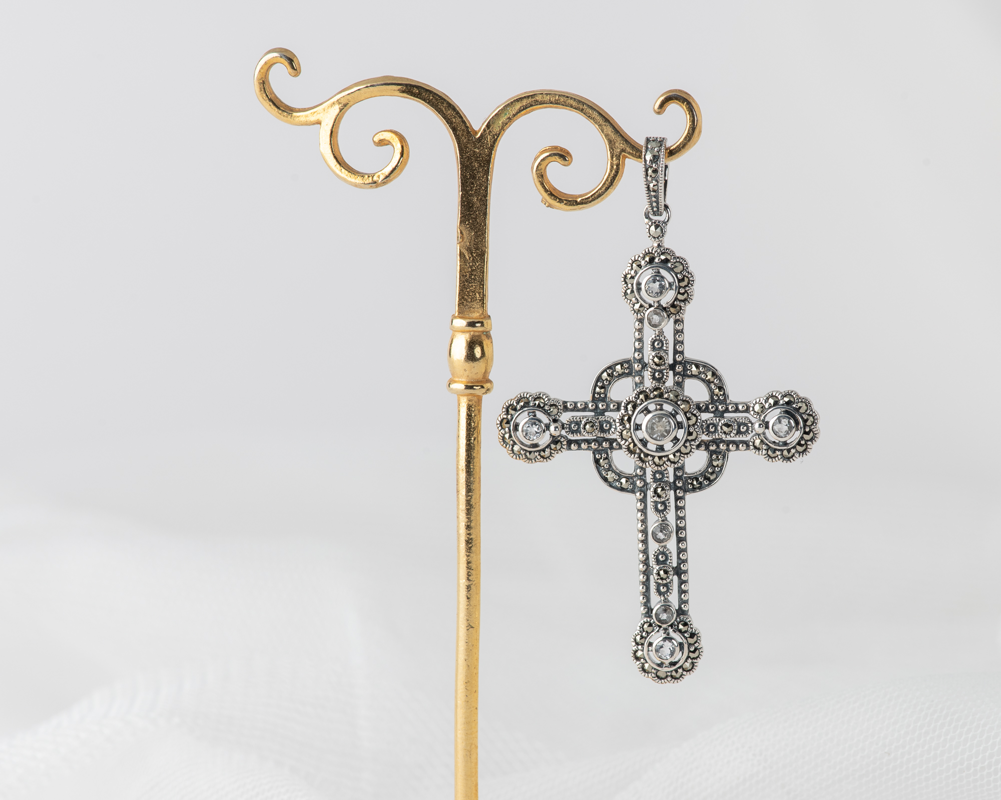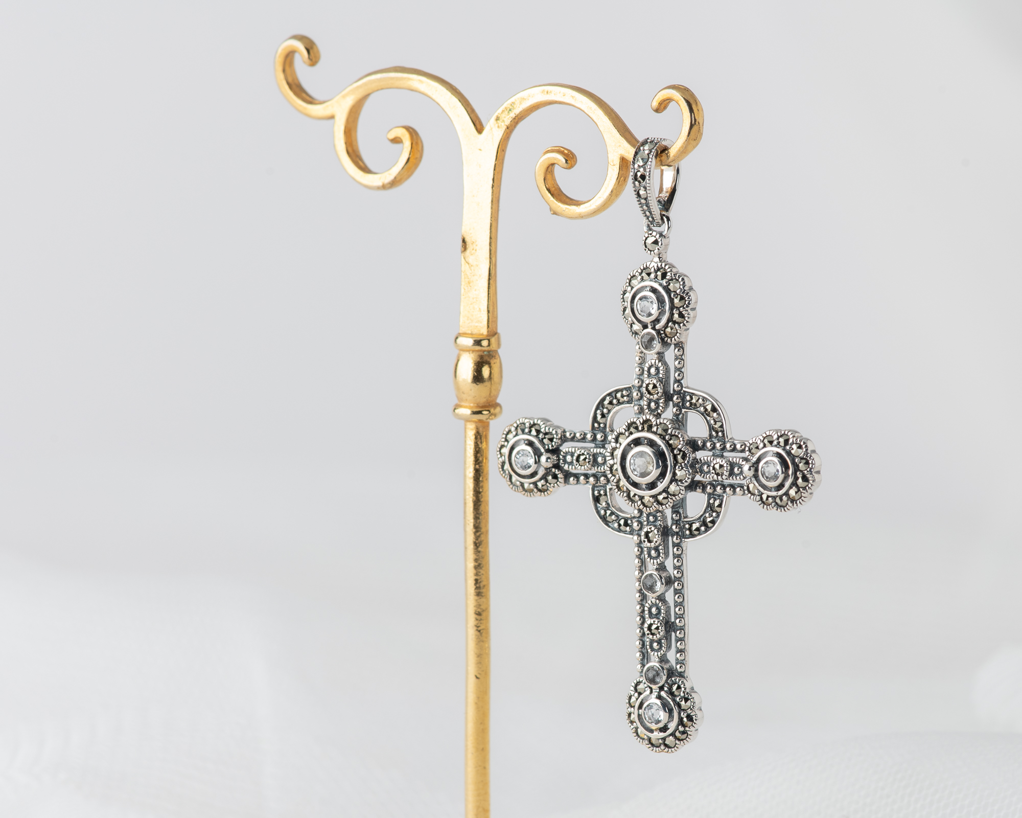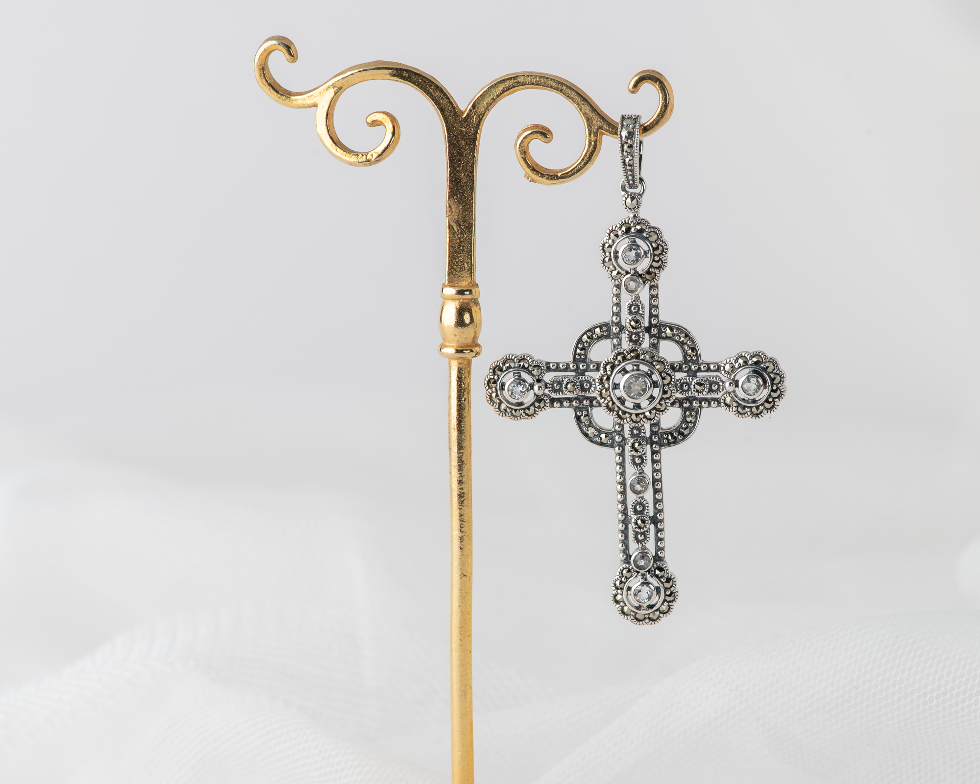Este colgante en forma de cruz, elaborado en plata, destaca por su diseño ornamentado con marcasitas y un cristal que capturan la luz con un brillo delicado y refinado. Inspirado en las cruces de estilo victoriano, su silueta equilibrada y su rica decoración lo convierten en una pieza de gran presencia, perfecta para lucir con cadenas finas o cintas de terciopelo. Una joya con alma histórica, ideal para añadir un toque de elegancia atemporal a cualquier look.