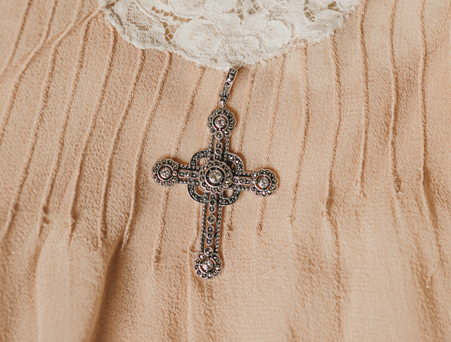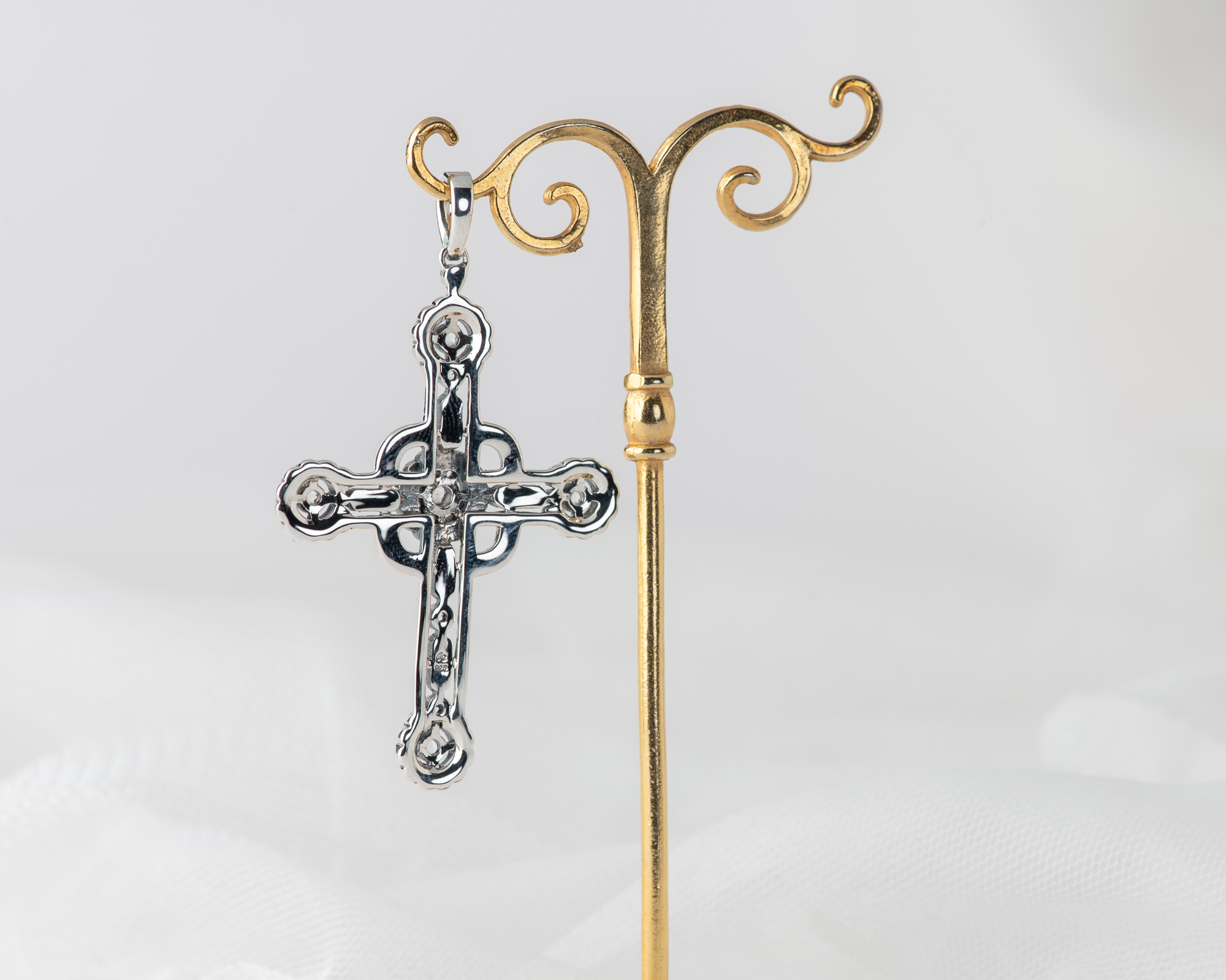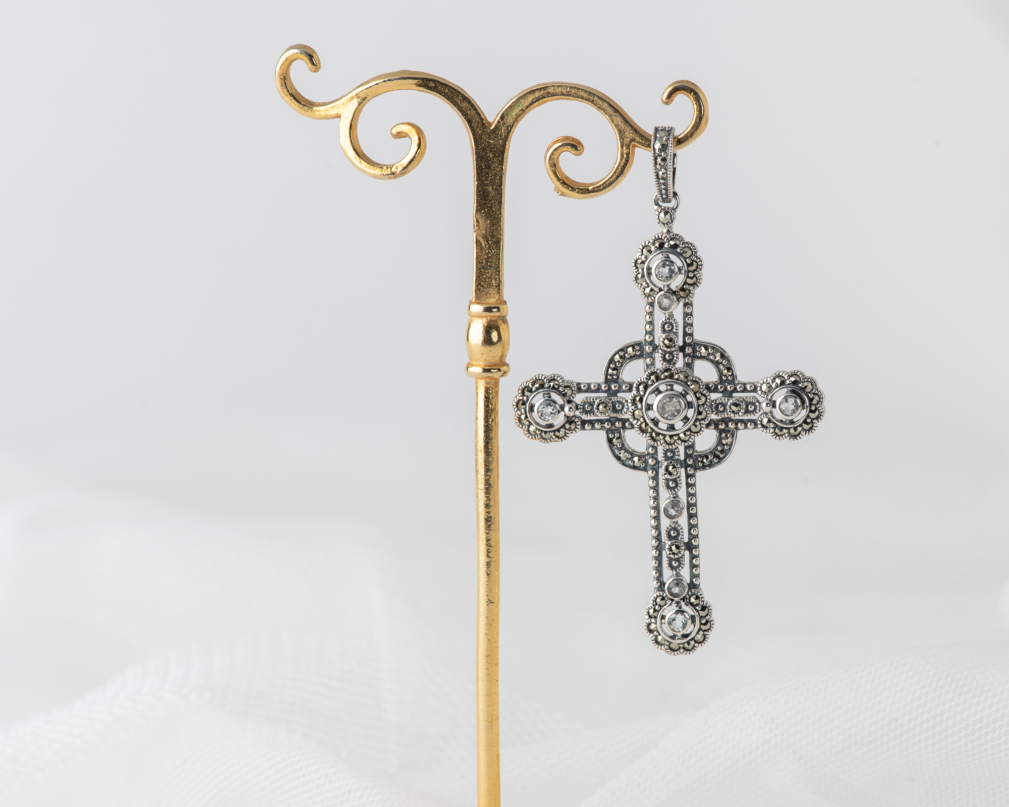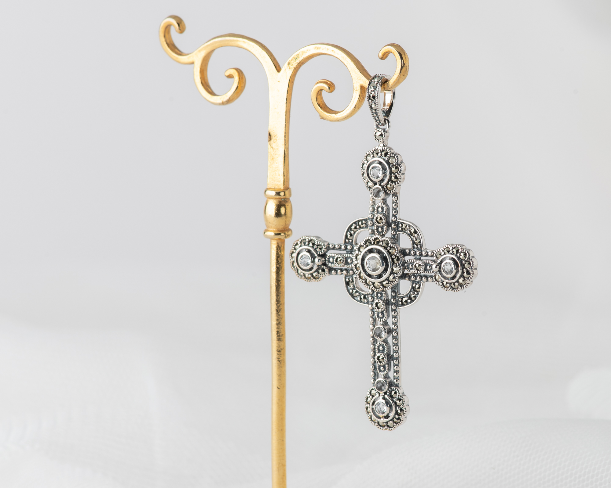 Este colgante en forma de cruz, elaborado en plata, destaca por su diseño ornamentado con marcasitas y un cristal que capturan la luz con un brillo delicado y refinado. Inspirado en las cruces de estilo victoriano, su silueta equilibrada y su rica decoración lo convierten en una pieza de gran presencia, perfecta para lucir con cadenas finas o cintas de terciopelo. Una joya con alma histórica, ideal para añadir un toque de elegancia atemporal a cualquier look.