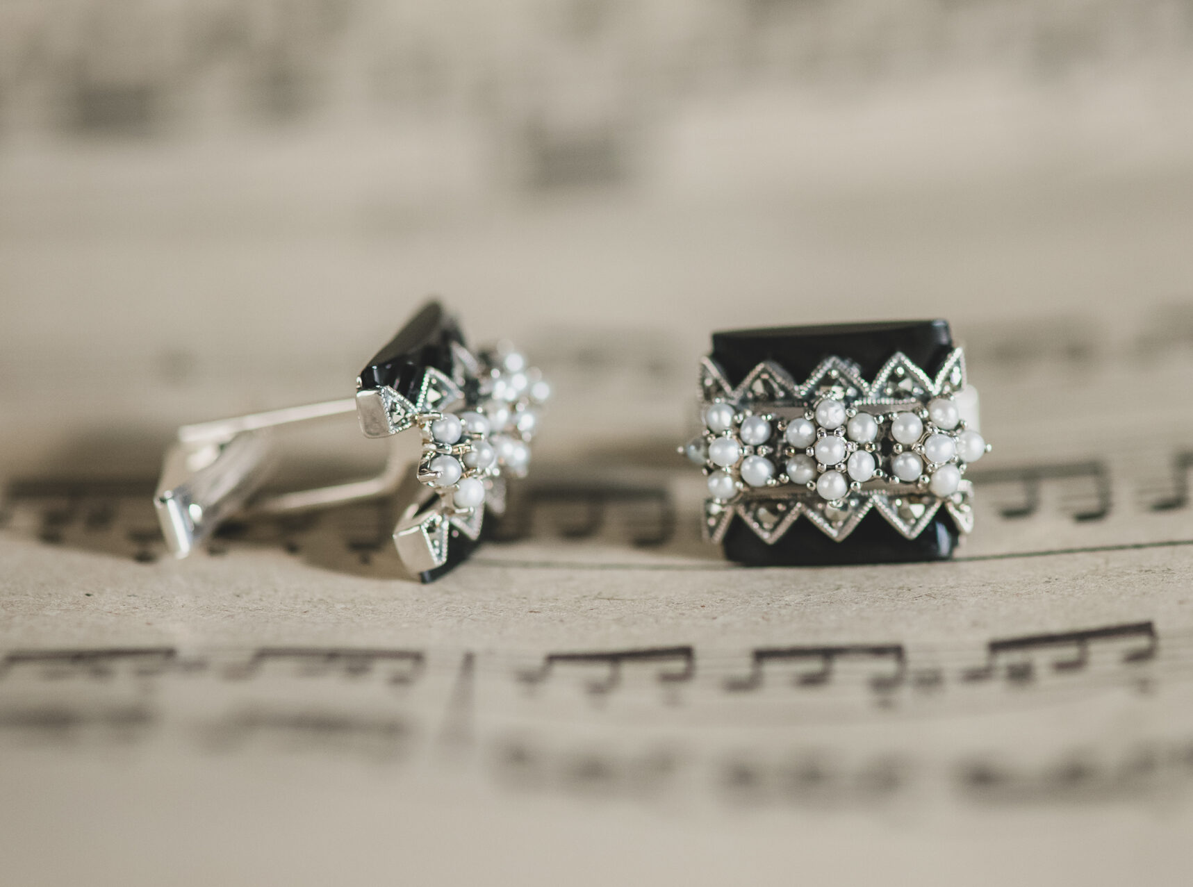Gemelos realizados a mano en plata con pequeñas perlas de agua dulce, marcasitas y ónix.