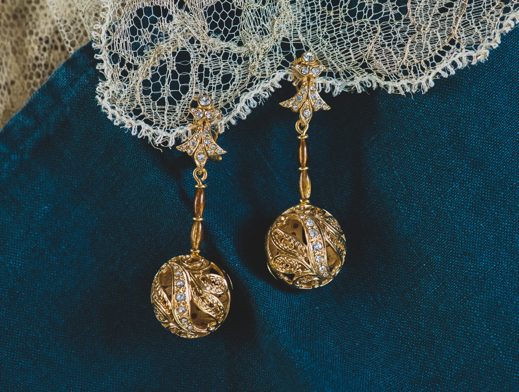 Pendientes de plata dorada con circonitas y coral natural de tono dorado.  Reproducción de una joya Victoriana, pieza totalmente realizada a mano por maestros orfebres.