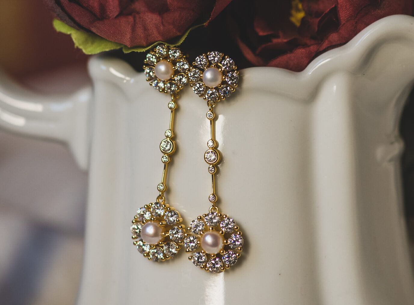 Pendientes realizados en plata bañada en oro con circonitas y dos perlas de agua dulce. Este pendiente también puede hacerse con topacio azul claro, topacio London Blue, ágata verde o granate, en lugar de perlas.