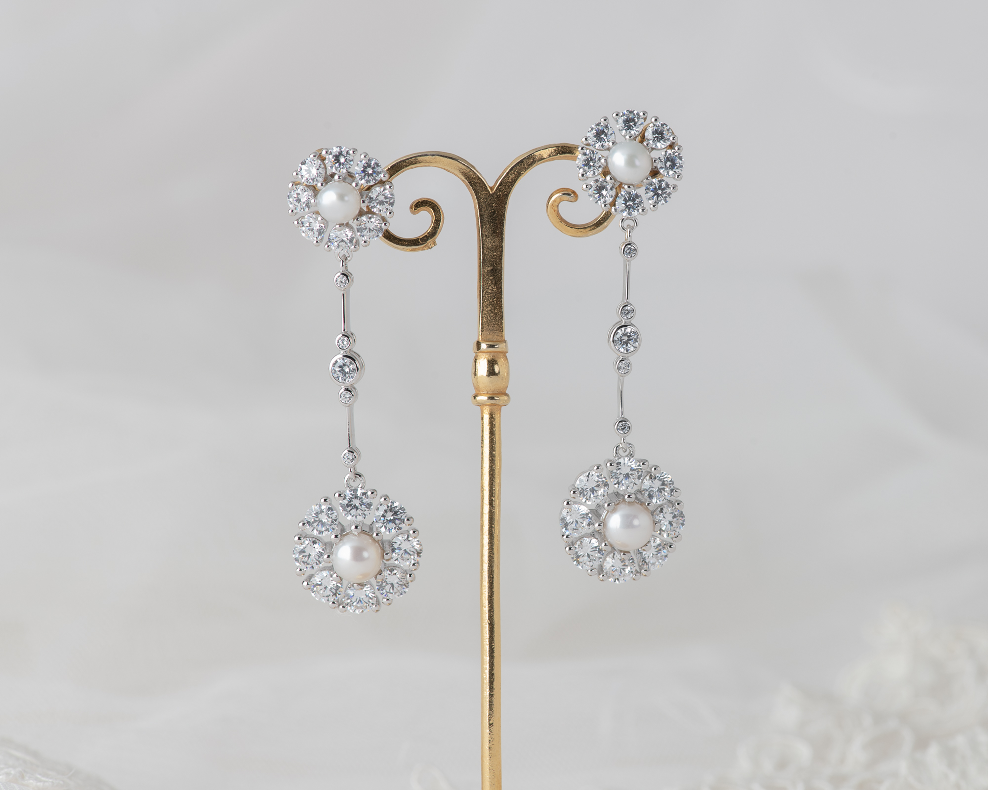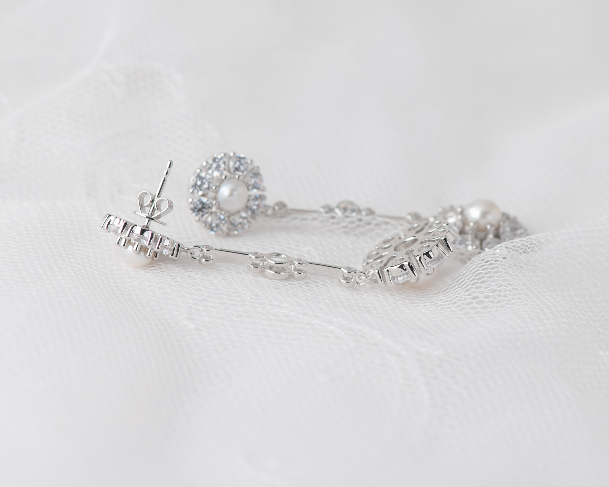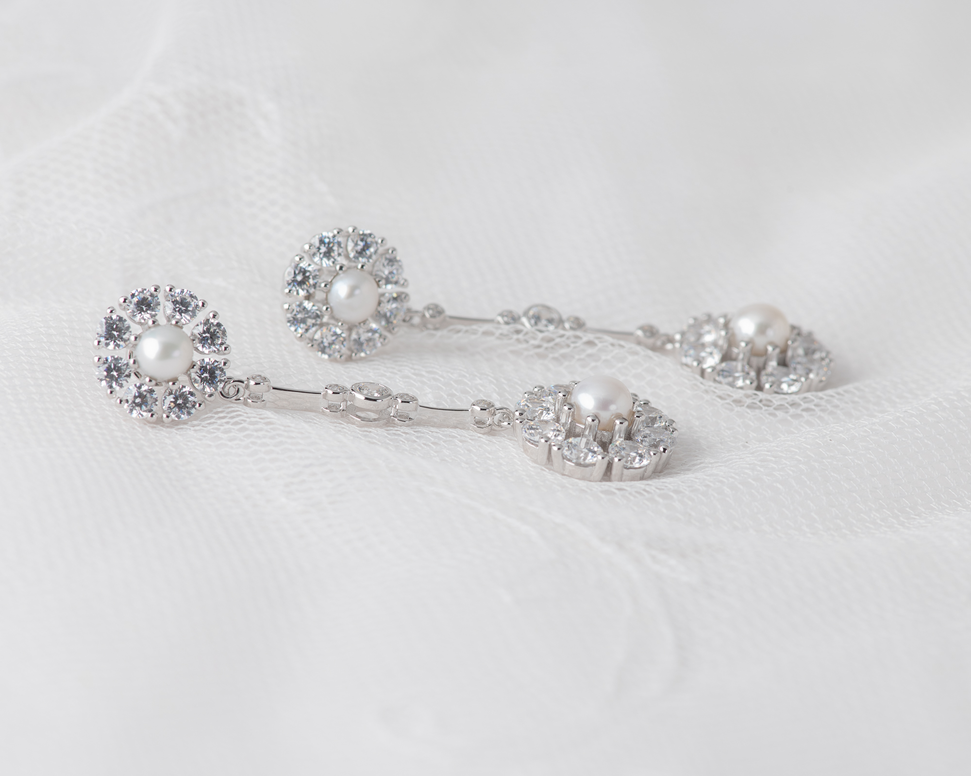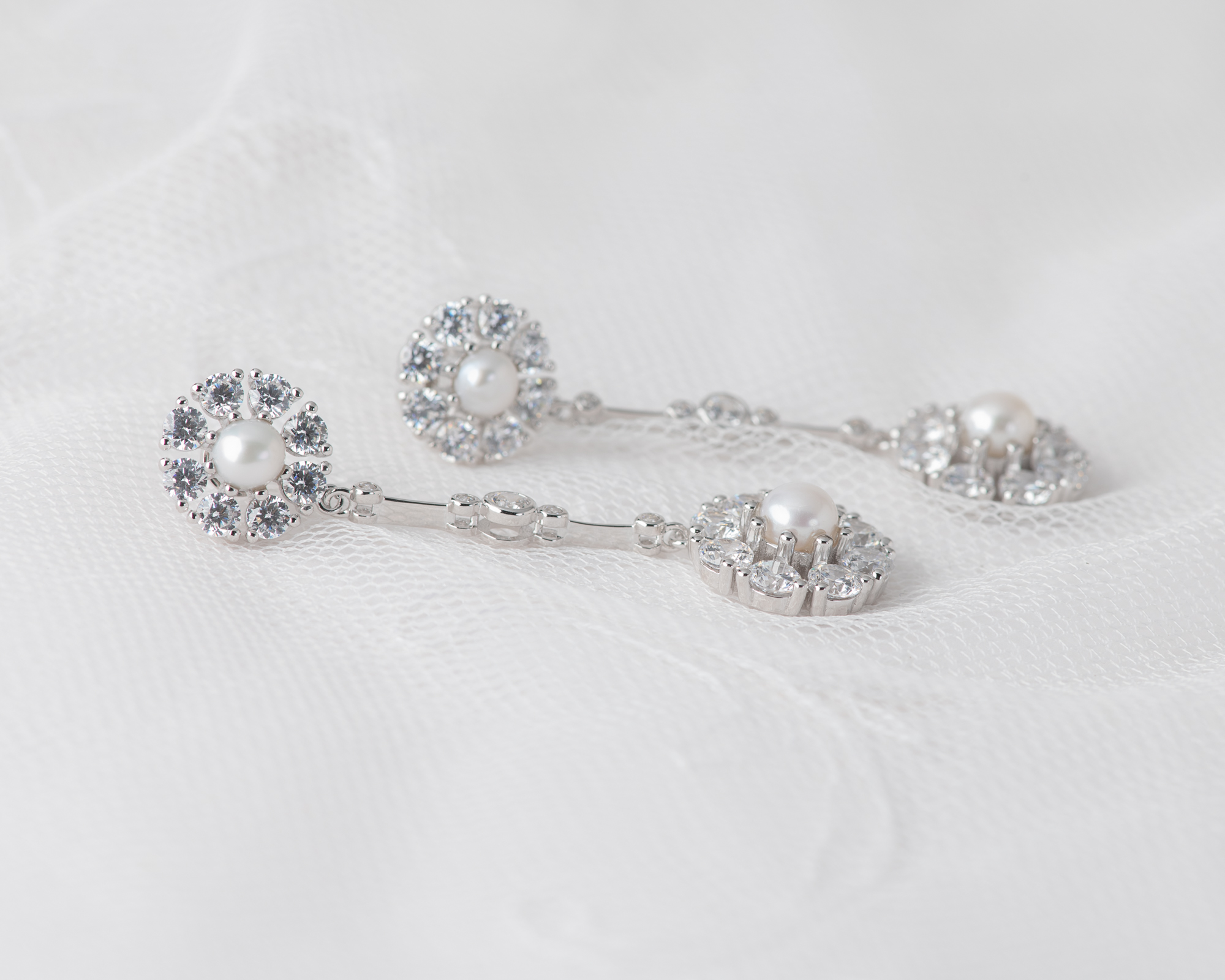 Pendientes realizados en plata con circonitas y dos perlas de agua dulce. Este pendiente también puede hacerse con topacio azul claro, topacio London Blue, ágata verde o granate, en lugar de perlas.