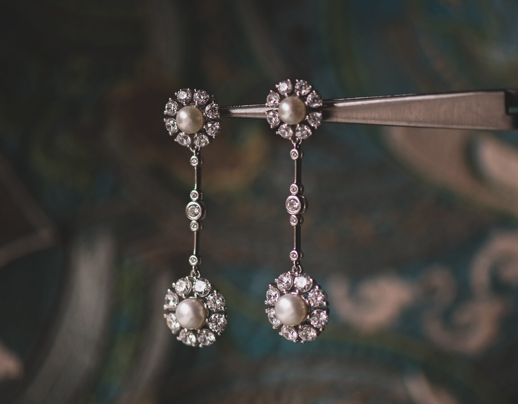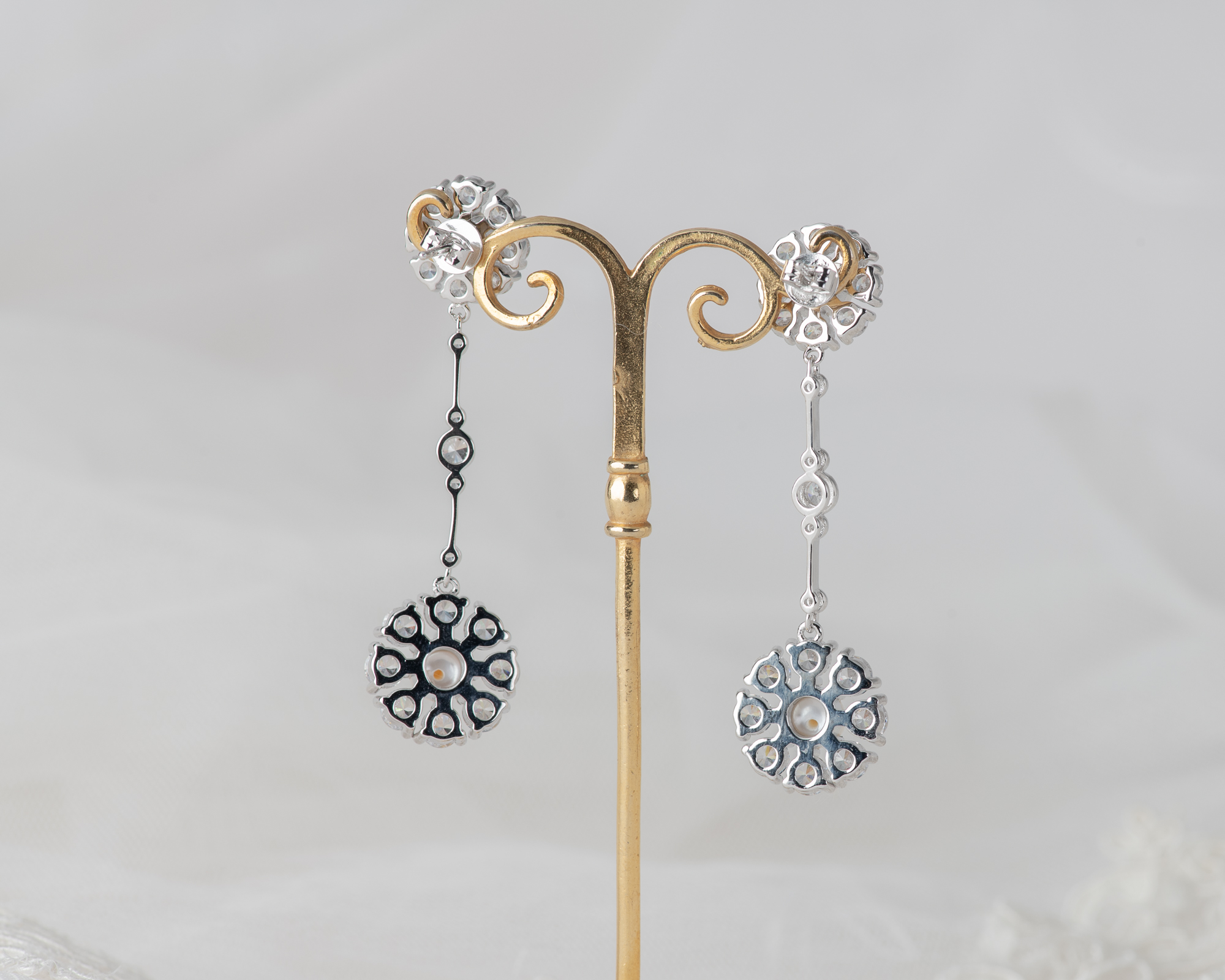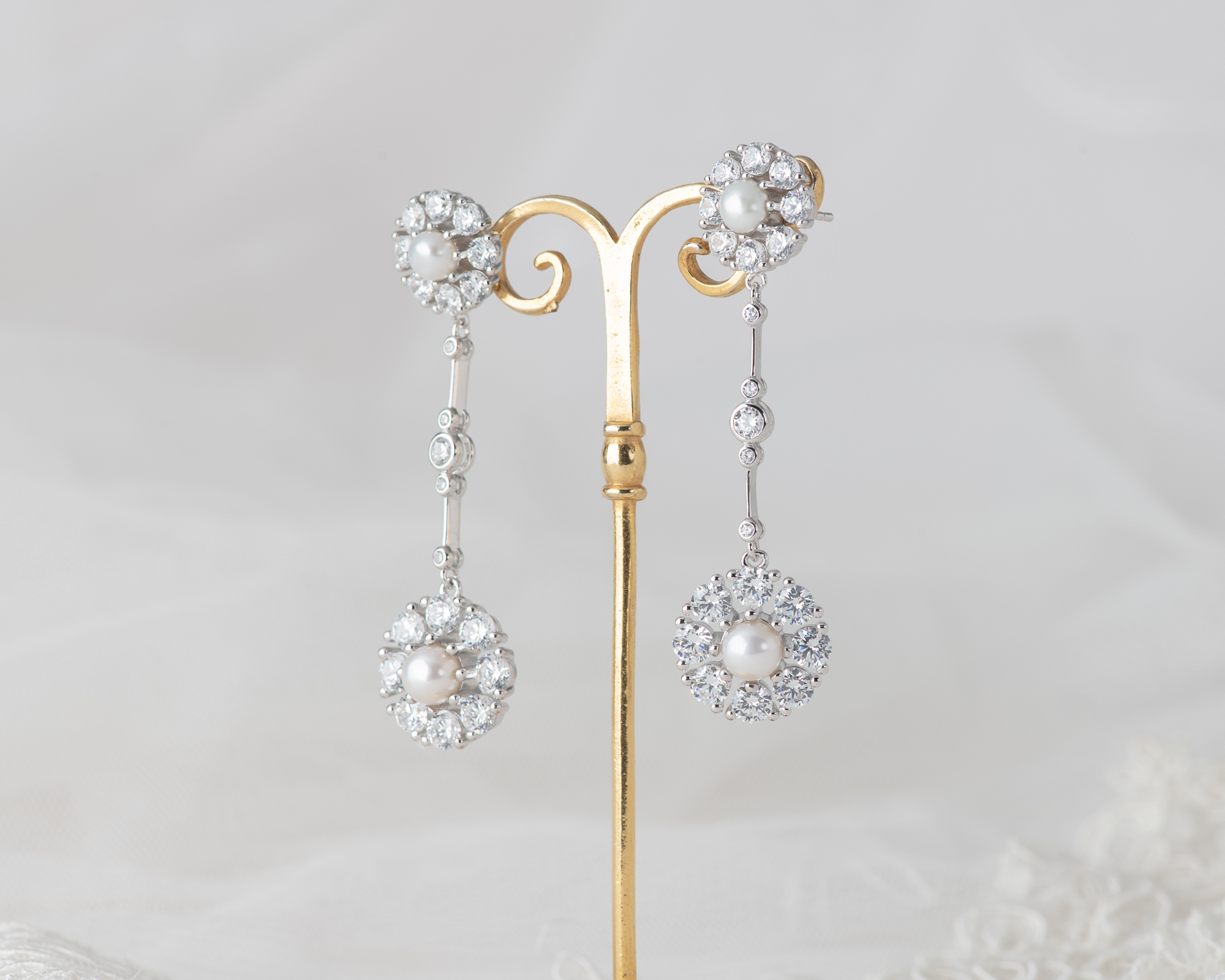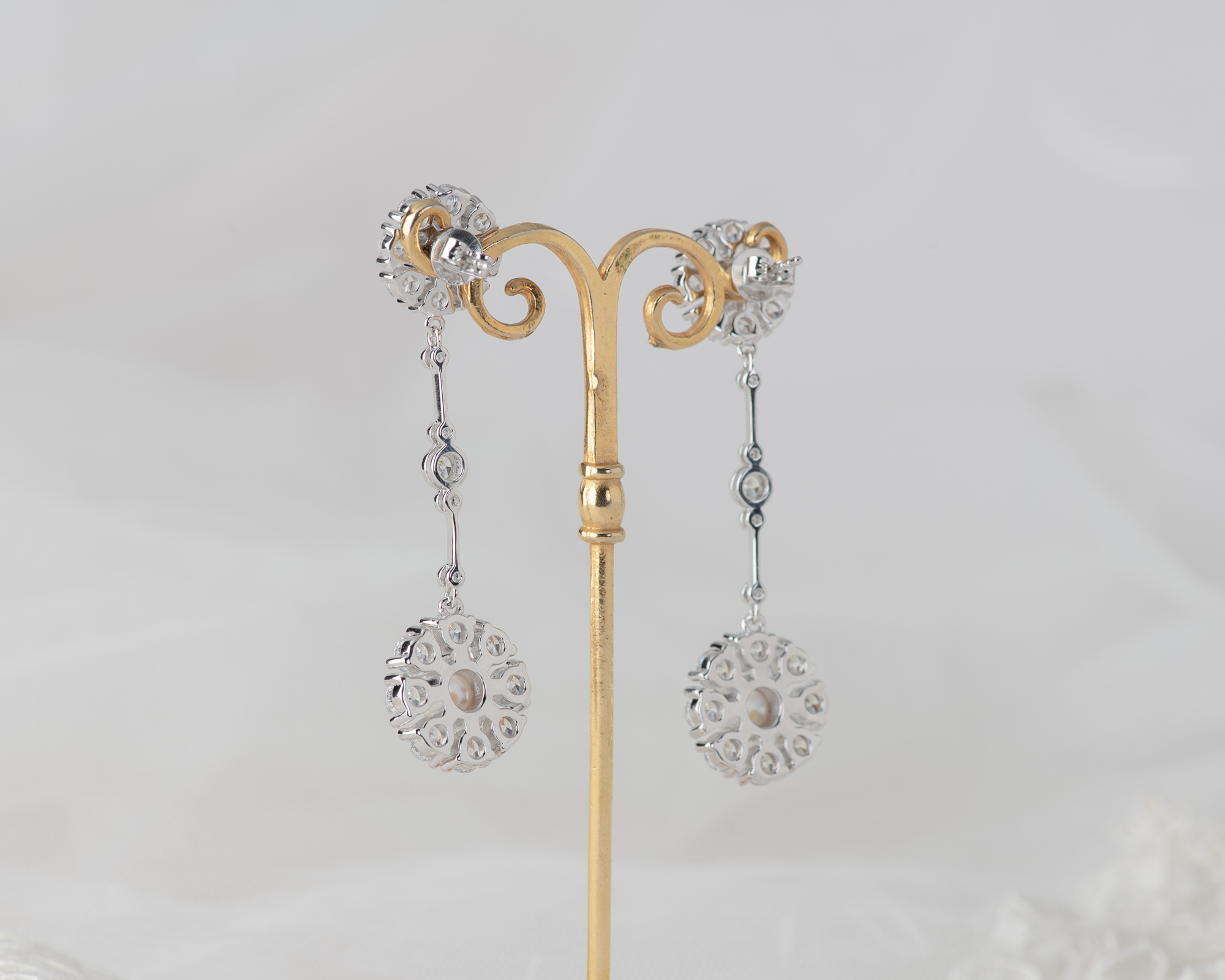 Pendientes realizados en plata con circonitas y dos perlas de agua dulce. Este pendiente también puede hacerse con topacio azul claro, topacio London Blue, ágata verde o granate, en lugar de perlas.