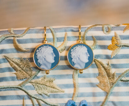 Estos pendientes de camafeo, realizados en plata dorada, son una delicada evocación de la elegancia neoclásica. El protagonista es un camafeo en tono azul, en cuyo relieve blanco se perfila el rostro de un hombre, como esculpido en una miniatura antigua. La armonía entre el azul profundo y la pureza del blanco recuerda las piezas que adornaban a las damas ilustradas del siglo XVIII.