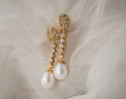 Pendientes realizados a mano en plata bañada en oro con circonitas y perla de agua dulce.