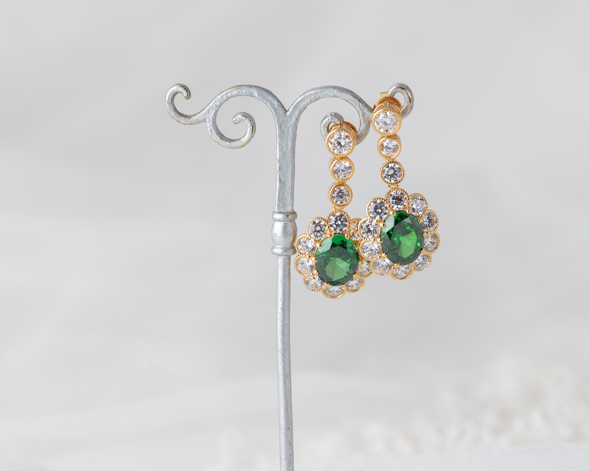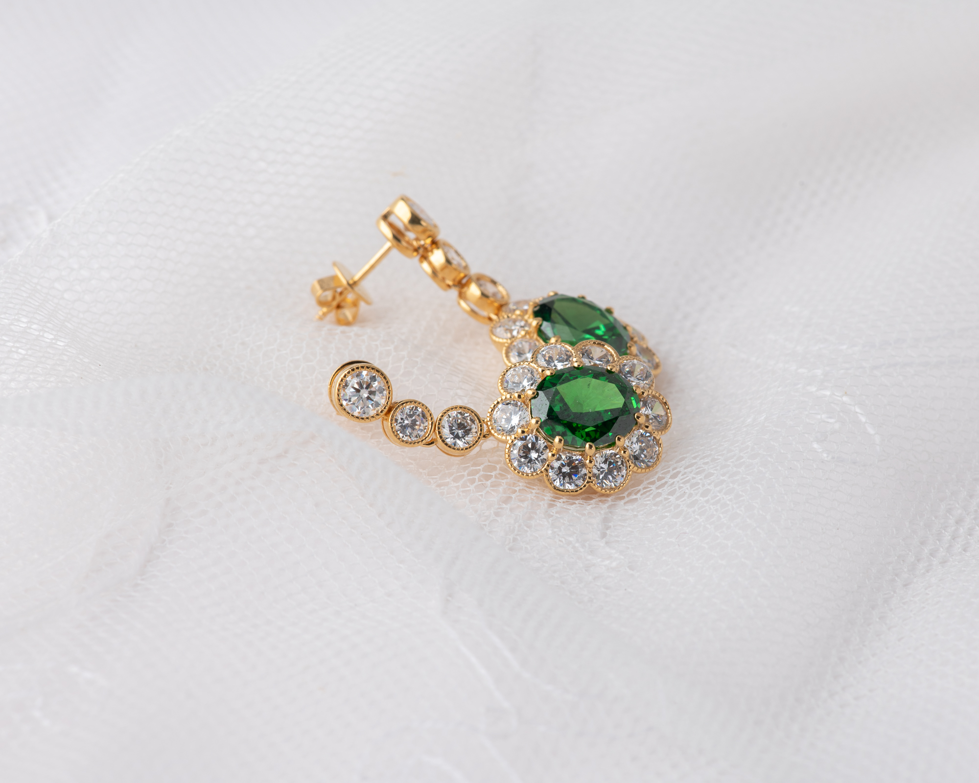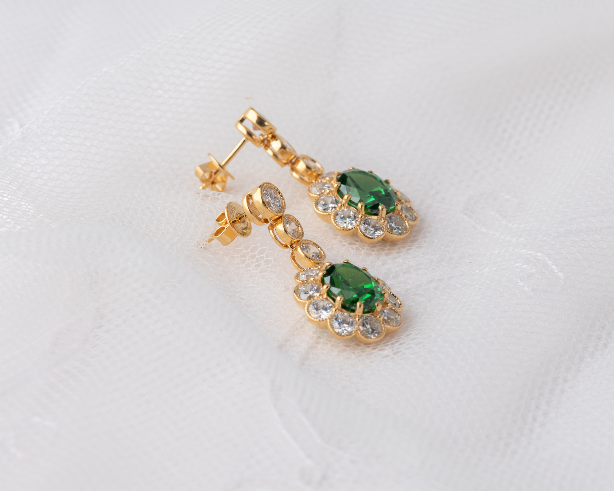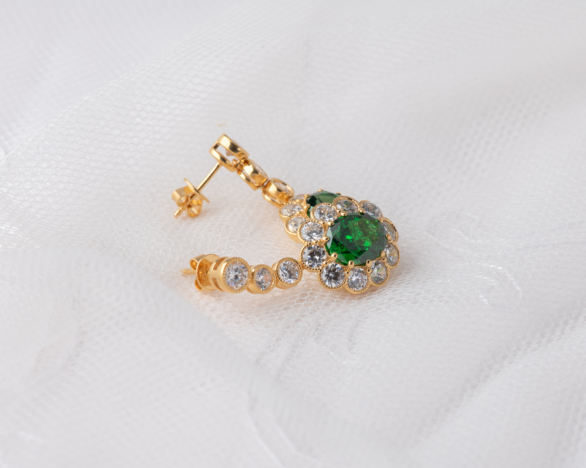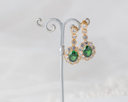 Pendientes de plata bañada en oro que capturan la elegancia de una de las joyas más icónicas del siglo XX: el anillo de compromiso que recibió la Princesa Diana. En su centro, una circonita verde, rodeada por un halo de circonitas que aportan luz y realzan su majestuosidad. Una joya que reinterpreta con sutileza el legado real.
