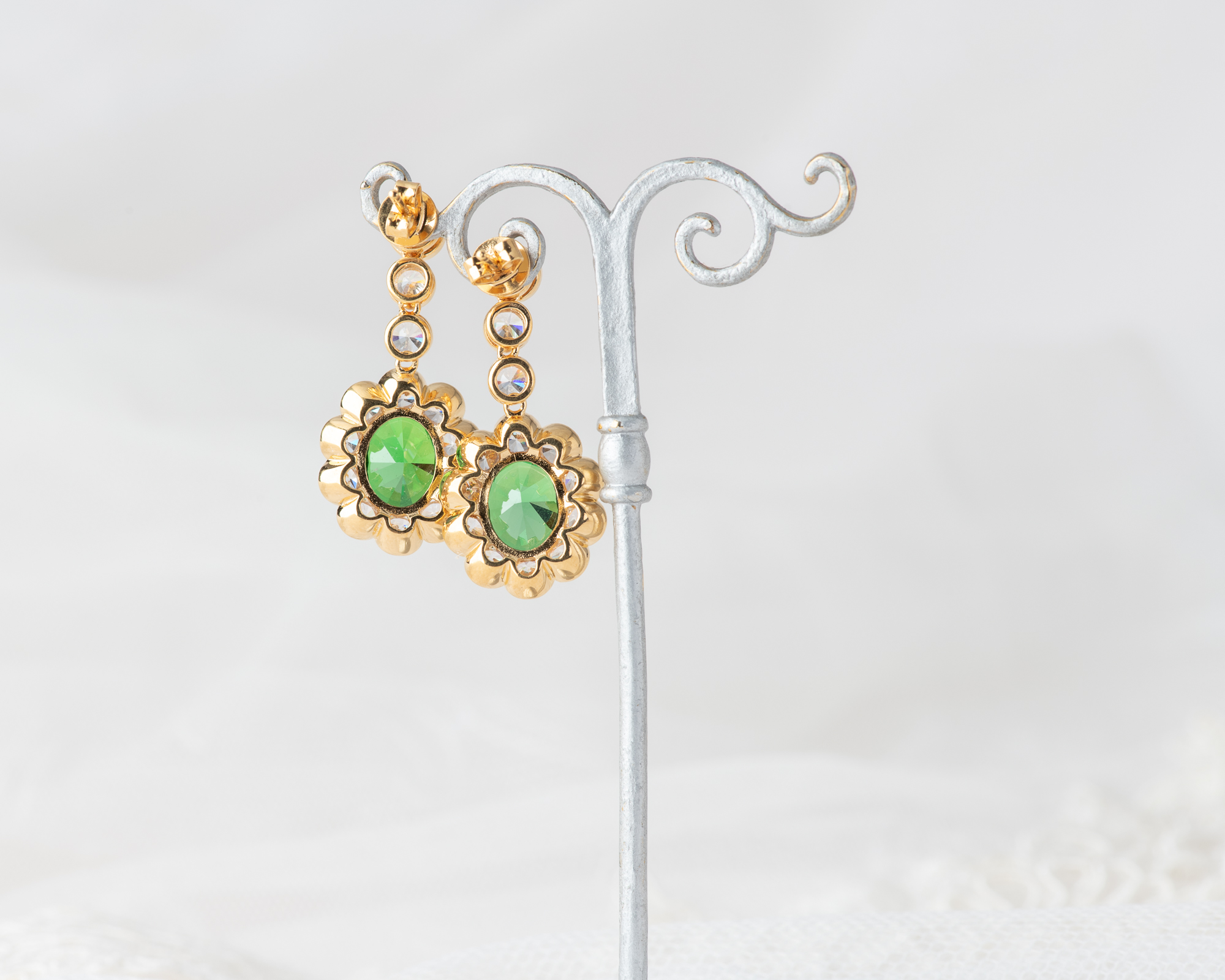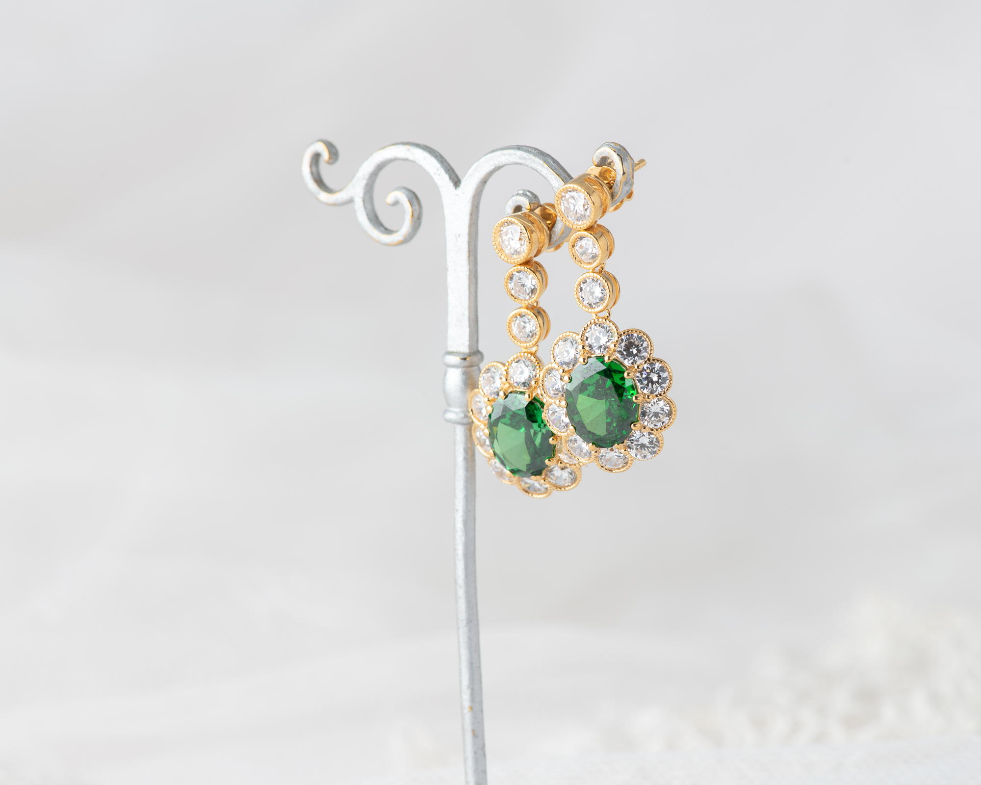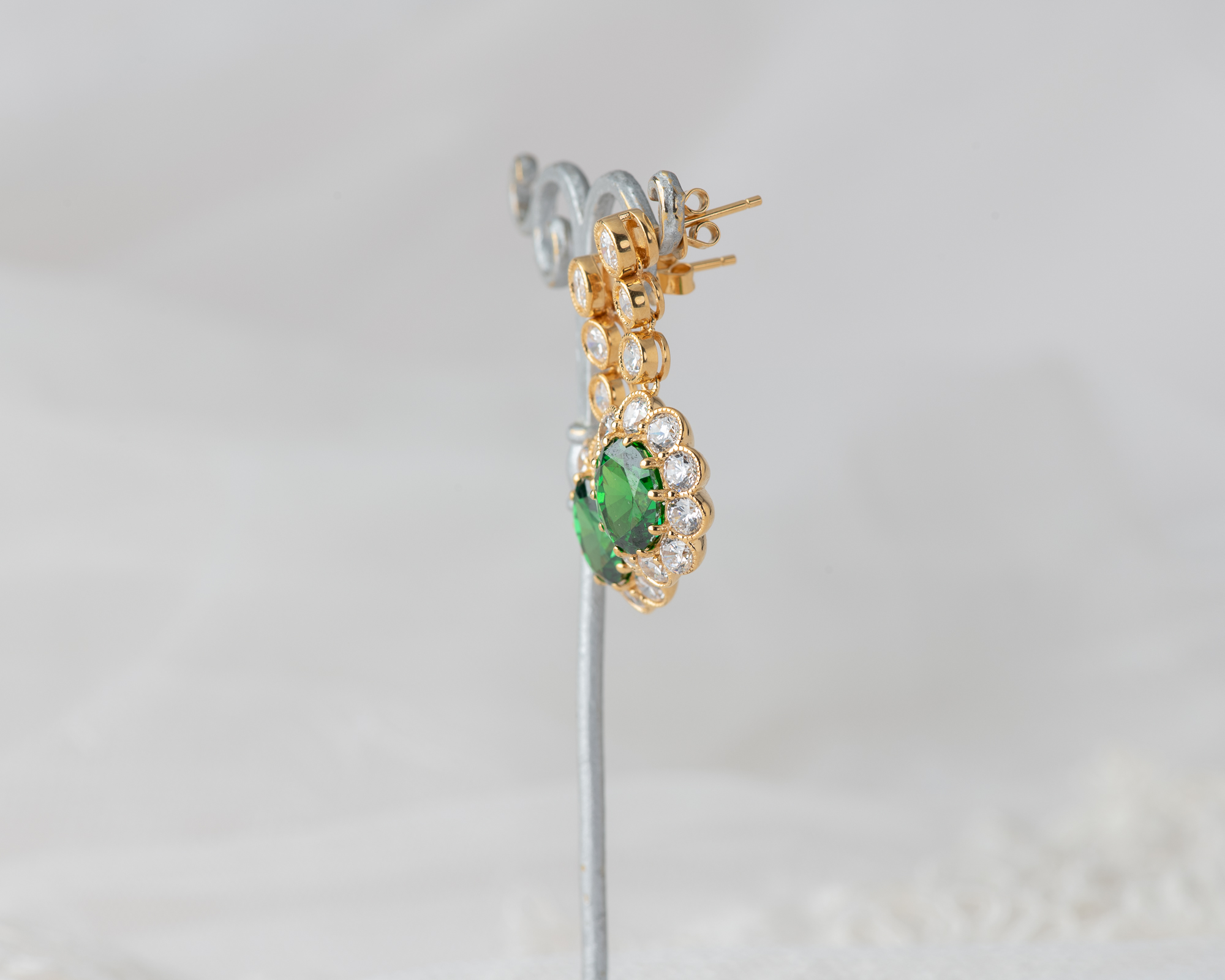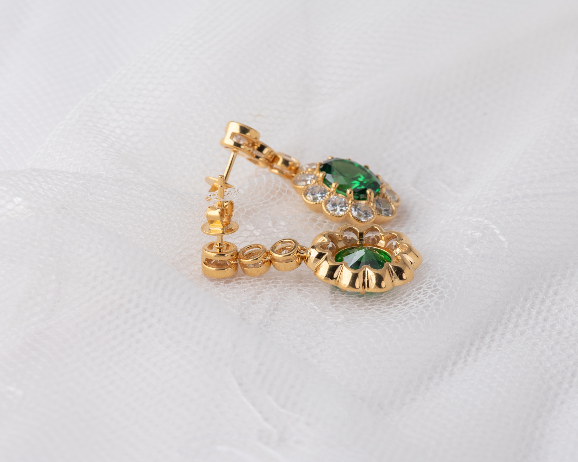 Pendientes de plata bañada en oro que capturan la elegancia de una de las joyas más icónicas del siglo XX: el anillo de compromiso que recibió la Princesa Diana. En su centro, una circonita verde, rodeada por un halo de circonitas que aportan luz y realzan su majestuosidad. Una joya que reinterpreta con sutileza el legado real.