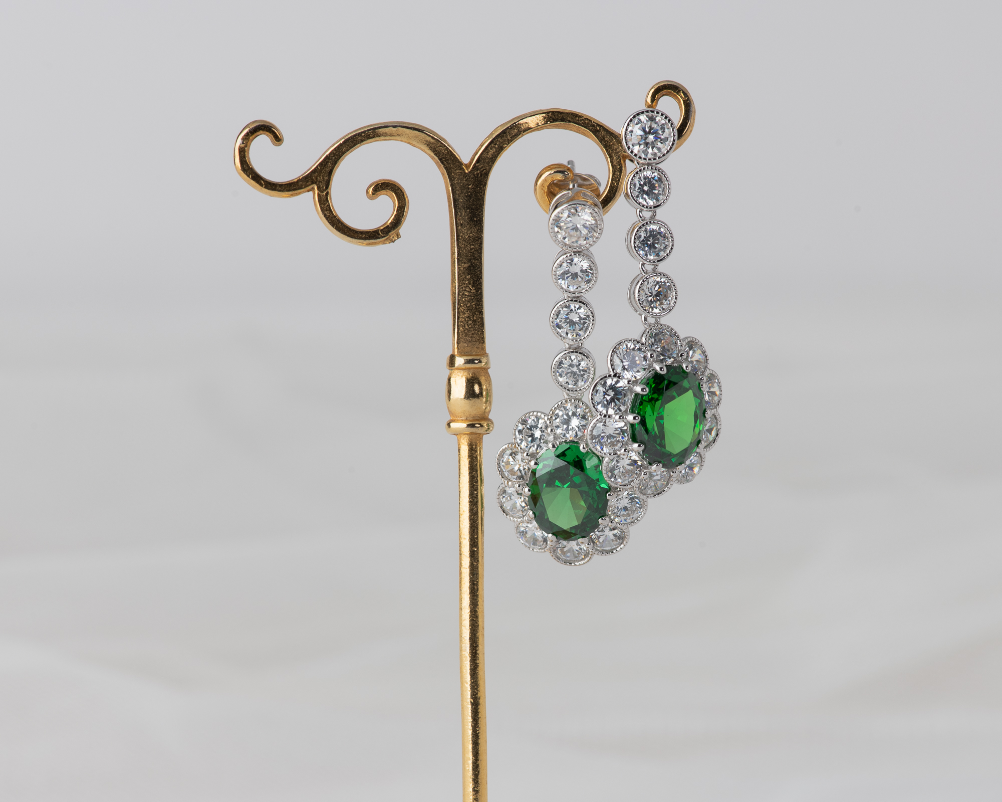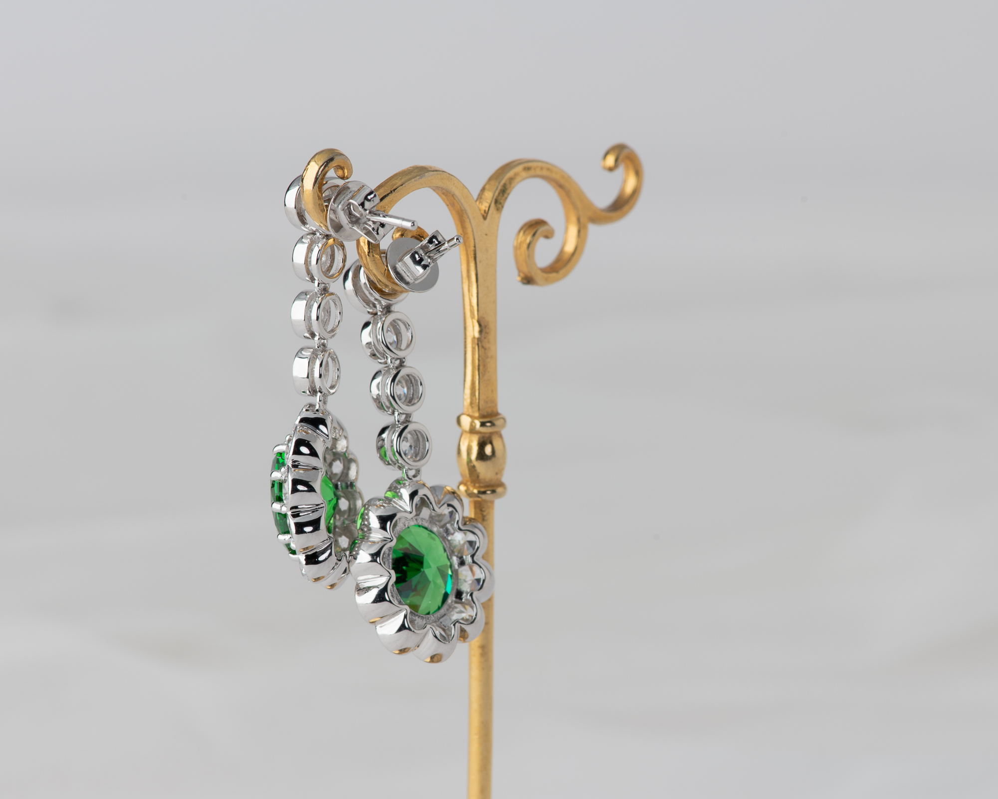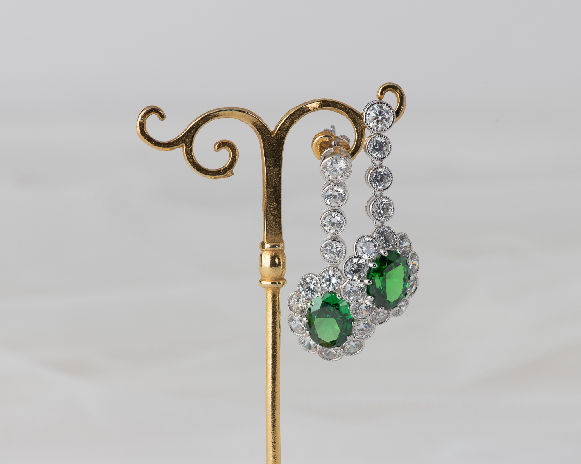 Pendientes de plata que capturan la elegancia de una de las joyas más icónicas del siglo XX: el anillo de compromiso que recibió la Princesa Diana. En su centro, una circonita verde, rodeada por un halo de circonitas que aportan luz y realzan su majestuosidad. Una joya que reinterpreta con sutileza el legado real.