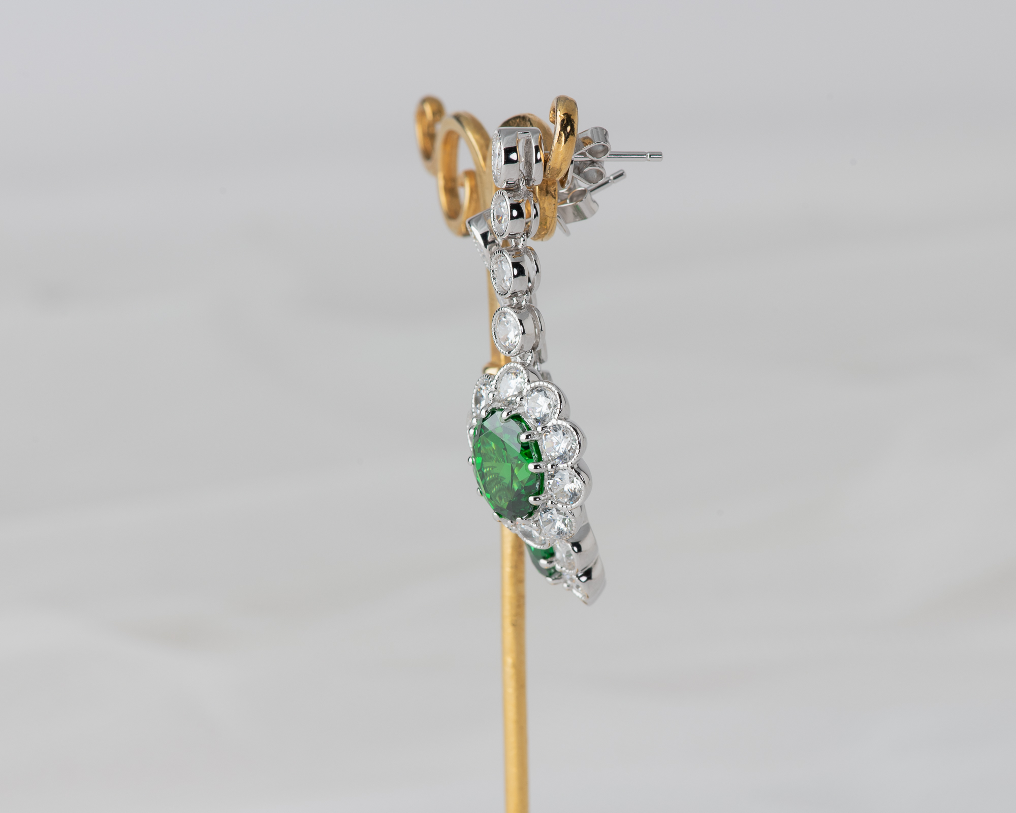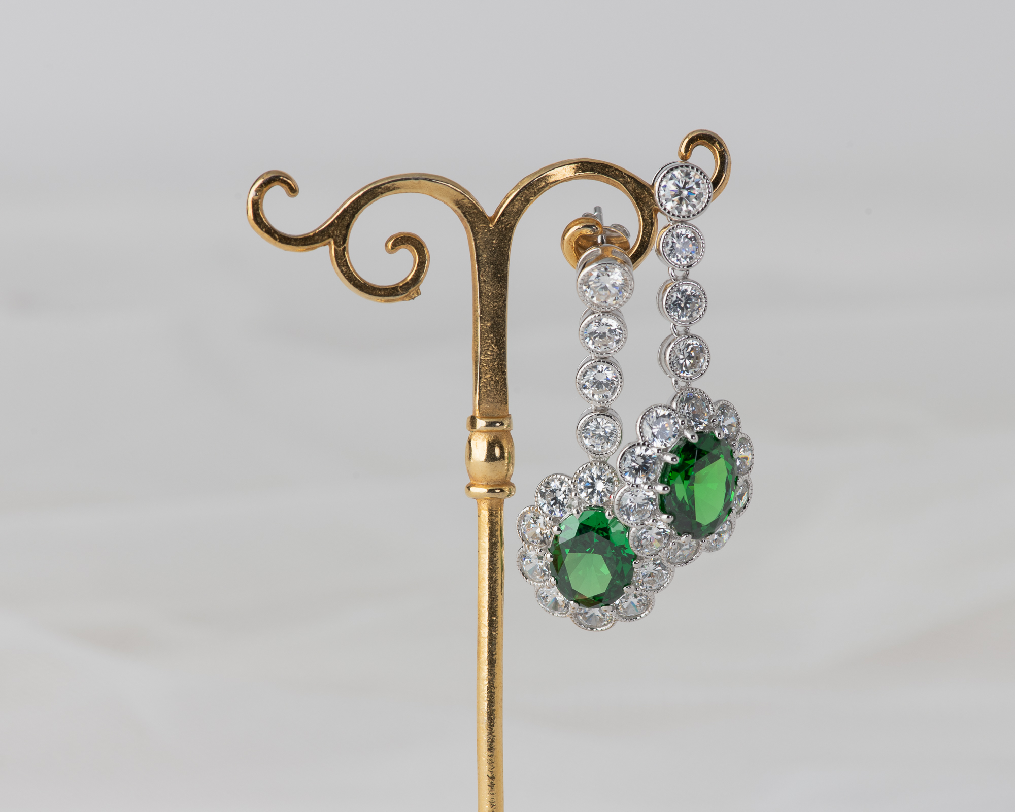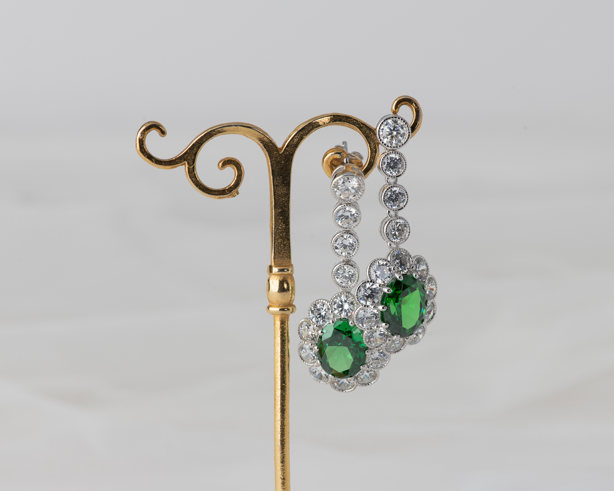 Pendientes de plata que capturan la elegancia de una de las joyas más icónicas del siglo XX: el anillo de compromiso que recibió la Princesa Diana. En su centro, una circonita verde, rodeada por un halo de circonitas que aportan luz y realzan su majestuosidad. Una joya que reinterpreta con sutileza el legado real.