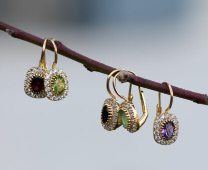 Estos pendientes, realizados en plata bañada en oro, celebran la belleza serena de las piedras naturales y la artesanía más cuidada. Cada par es una pequeña obra de arte que combina el brillo cálido del oro con el carácter único de las gemas, disponibles en cinco tonalidades encantadoras (de izquierda a derecha):