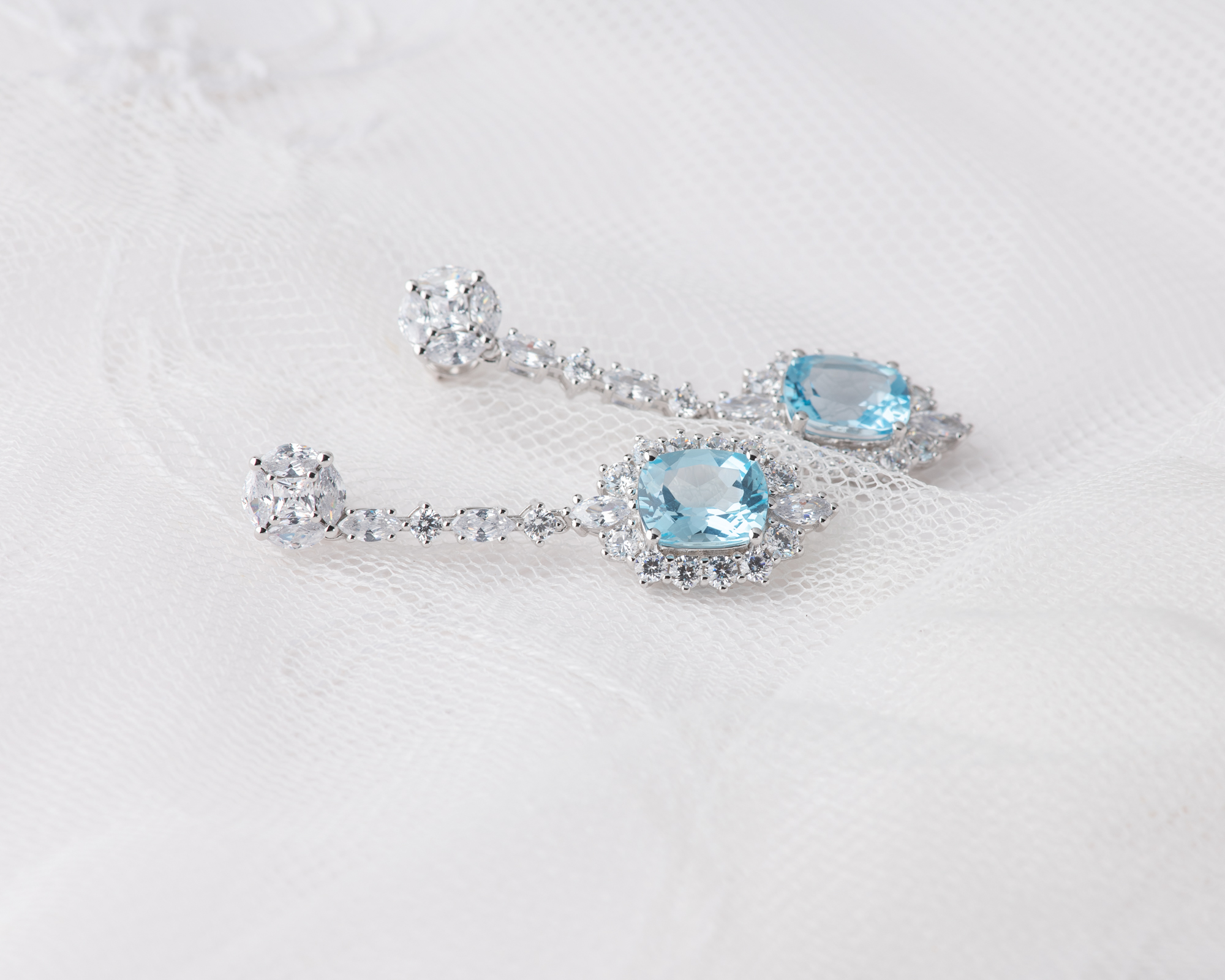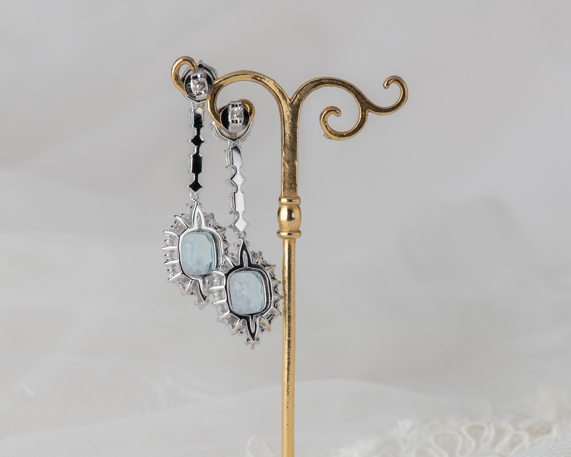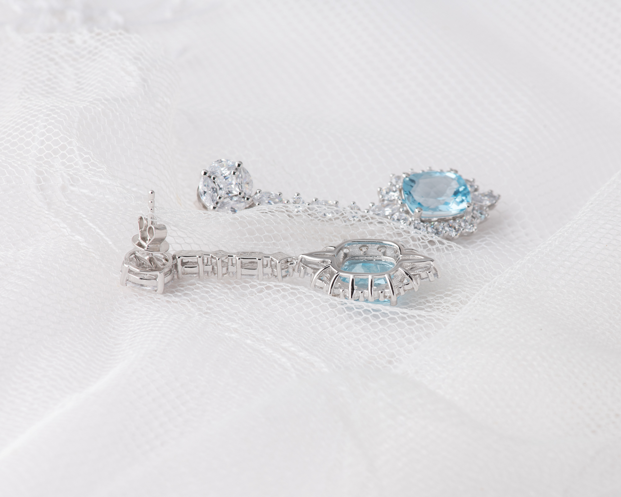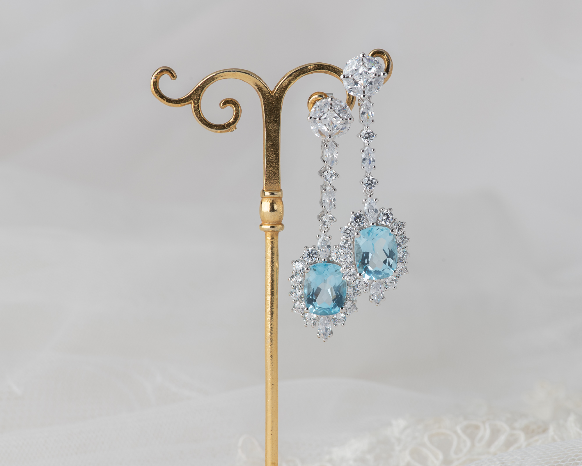 Inspirados en las líneas geométricas y la sofisticación del movimiento Art Déco, estos pendientes están realizados en plata con un delicado engaste de circonitas que aportan luz y equilibrio. En el centro, un topacio azul claro despliega su tonalidad profunda y elegante, evocando el lujo contenido de los años 20.