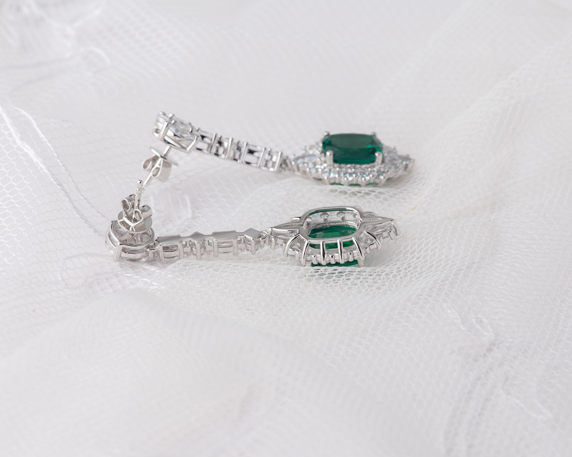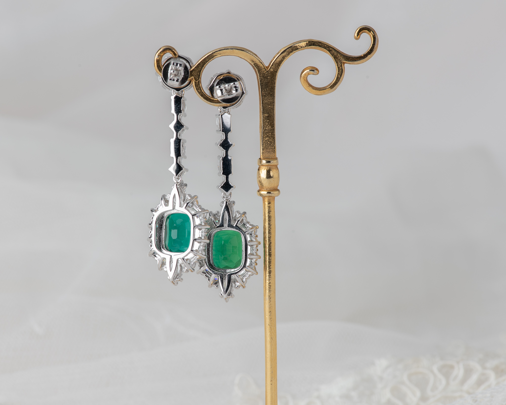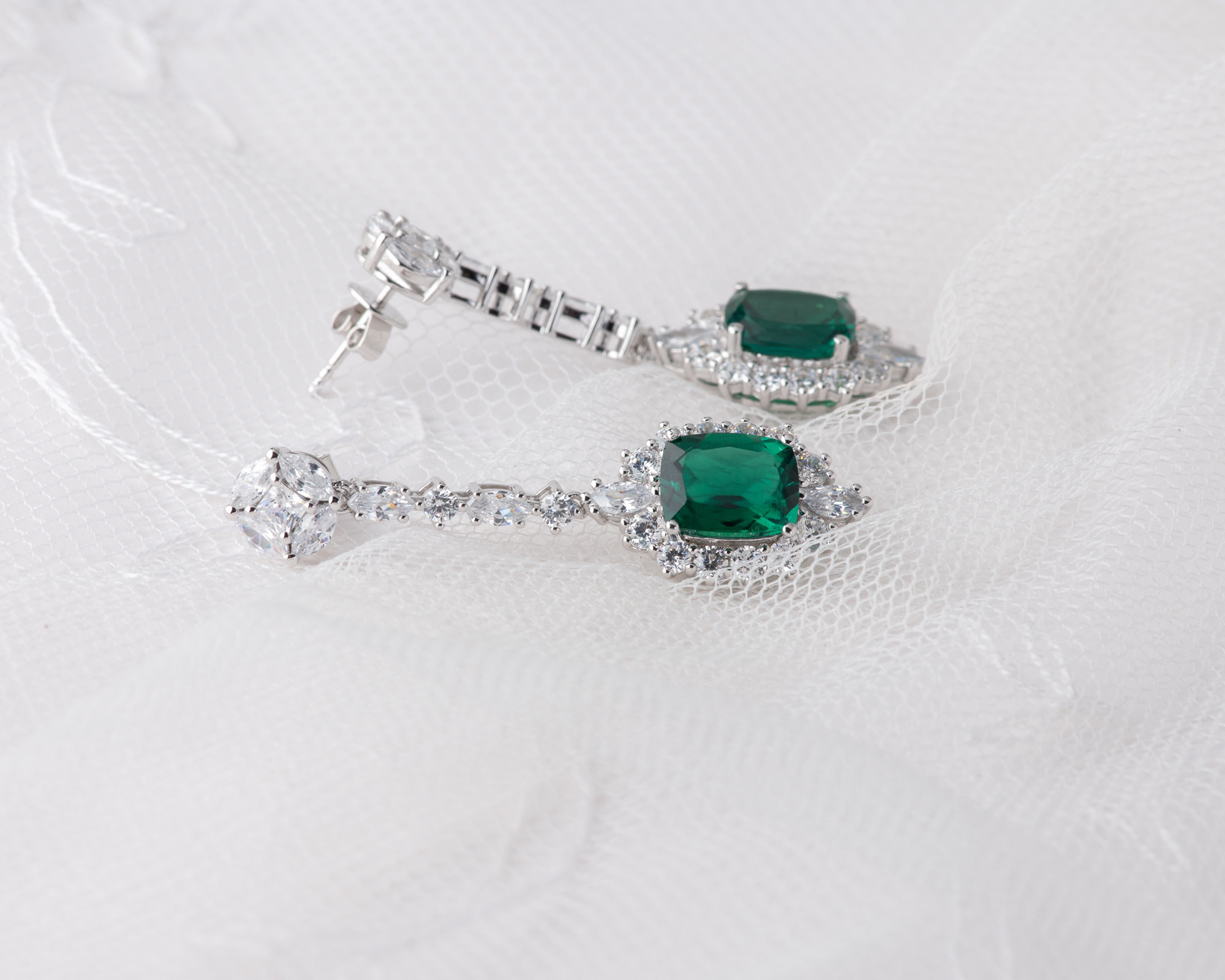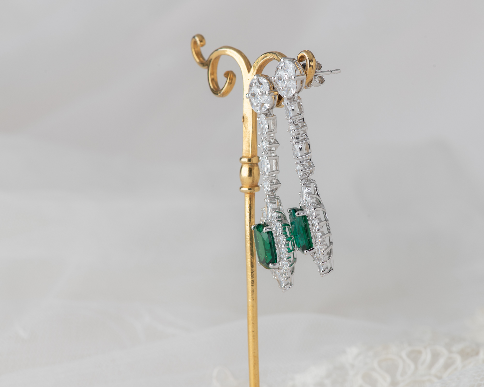 Inspirados en las líneas geométricas y la sofisticación del movimiento Art Déco, estos pendientes están realizados en plata con un delicado engaste de circonitas que aportan luz y equilibrio. En el centro, una esmeralda de Zambia de laboratorio verde despliega su tonalidad profunda y elegante, evocando el lujo contenido de los años 20.