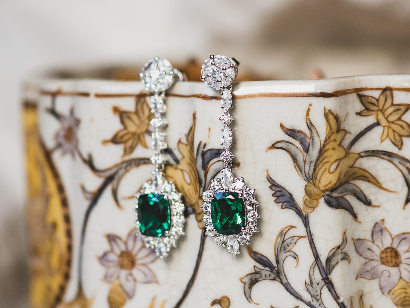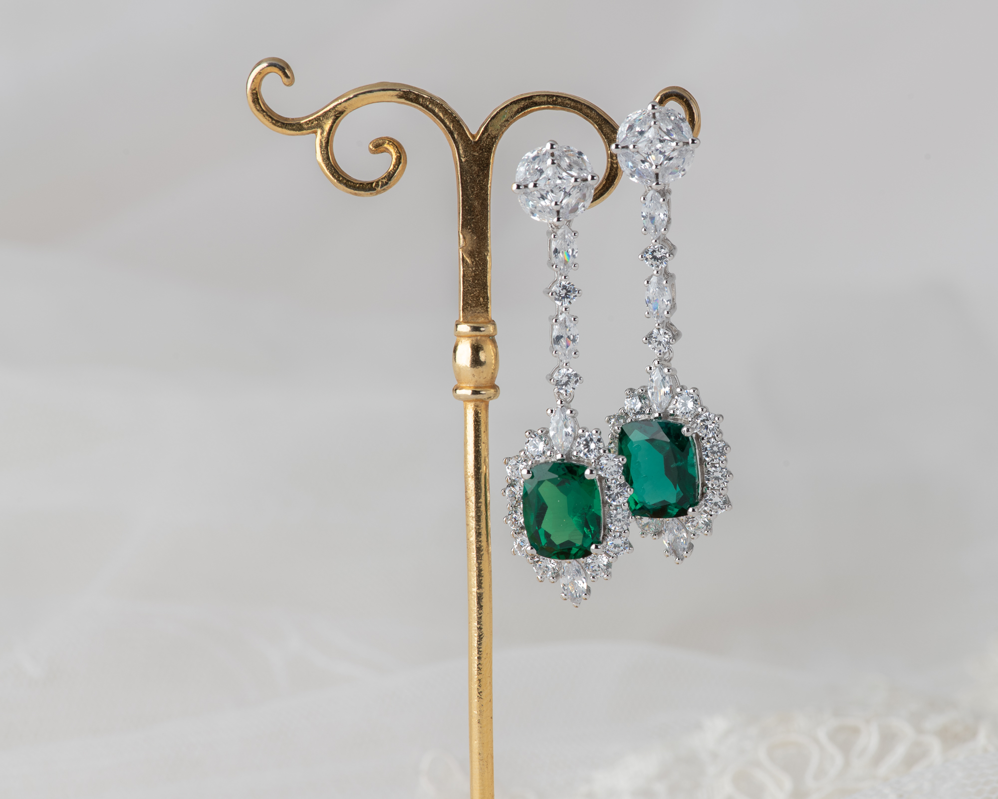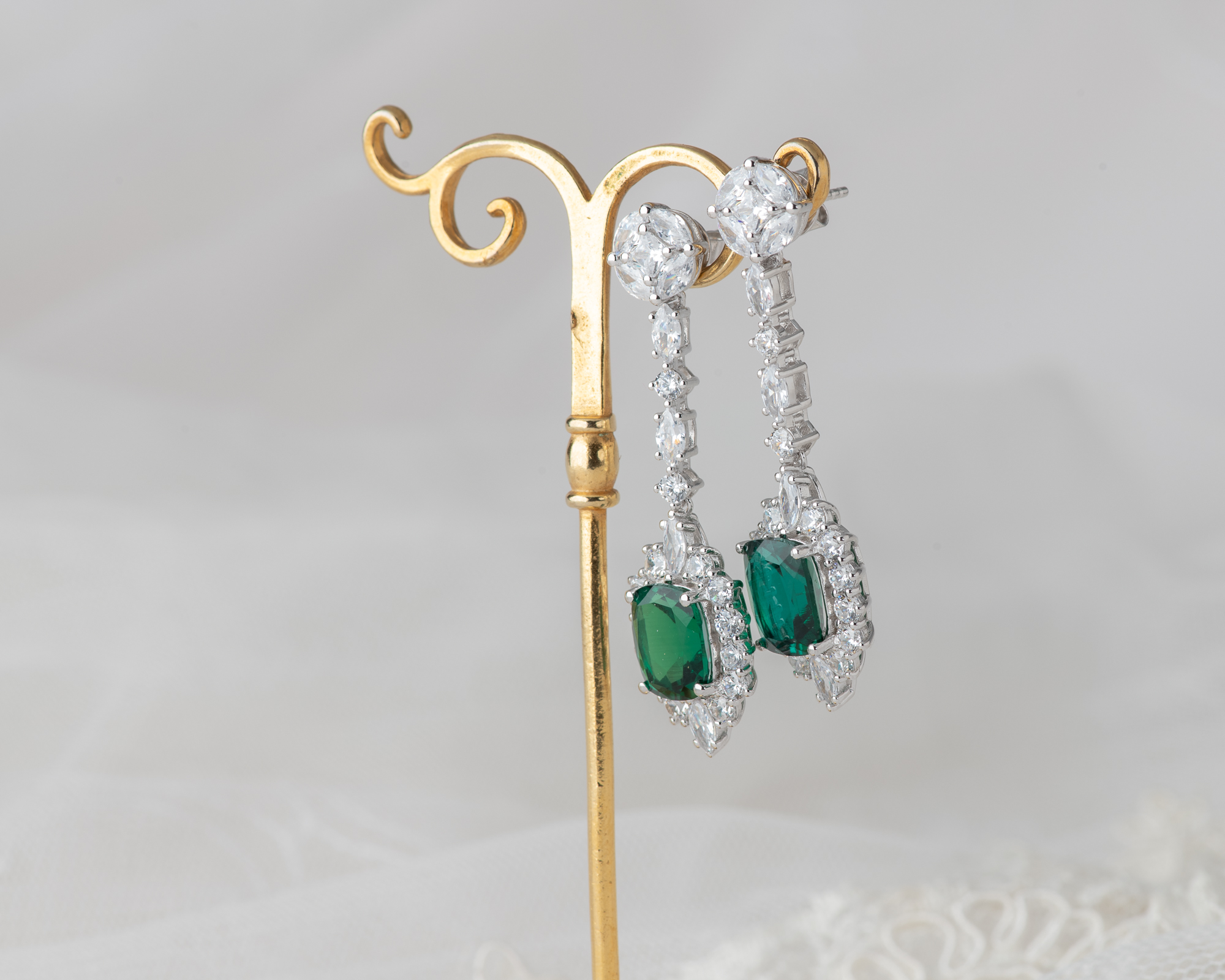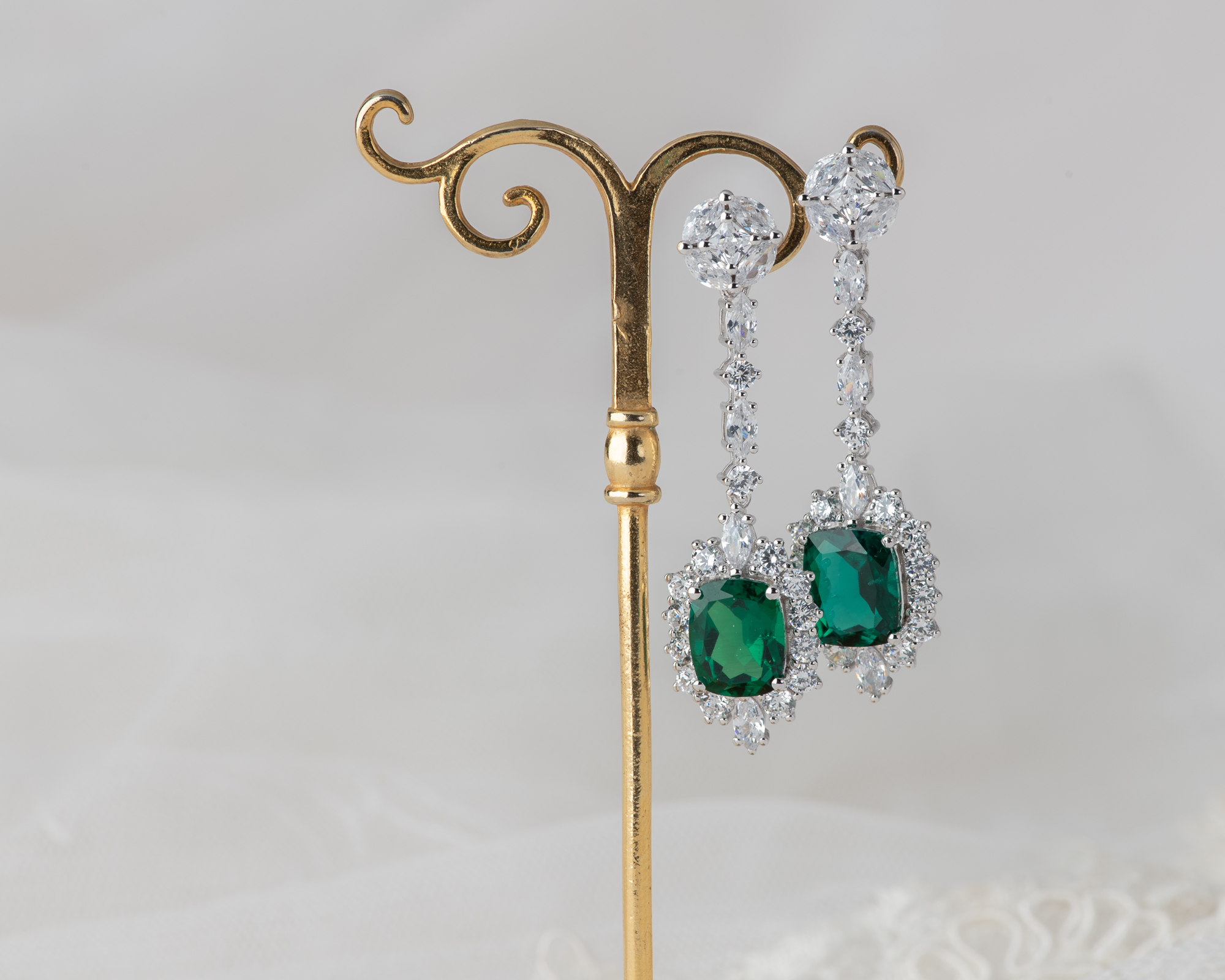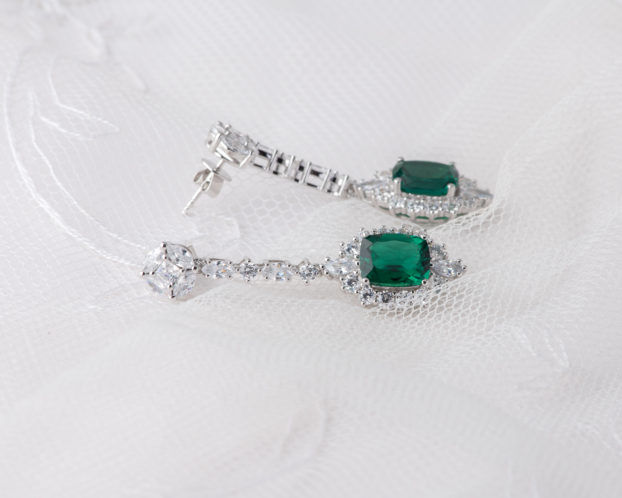 Inspirados en las líneas geométricas y la sofisticación del movimiento Art Déco, estos pendientes están realizados en plata con un delicado engaste de circonitas que aportan luz y equilibrio. En el centro, una esmeralda de Zambia de laboratorio verde despliega su tonalidad profunda y elegante, evocando el lujo contenido de los años 20.