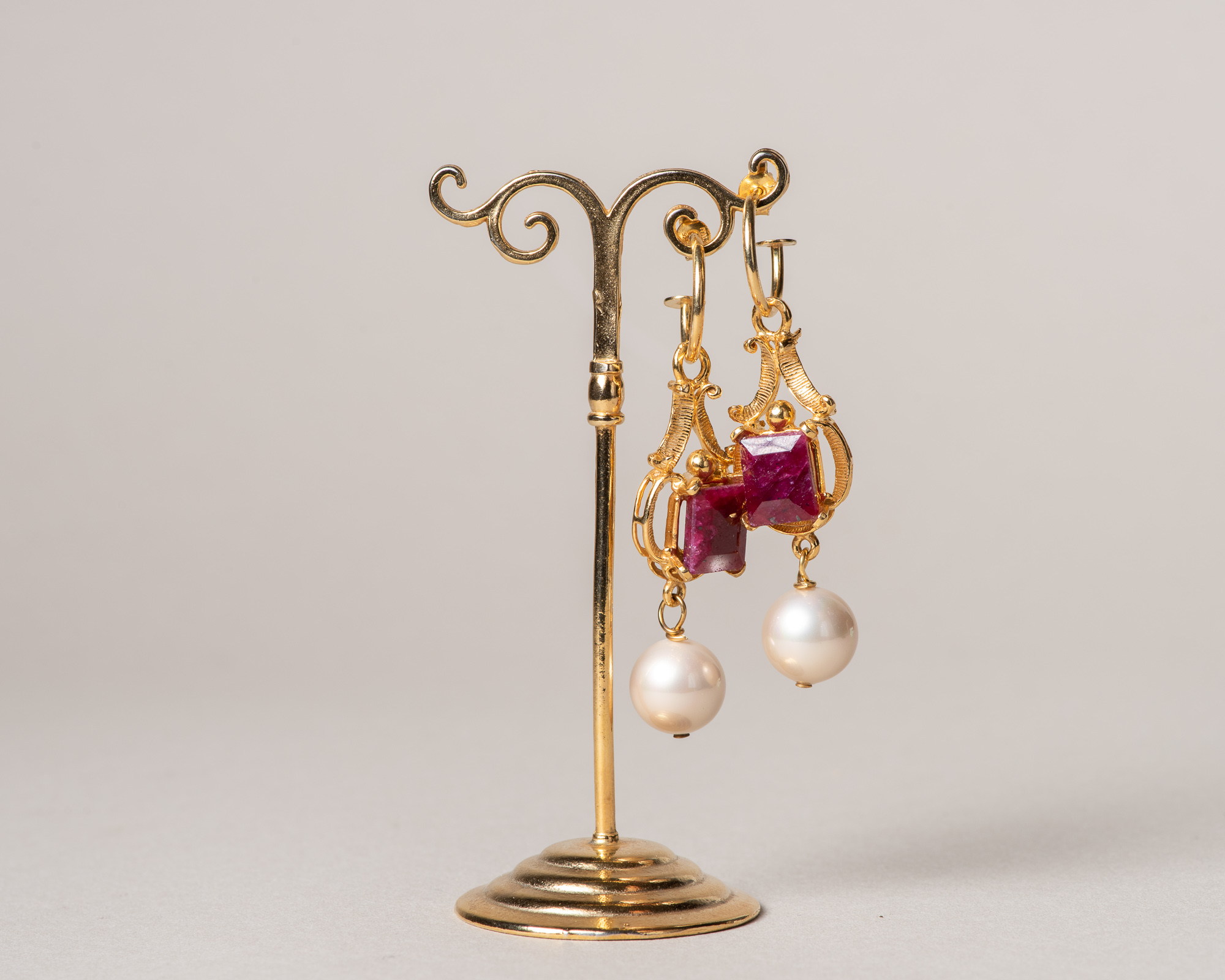 Pendientes realizados a mano por maestros orfebres en plata dorada con una piedra natual de rubí y perla de agua dulce.