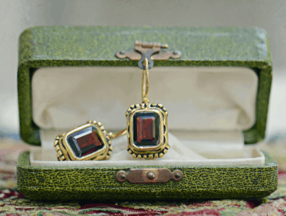Los pendientes Lucrezia Panciatichi están inspirados en el anillo que ella misma luce en este retrato de la época de El Renacimiento. Están hechos totalmente a mano por un maestro orfebre, en plata dorada con una piedra de granate engastada en el centro.