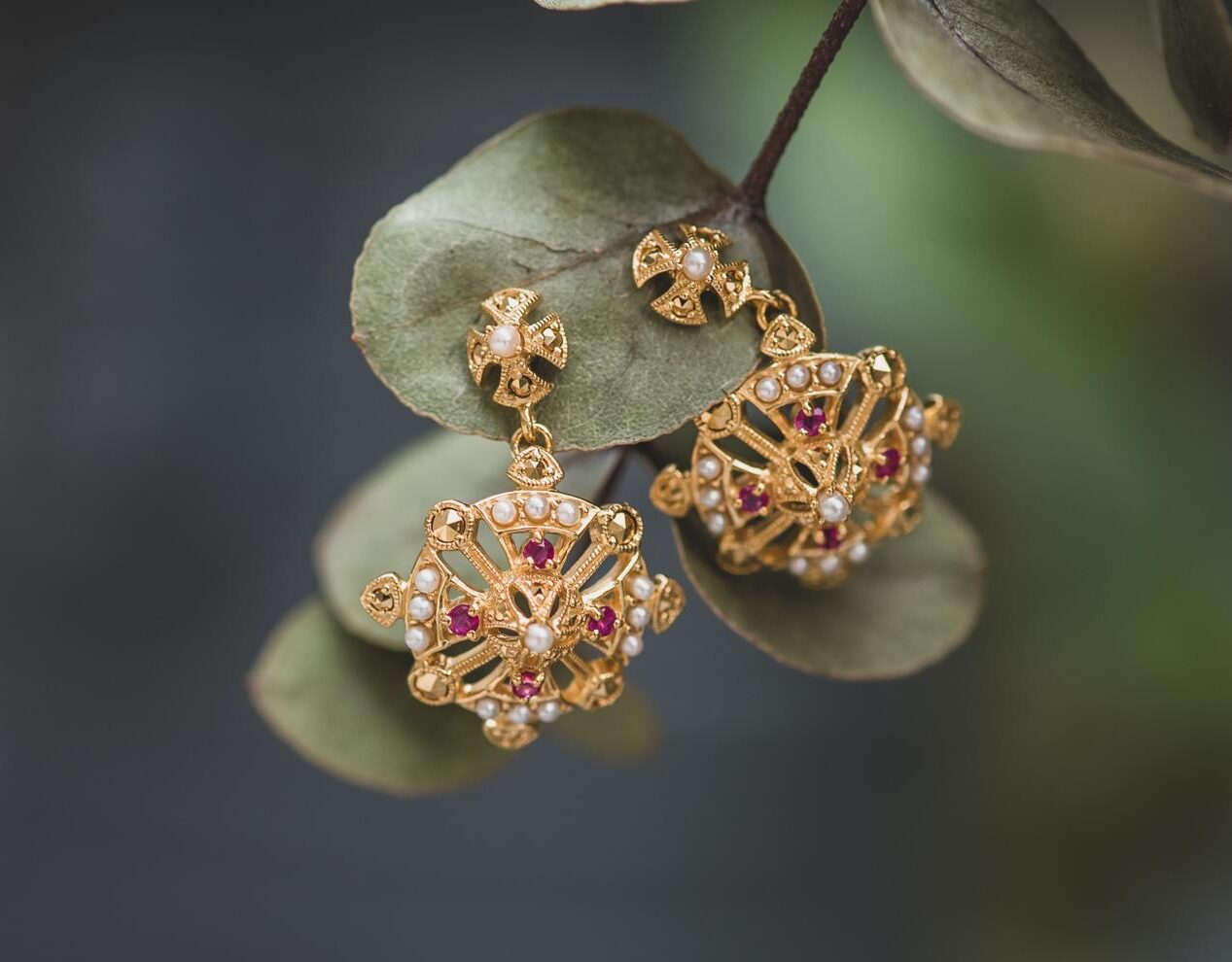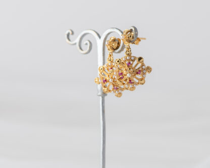 Estos pendientes en plata bañada en oro deslumbran con un diseño ornamental de inspiración antigua, donde pequeñas perlas de agua dulce se combinan armoniosamente con rubíes naturales de intenso color. El trabajo en marcasitas aporta un brillo sutil que realza la riqueza del conjunto, evocando la elegancia de la joyería decimonónica. Su forma simétrica y ligeramente colgante añade movimiento y sofisticación.