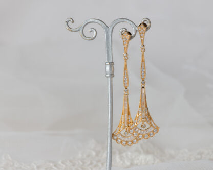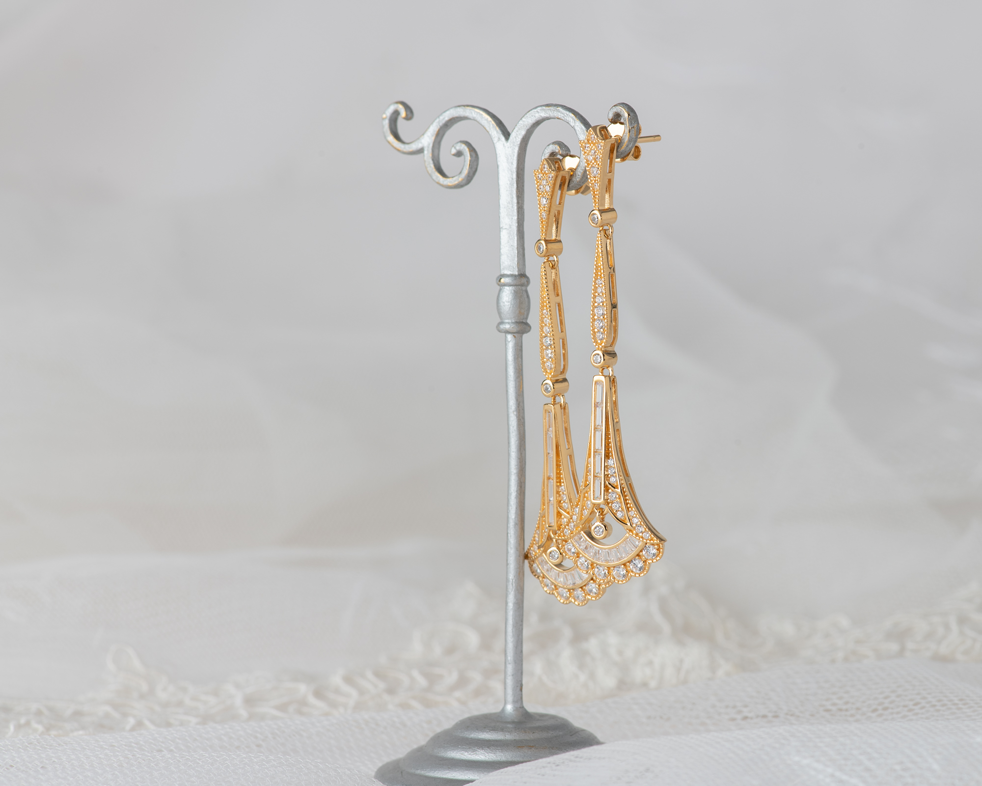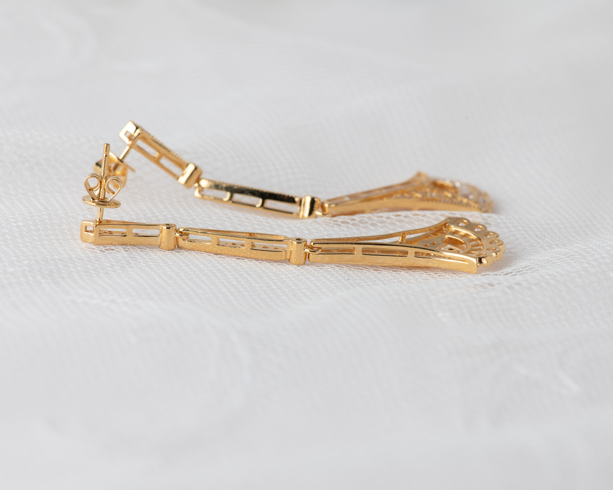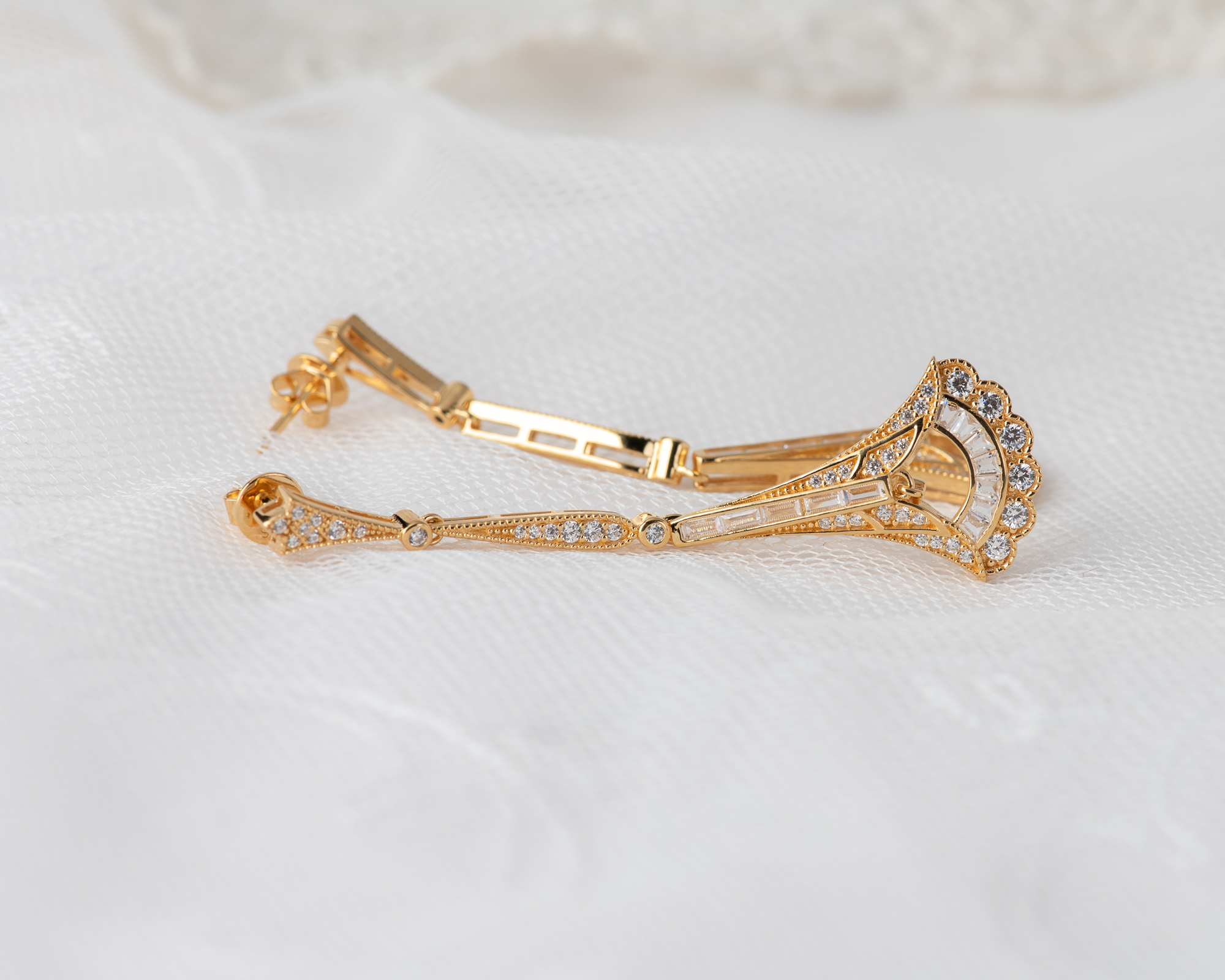 Estos pendientes capturan el refinamiento del Art Decó de los años 20 y 30, símbolo de modernidad y belleza geométrica. Inspirados en el popular modelo «ojo de perdiz», están realizados en plata bañada en oro con circonitas blancas.