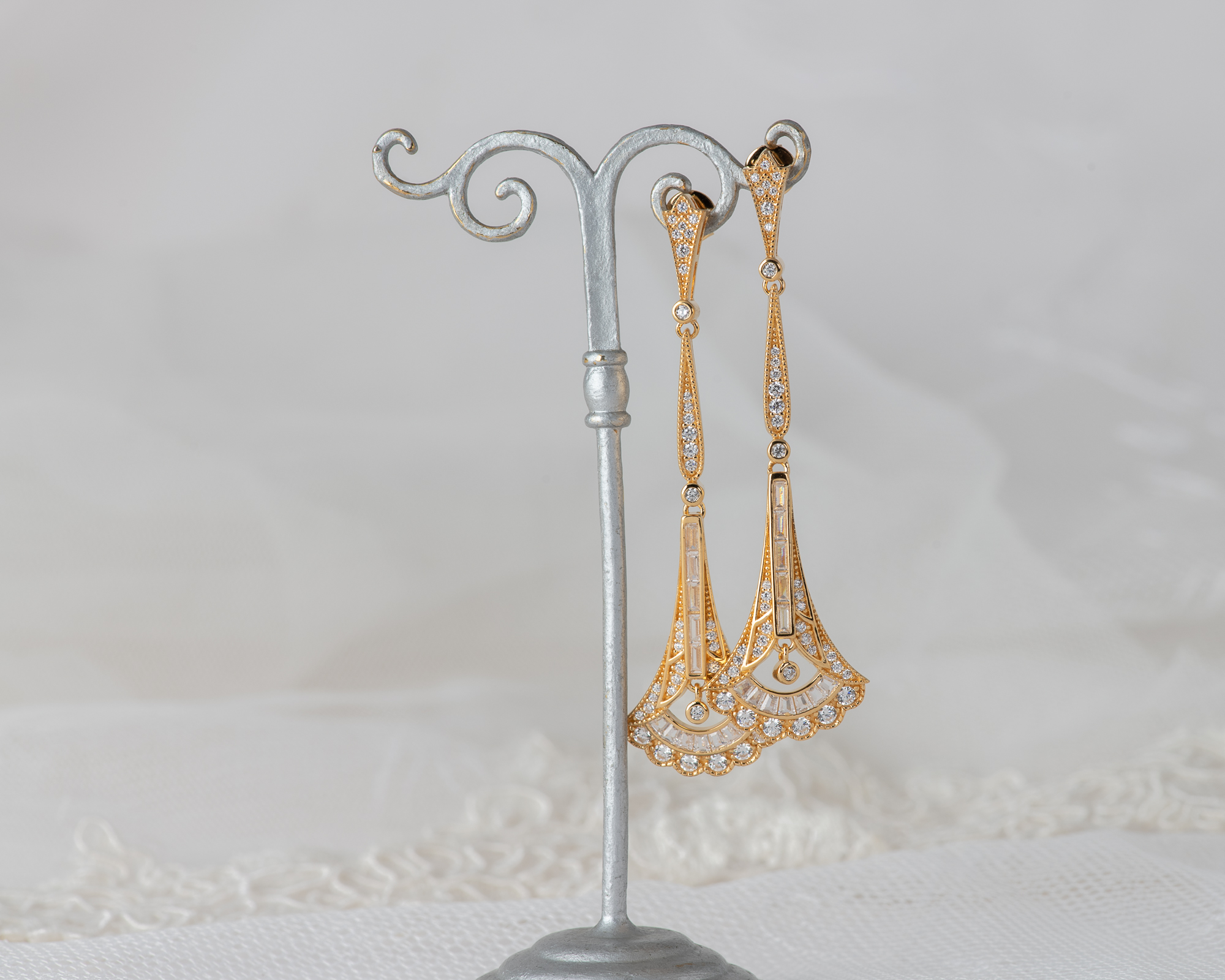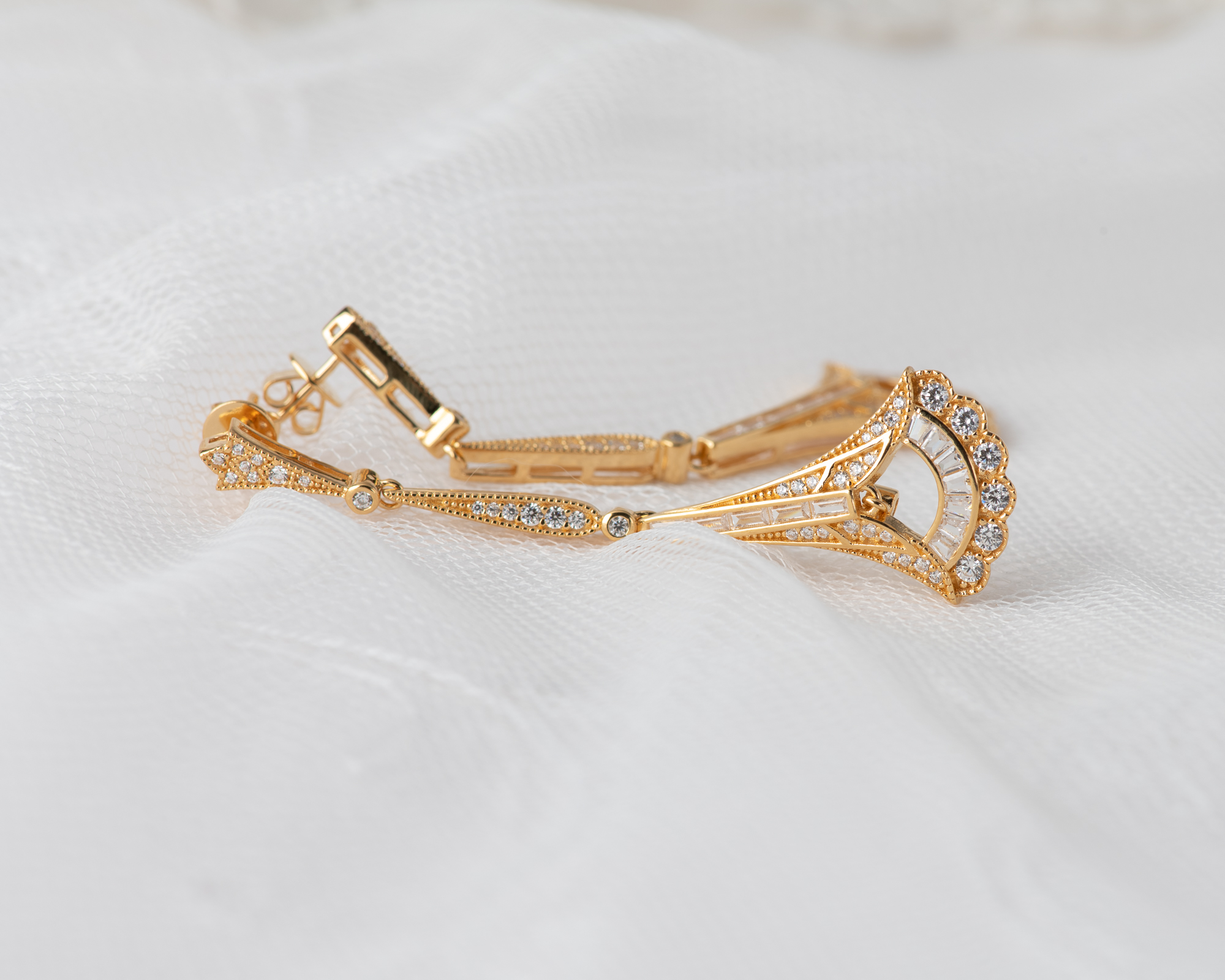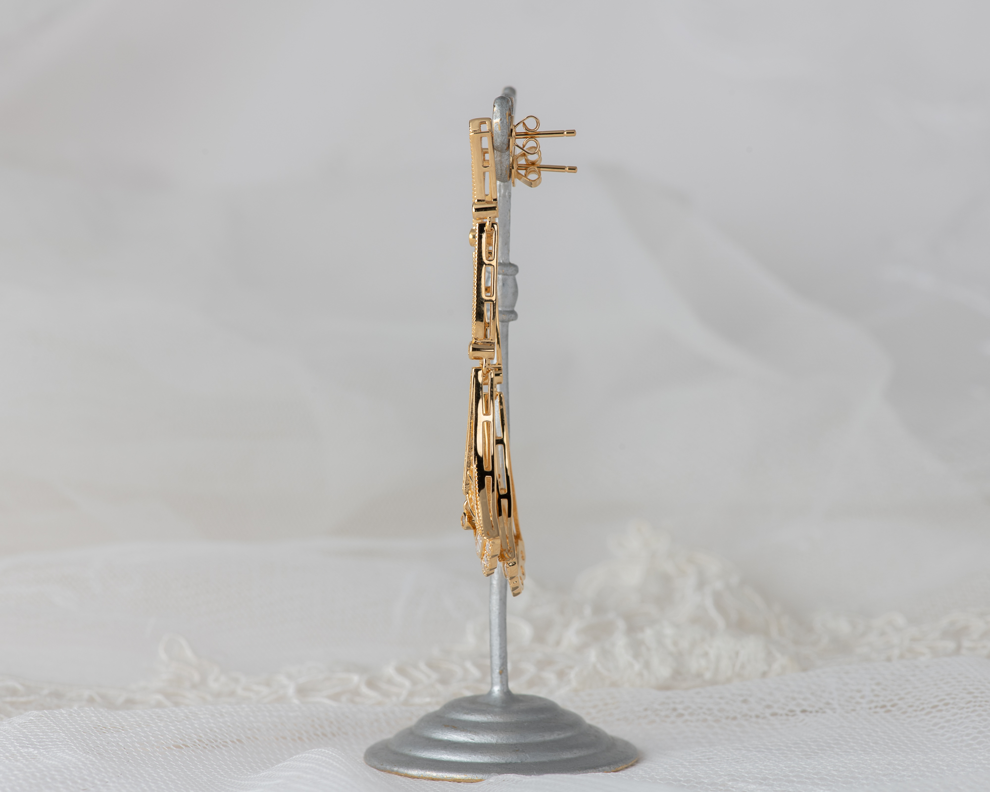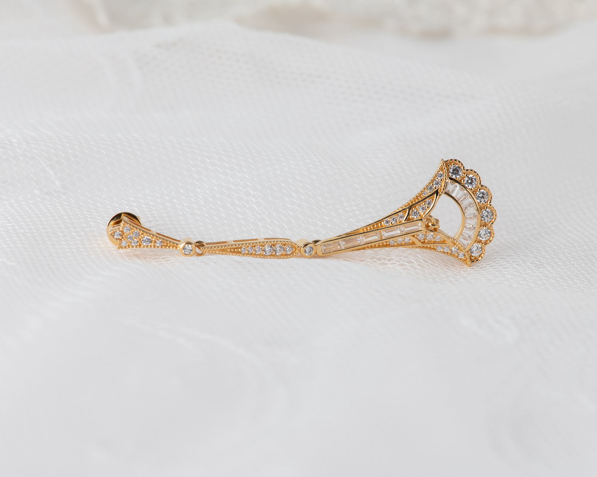 Estos pendientes capturan el refinamiento del Art Decó de los años 20 y 30, símbolo de modernidad y belleza geométrica. Inspirados en el popular modelo «ojo de perdiz», están realizados en plata bañada en oro con circonitas blancas.