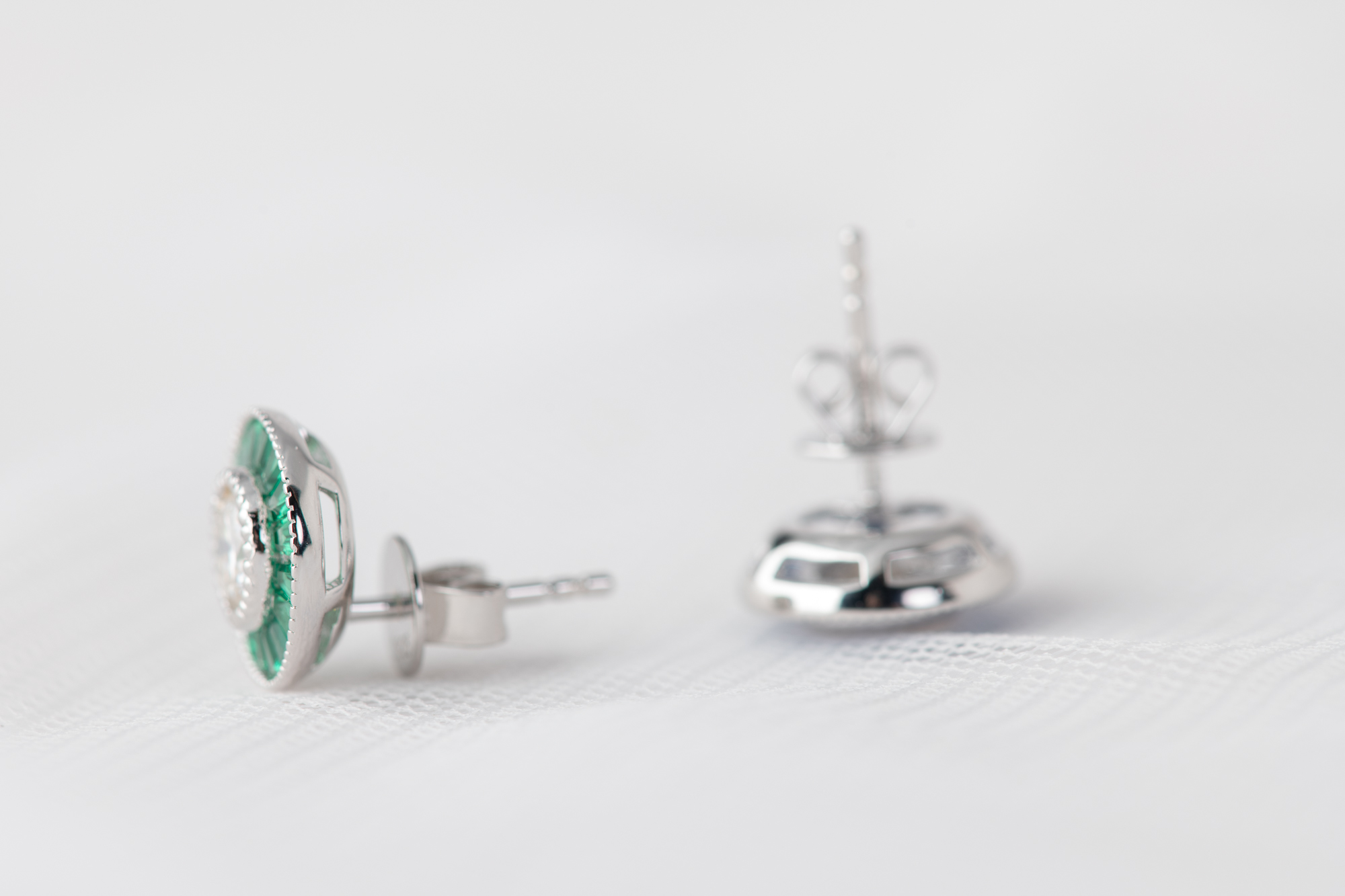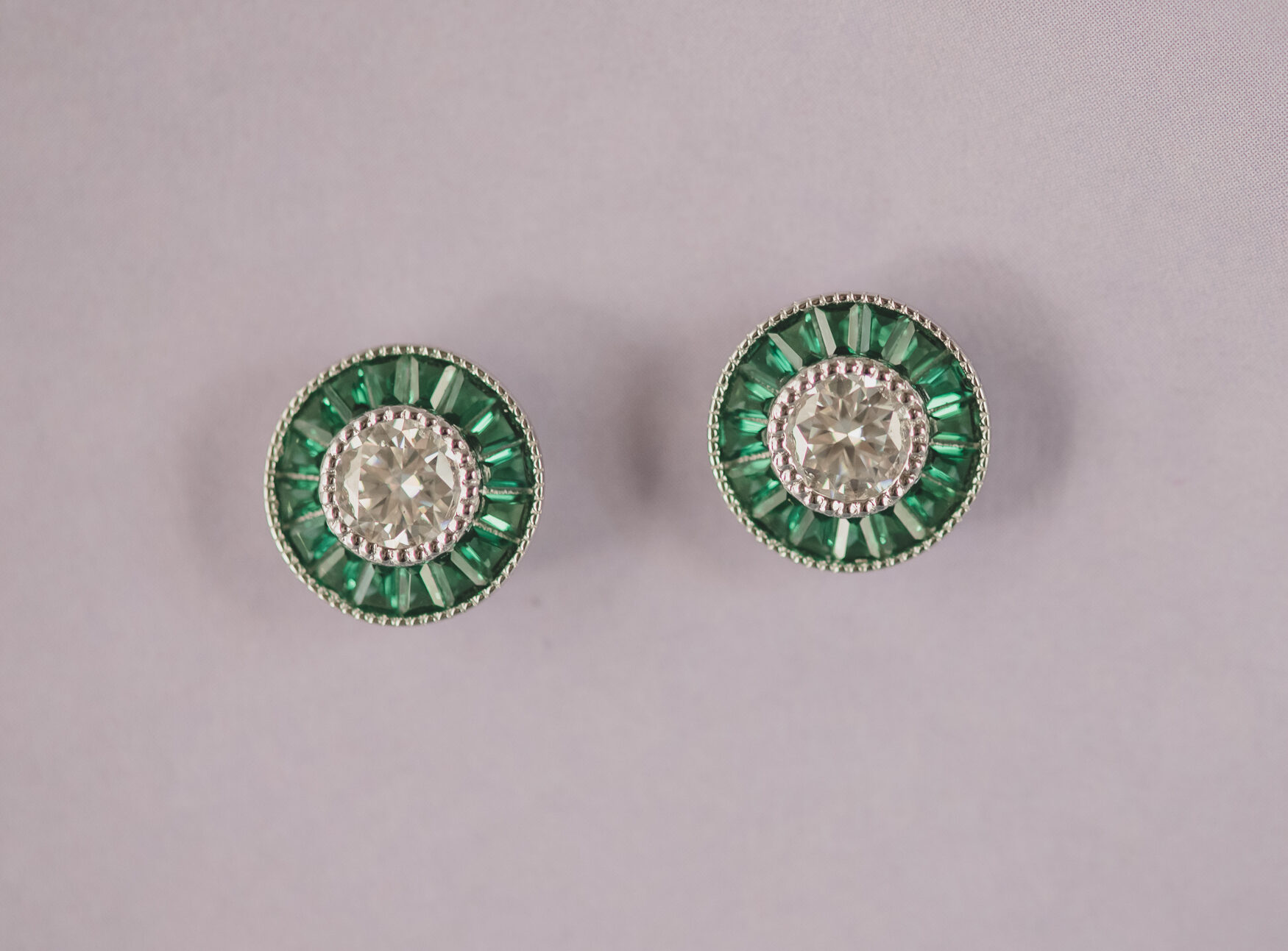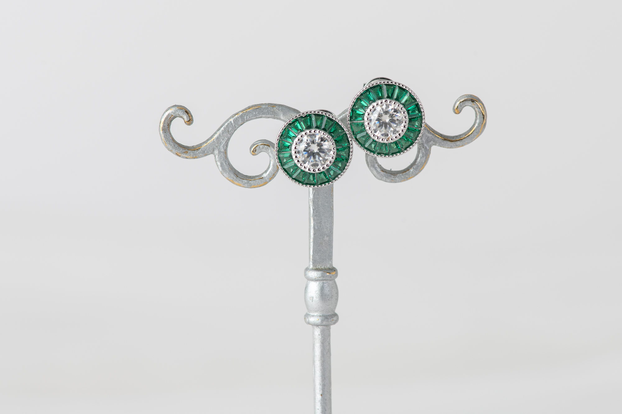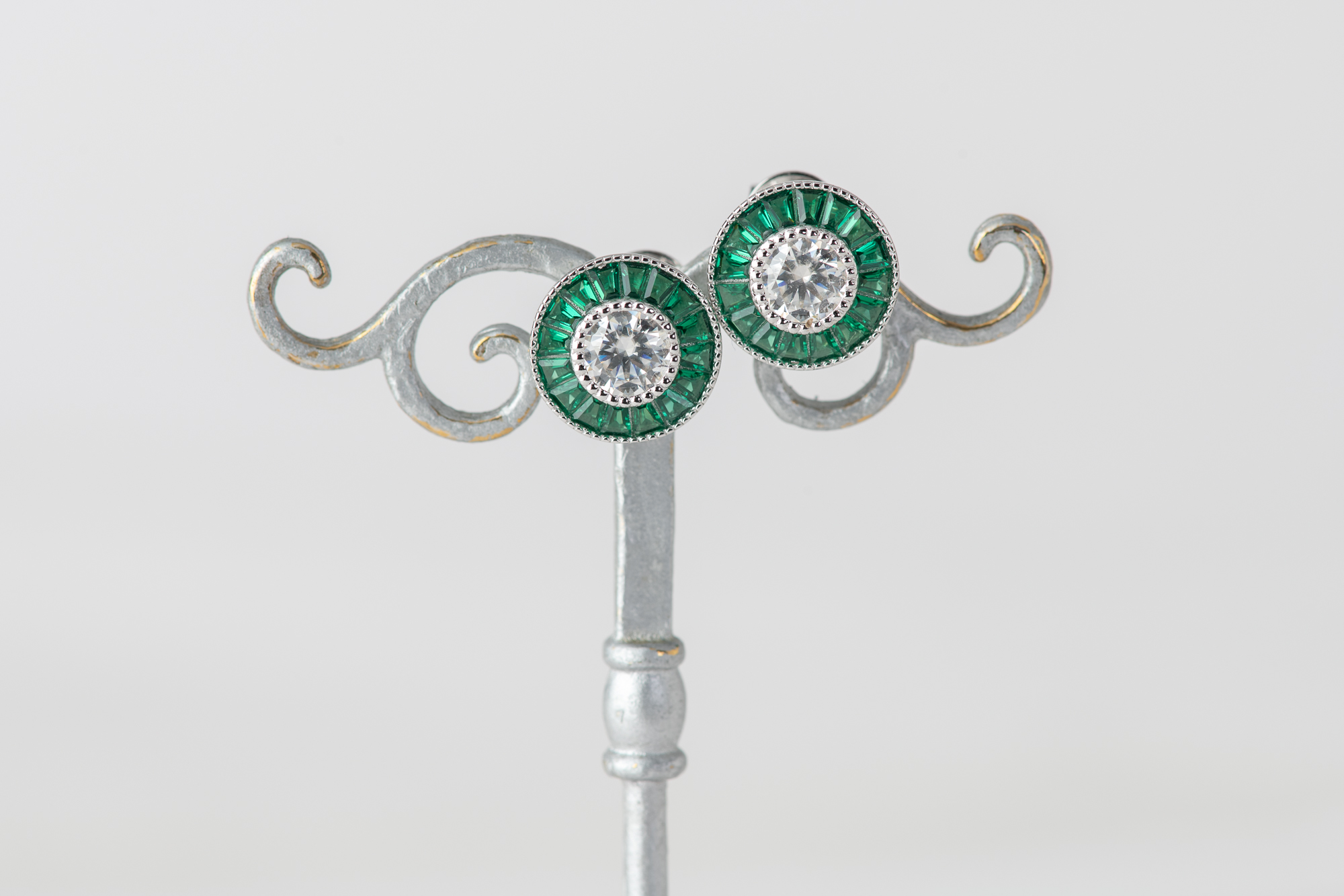 Pendientes estilo Ojo de Perdiz realizados en plata, con una moissanita central de 3 mm que despliega un brillo profundo y sofisticado. A su alrededor, un halo de circonitas verdes intensifica su luz, creando un efecto de pureza y armonía visual. Una joya discreta pero llena de carácter, perfecta para iluminar el rostro.