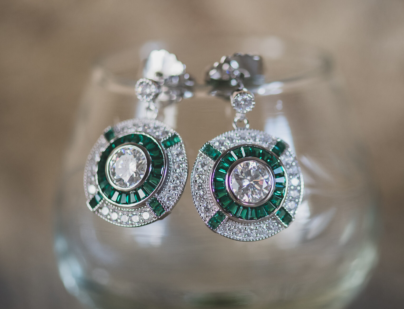 Pendientes ojo de perdiz realizados en plata con una moissanita central de 5 mm, rodeado de circonitas blancas y verdes.