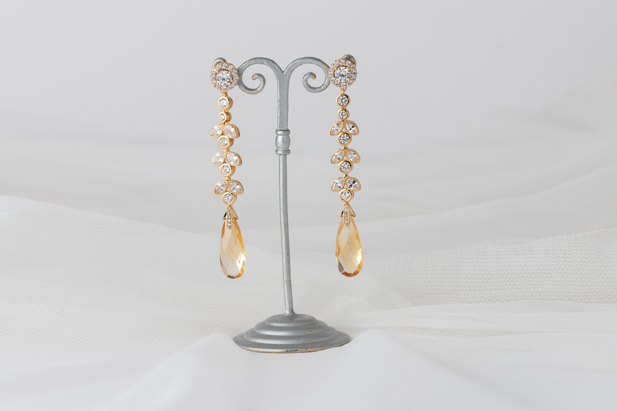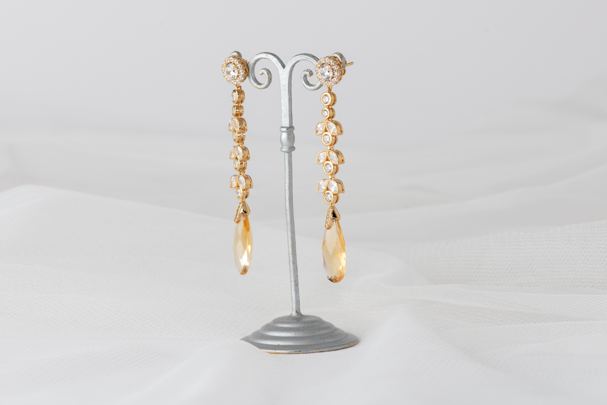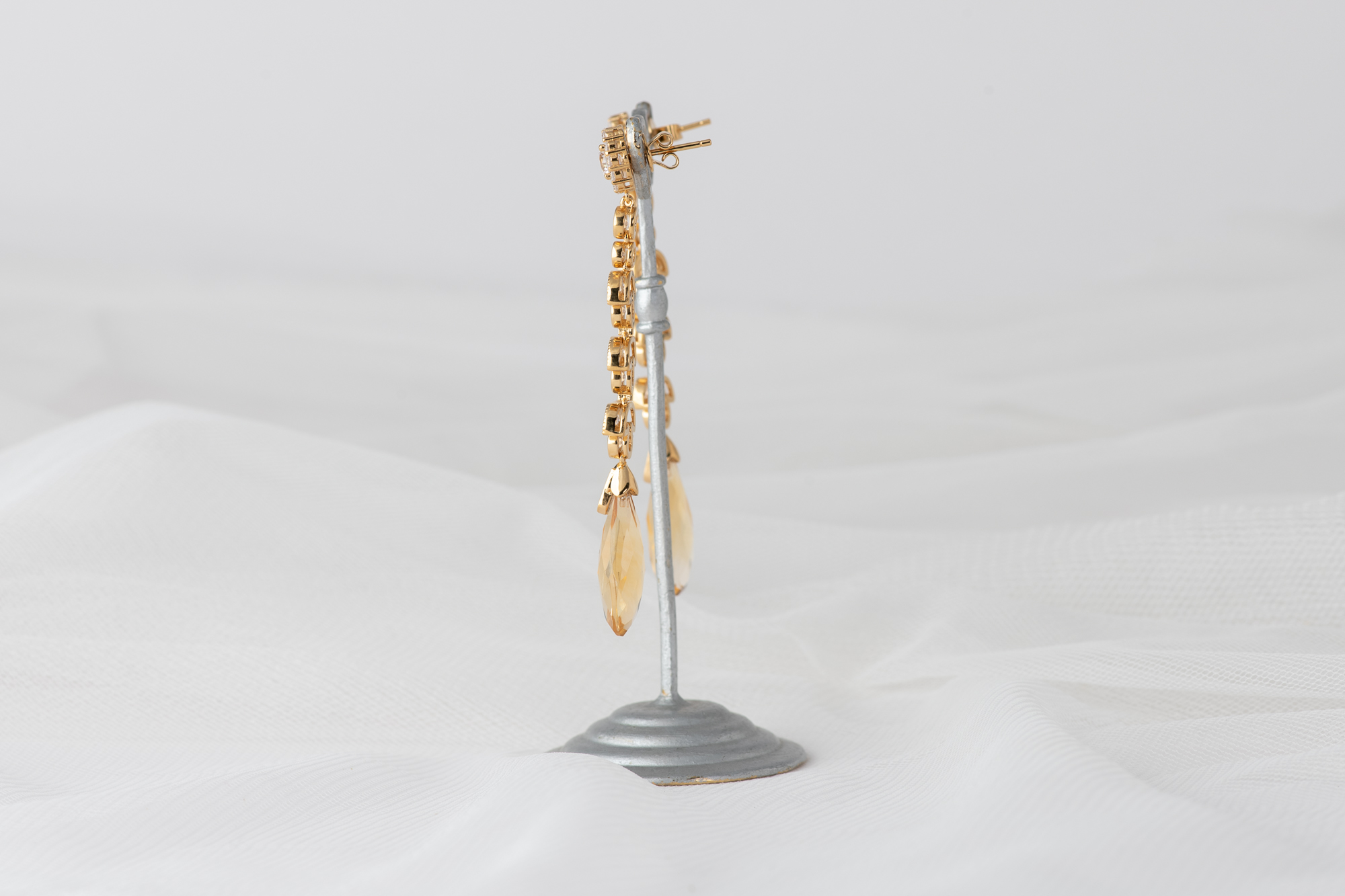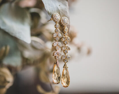 Pendientes cuidadosamente elaborados en plata bañada en oro, con una piedra central de moissanita. El diseño se enriquece con un delicado engaste de circonitas que acentúan su luz, culminando en dos majestuosos citrinos naturales de un intenso tono amarillo.