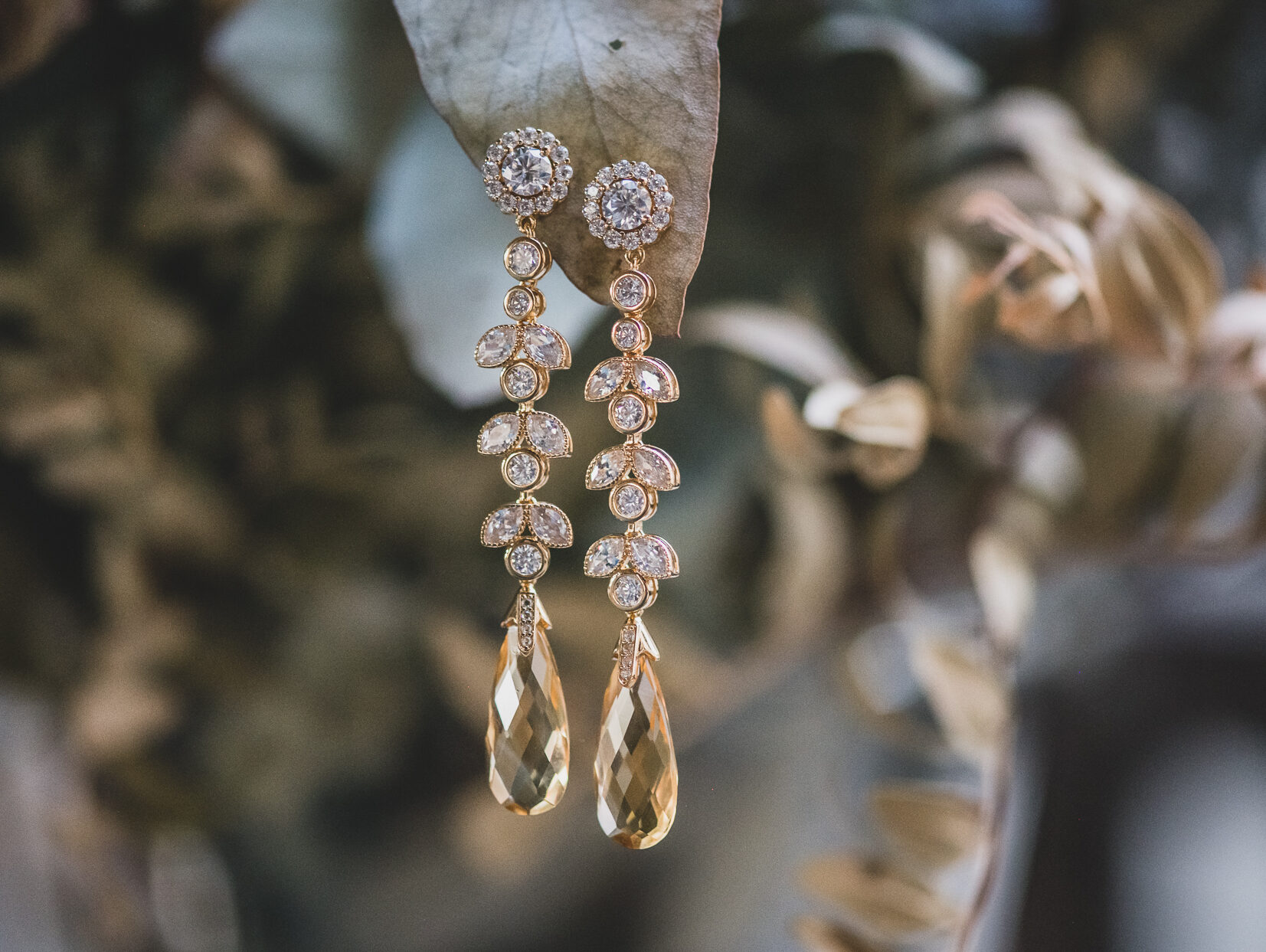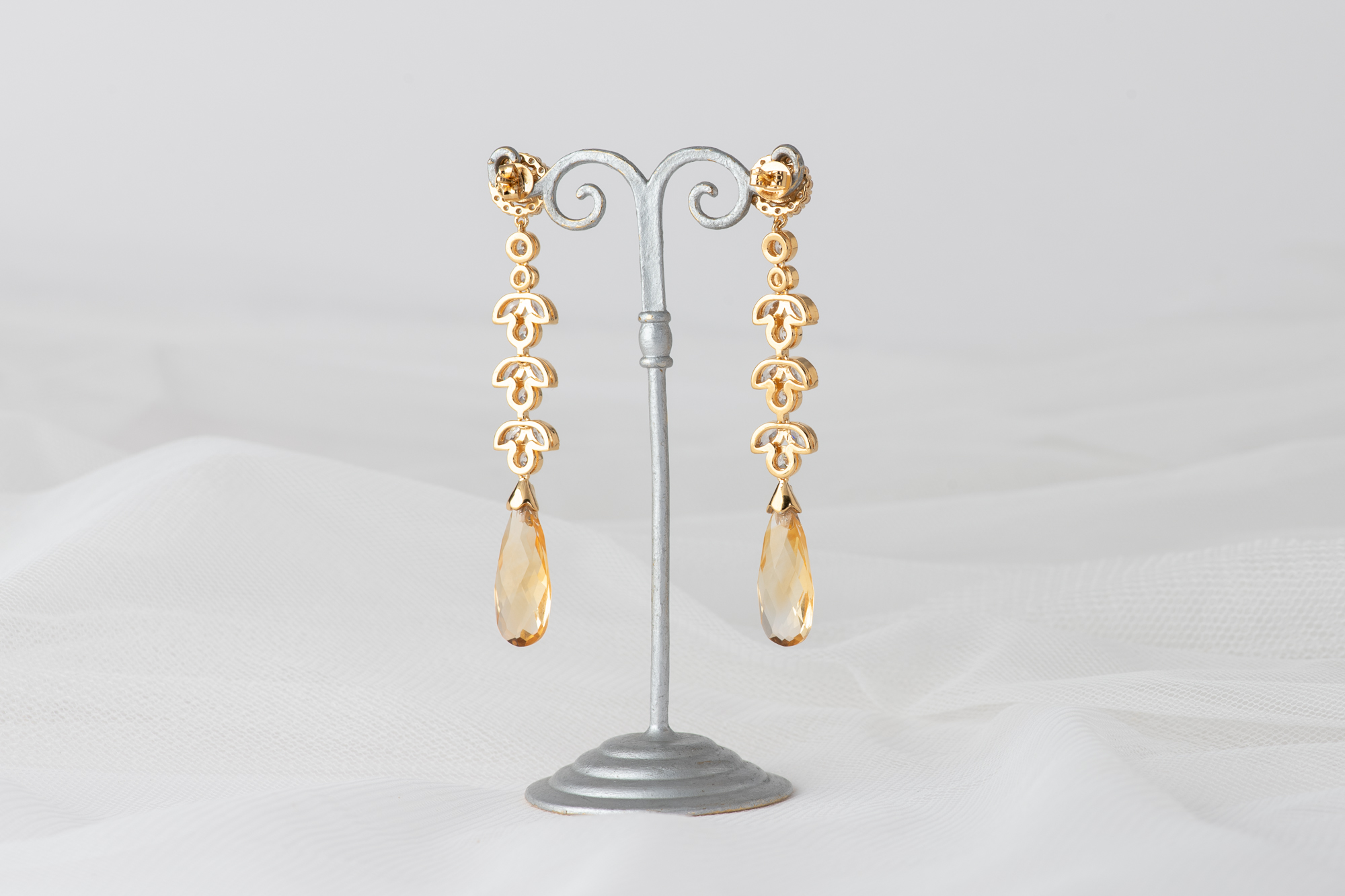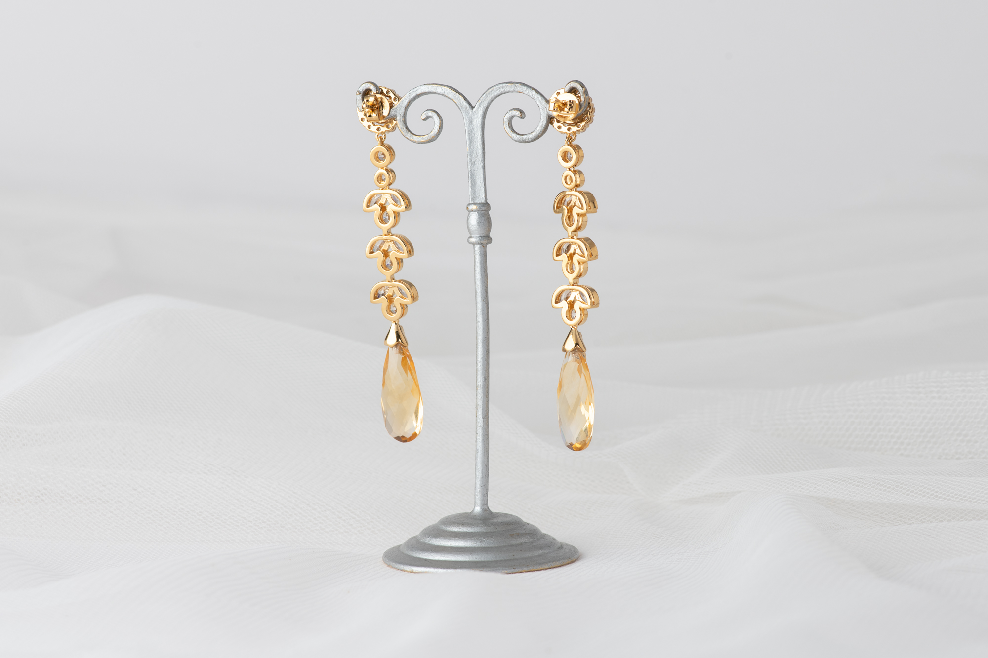 Pendientes cuidadosamente elaborados en plata bañada en oro, con una piedra central de moissanita. El diseño se enriquece con un delicado engaste de circonitas que acentúan su luz, culminando en dos majestuosos citrinos naturales de un intenso tono amarillo.