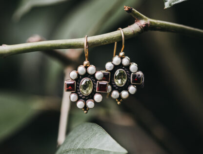 Pendientes de plata dorada con peridoto, granates y perlas de agua dulce